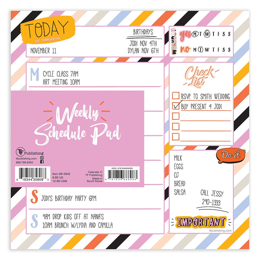 Staying organized is a snap with this fun and funky 7.75" x 7.75" weekly, open dated memo mouse pad. Jot down your weekly schedule on the daily, weekly segments and your daily notes, then tear it off and start anew the next week. The desk pad is perfect for your desk, kitchen counter and can also double as a mouse pad. The pad has 52 tear-off, perpetual, weekly sheets for you to track all your appointments and to dos. Comes packaged in shrink wrap.