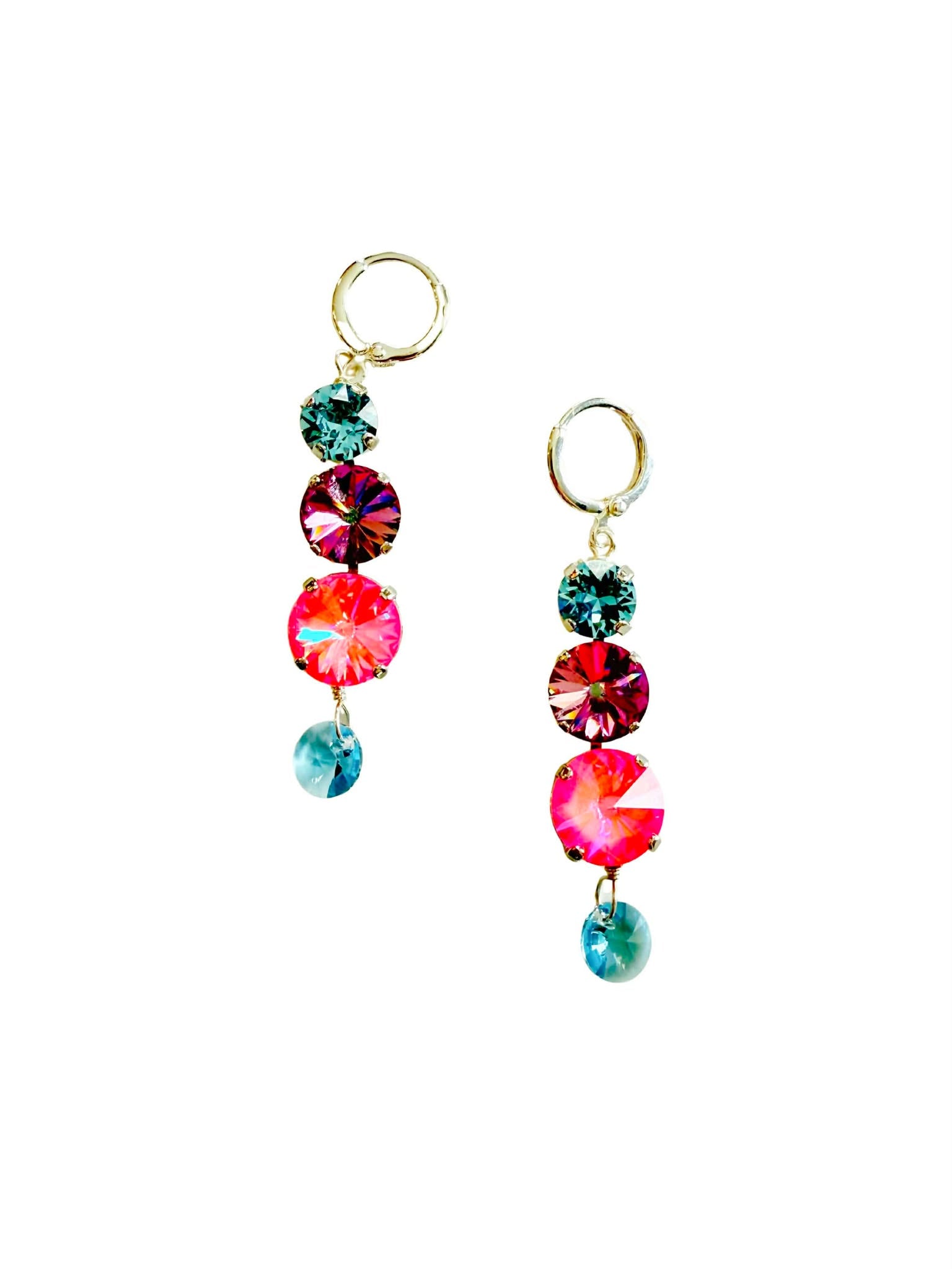 Pop Of Color Earrings set into Shiny Silver Metal with Crystals in Aqua, Passion, Ultra Light Pink.