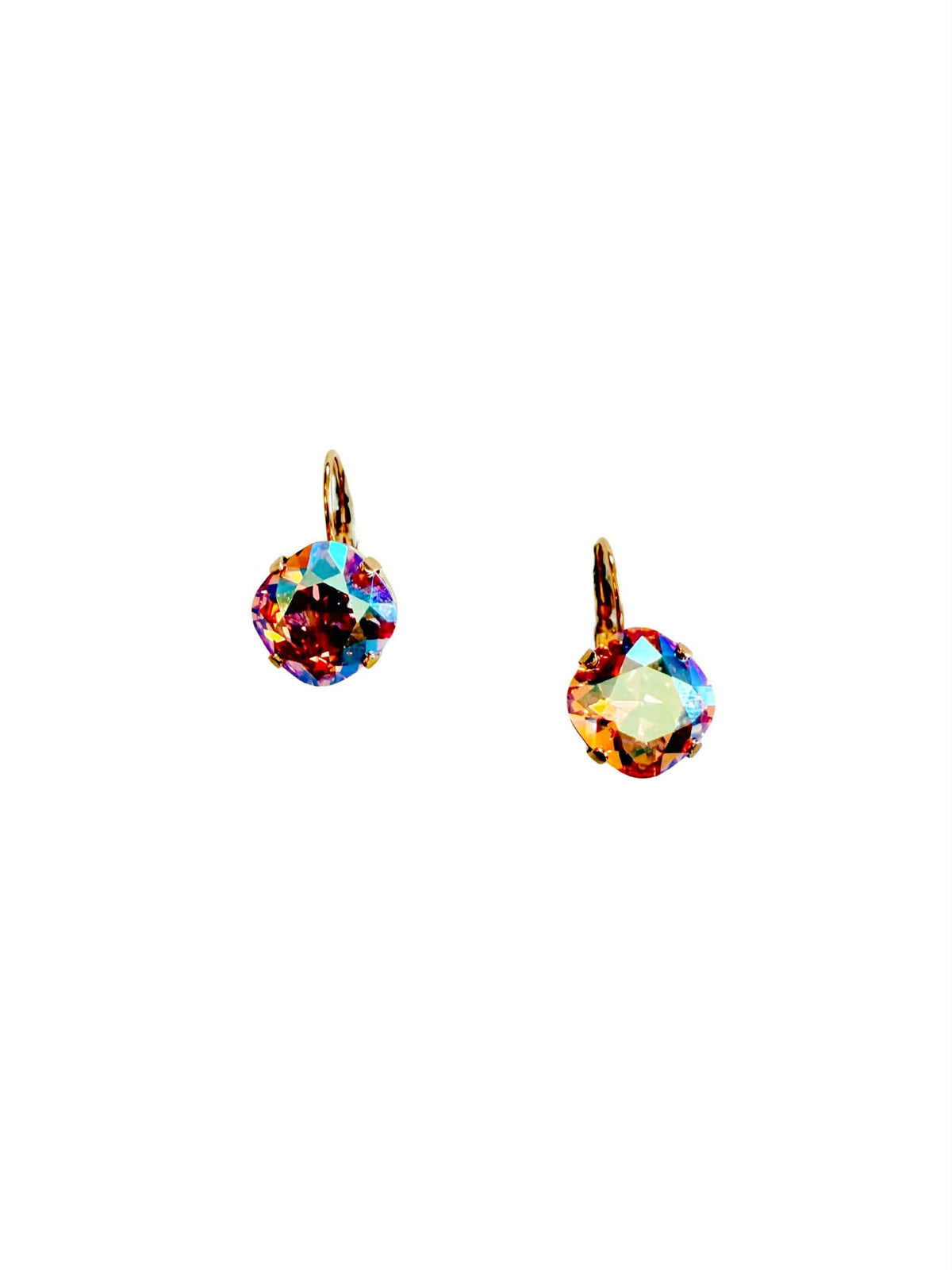 12mm Square Cushion Cut Drop Earrings set into Rose Gold Metal with Light Rose AB