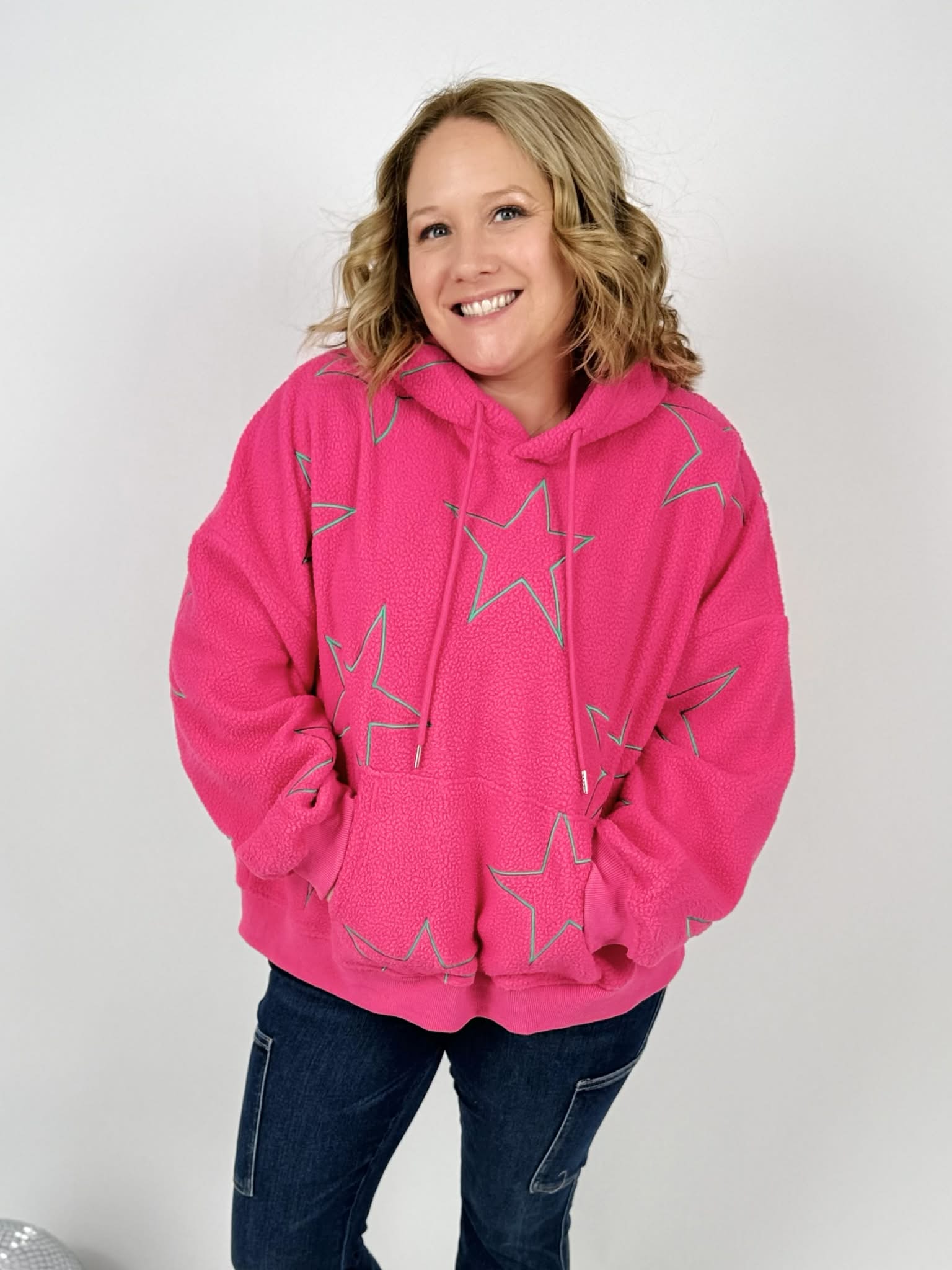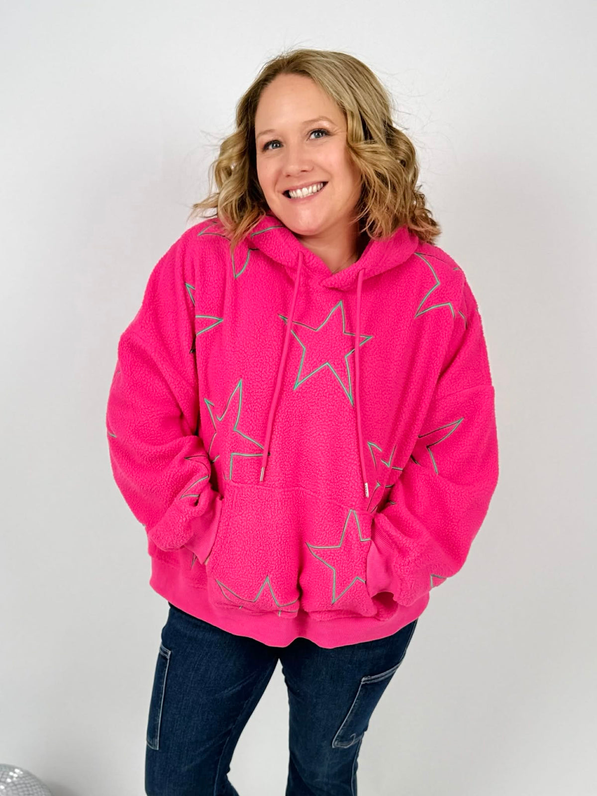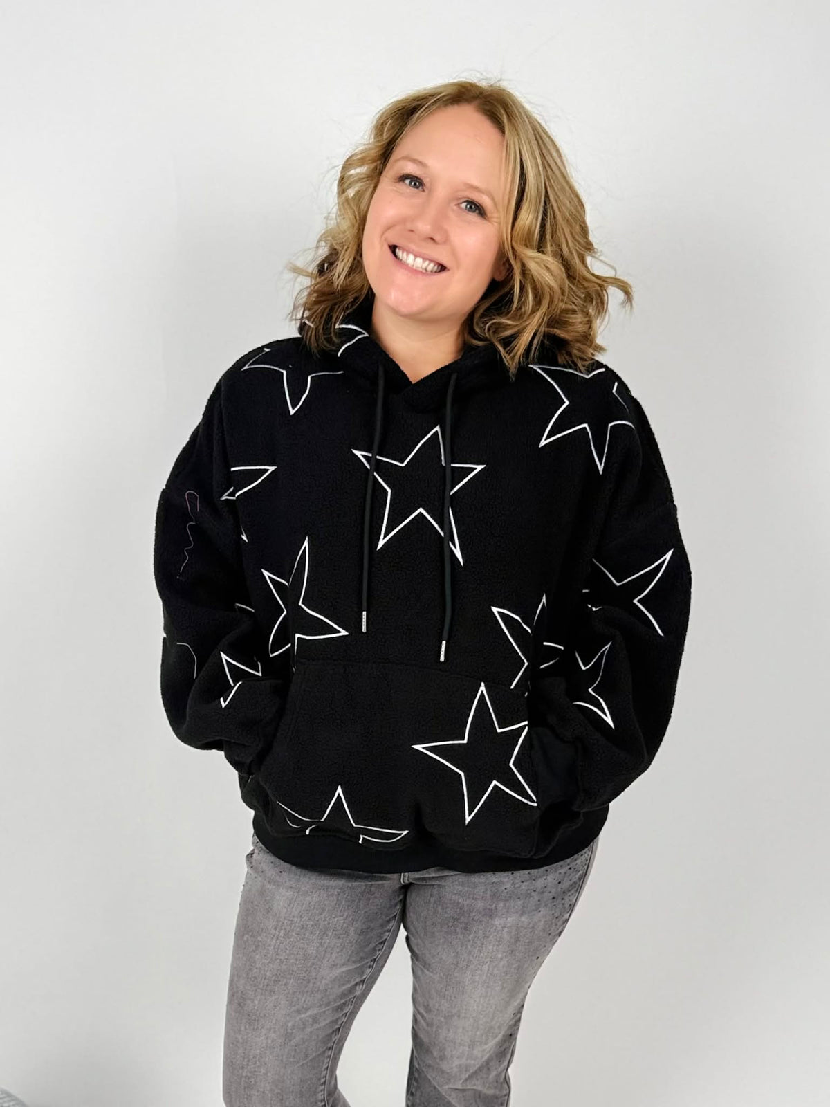 Cozy up in the Twinkle Twinkle Hoodie, featuring an allover star pattern that adds whimsy to your look. Made from soft sherpa fabric, this hoodie offers a relaxed, loose fit with dropped shoulders for effortless comfort. Stay warm with the adjustable hood and kangaroo pocket, while the banded hem keeps everything snug. Perfect for lounging or casual outings, this playful hoodie brings a sprinkle of magic to your everyday wardrobe.