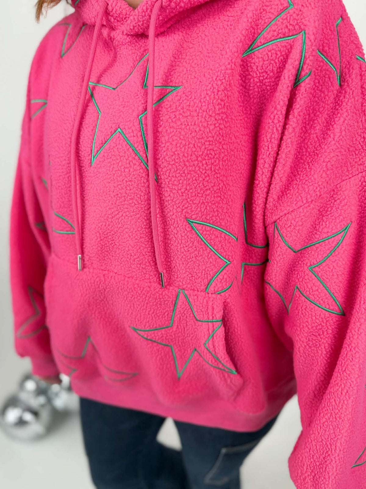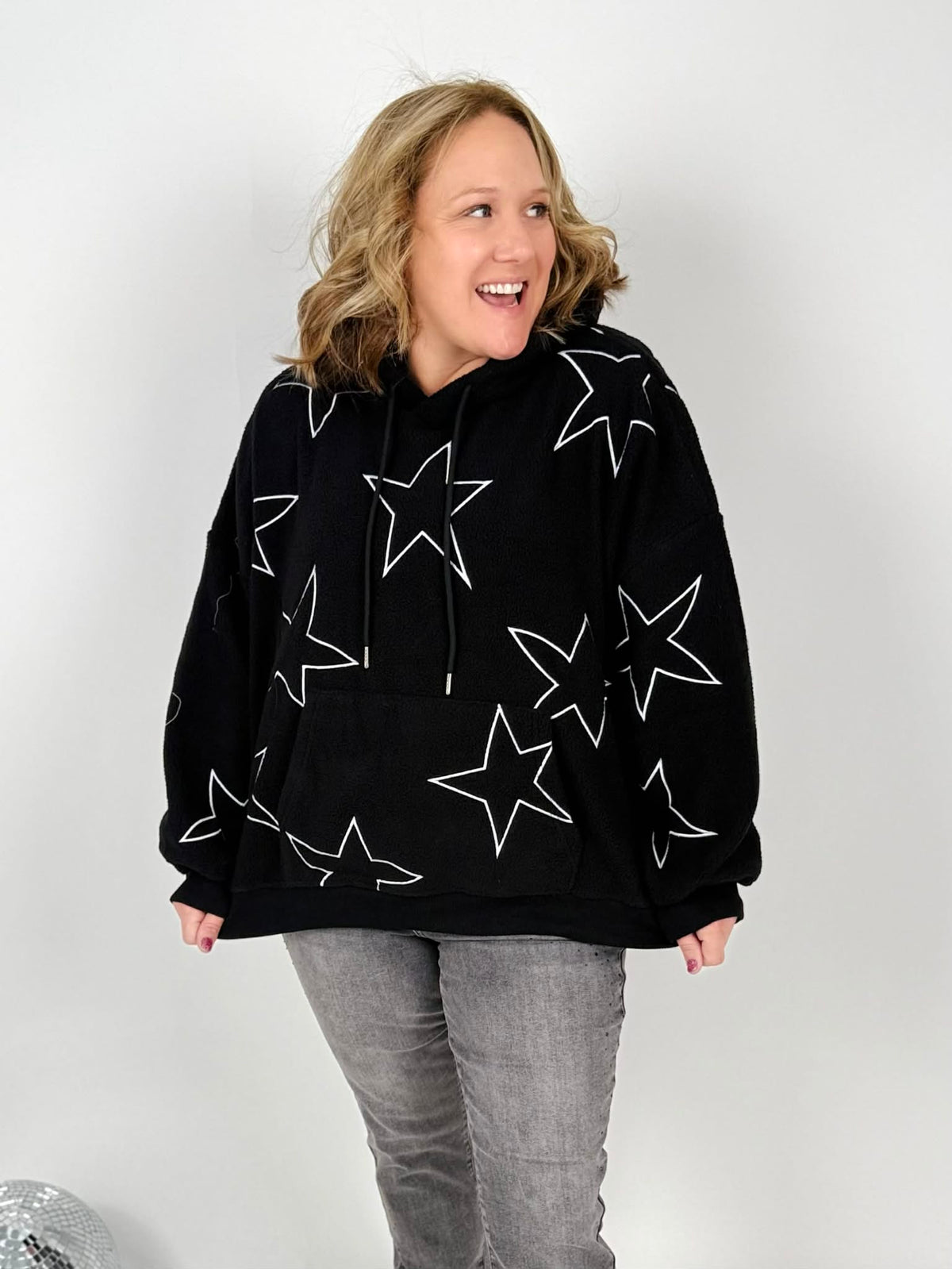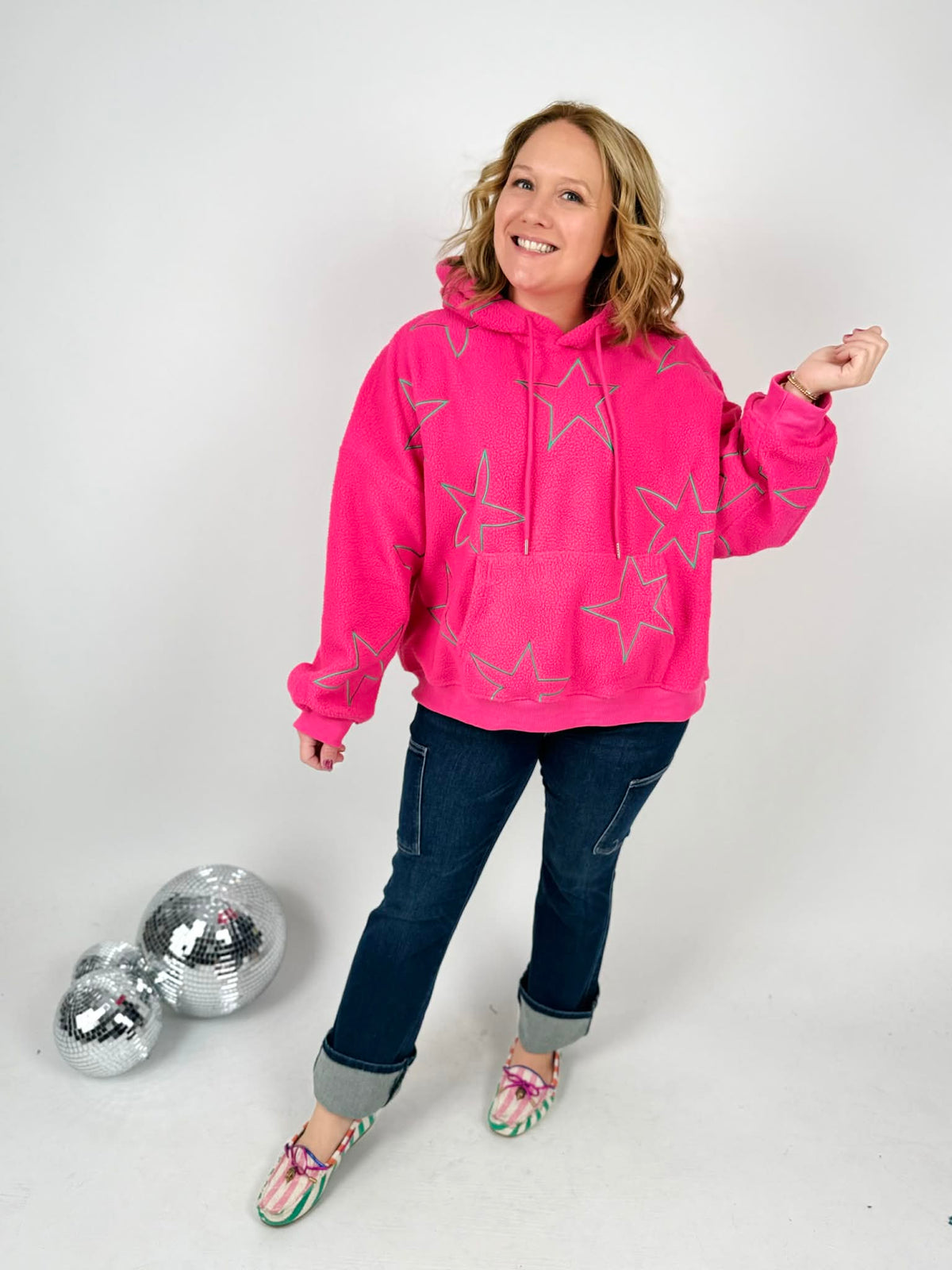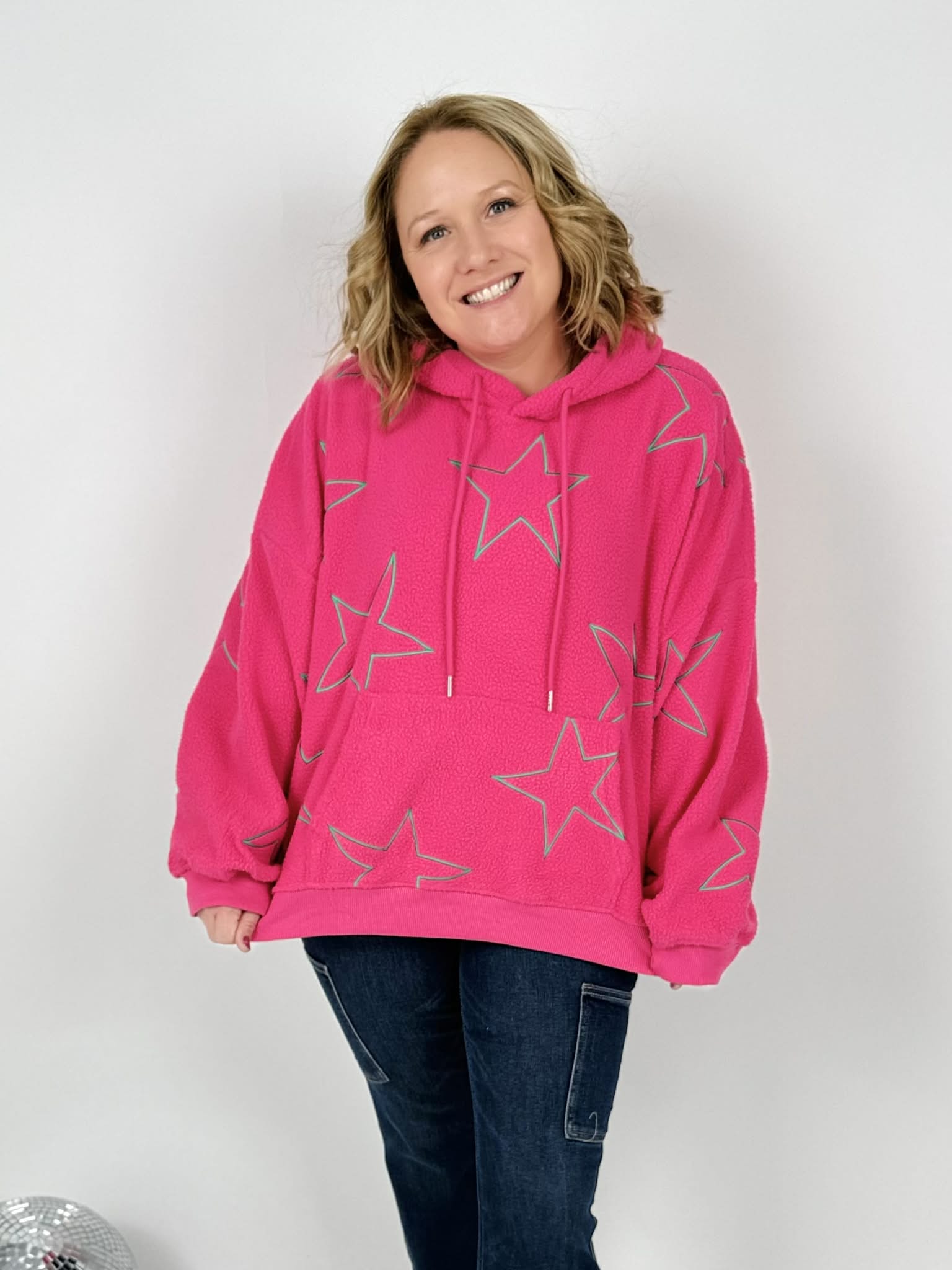 Cozy up in the Twinkle Twinkle Hoodie, featuring an allover star pattern that adds whimsy to your look. Made from soft sherpa fabric, this hoodie offers a relaxed, loose fit with dropped shoulders for effortless comfort. Stay warm with the adjustable hood and kangaroo pocket, while the banded hem keeps everything snug. Perfect for lounging or casual outings, this playful hoodie brings a sprinkle of magic to your everyday wardrobe.