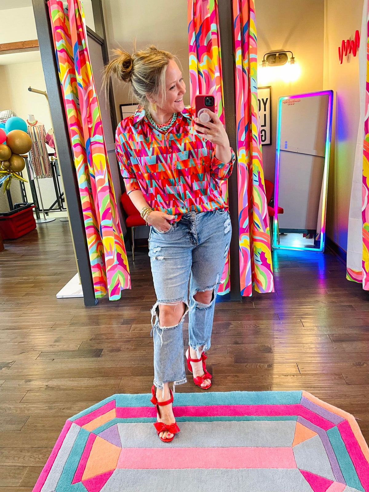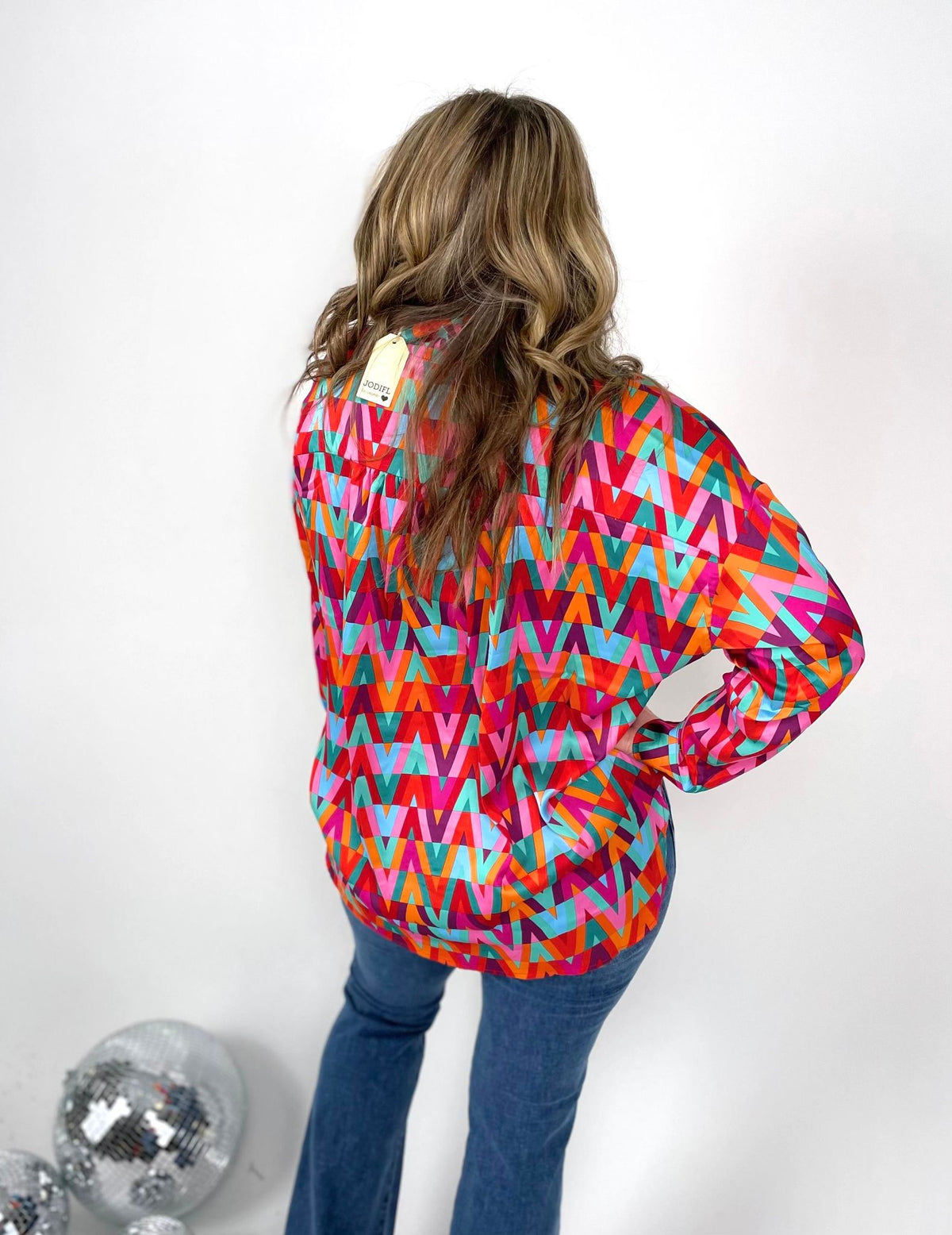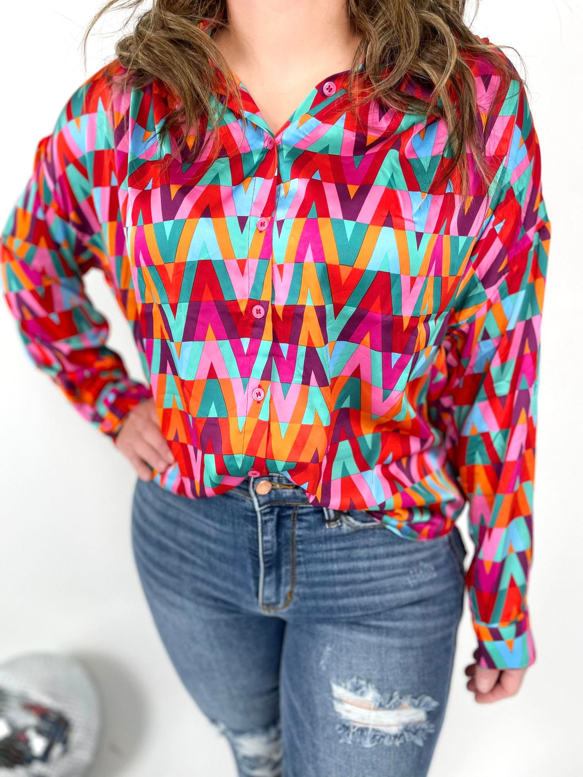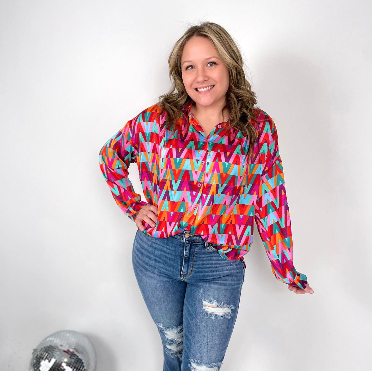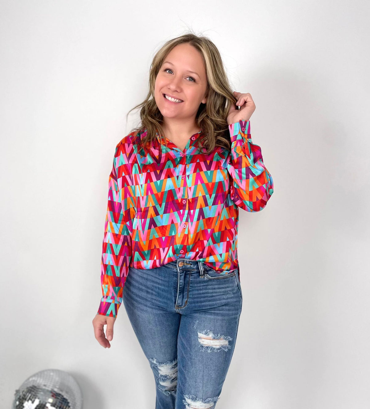 Boost your style with our Colorburst Top! This print button up top not only has a collared neckline, but also boasts ruched shoulders and buttoned long sleeves. Feel comfortable all day with its unlined, non-sheer, and lightweight design. Perfect for any occasion!