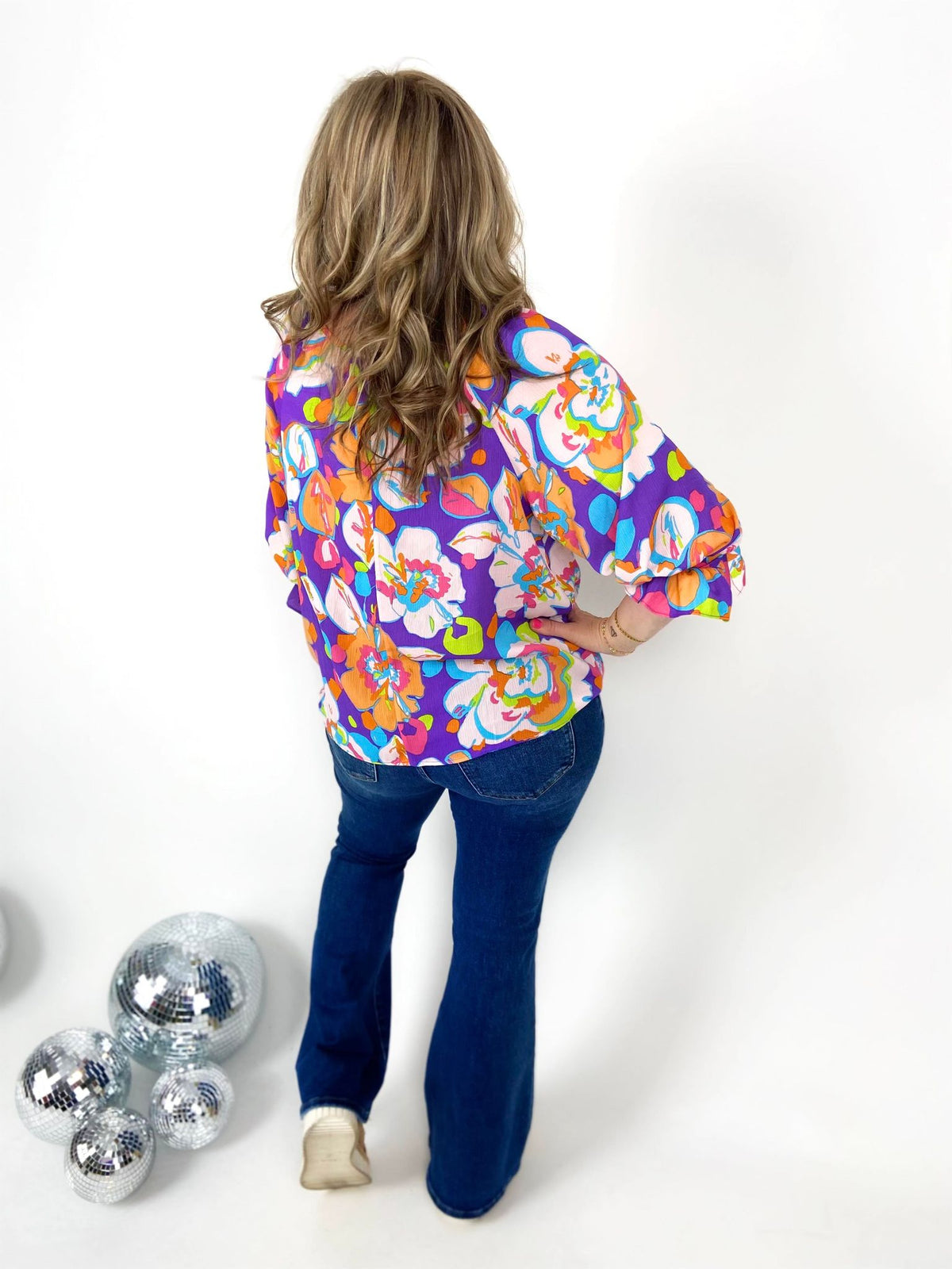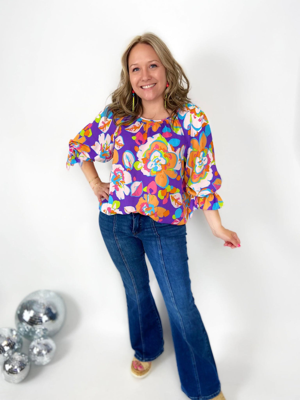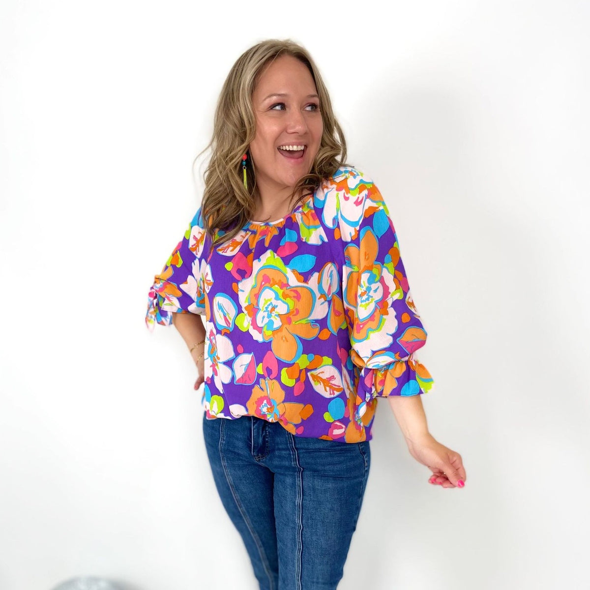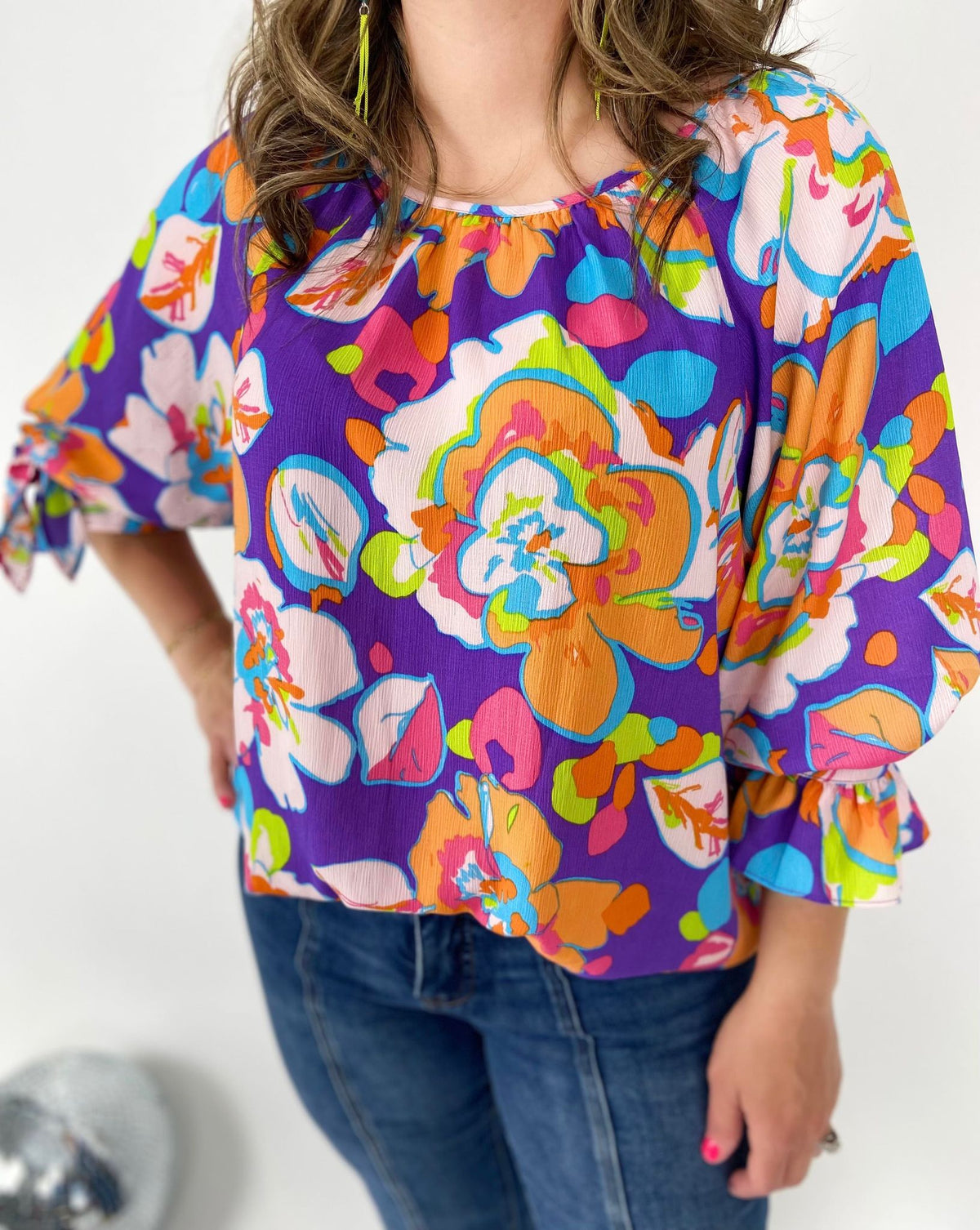 Indulge in the Floral Splendor Top! The playful floral print adds a touch of whimsy to this loose and relaxed fit top. The smocked neckline and ruched detail give it a flowy silhouette and the 3/4 length sleeves with tie cuffs add a unique touch. Perfect for a day out or a casual night in.