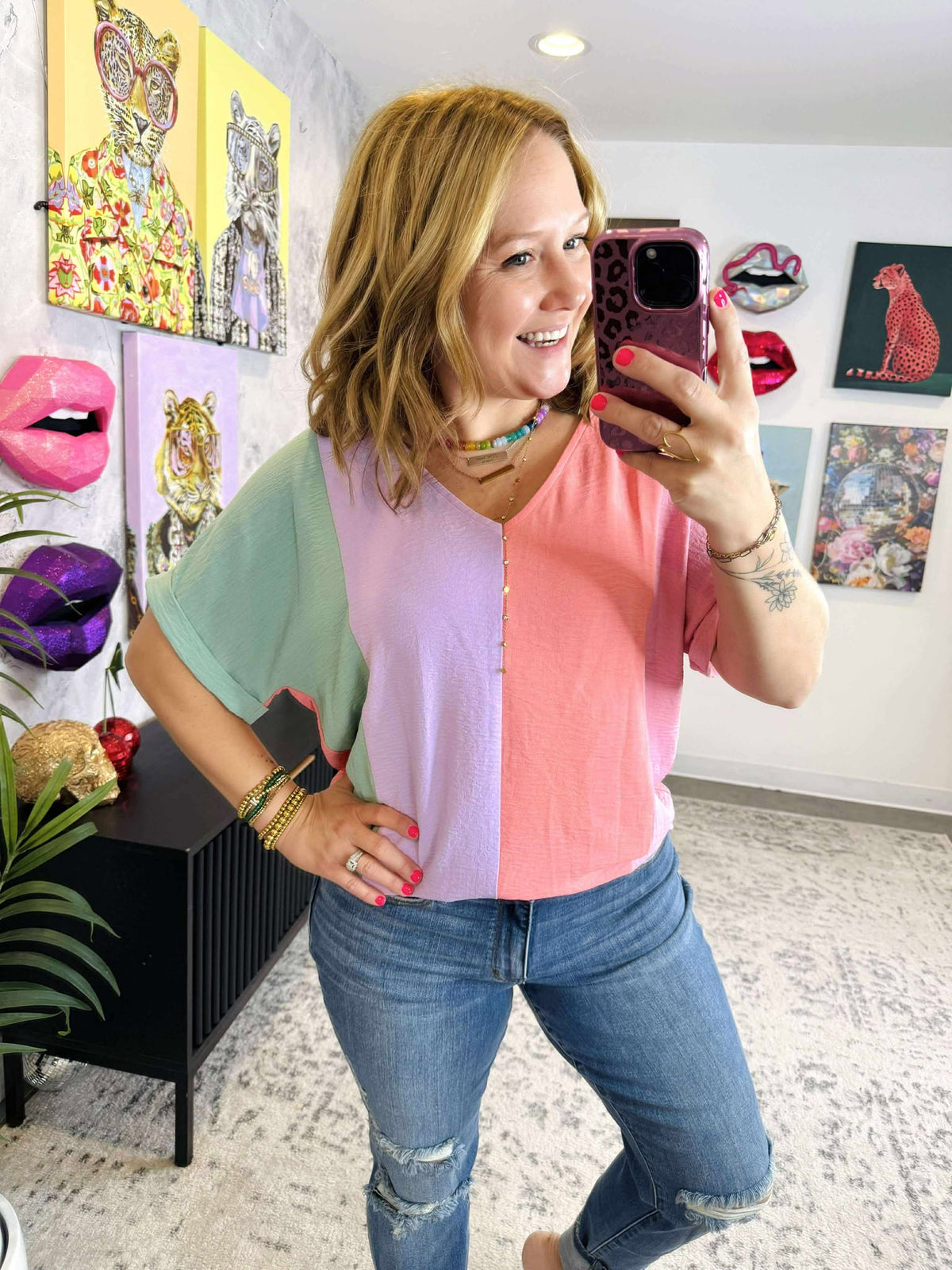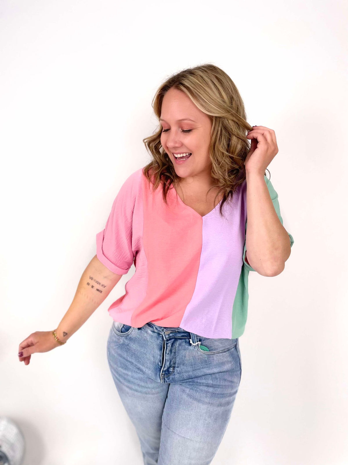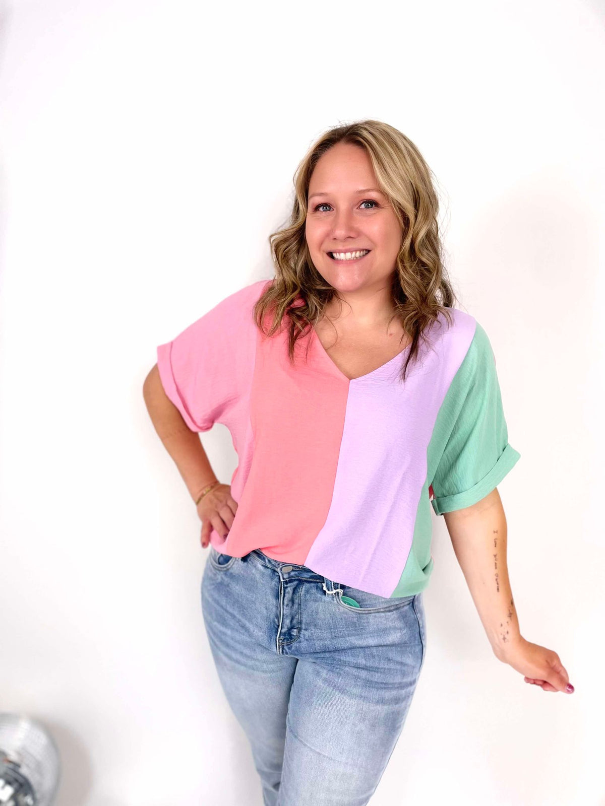Stay cool and stylish in our Line Up Top. With its color block design and roll up sleeves, you'll be ready for any adventure. The V neck adds a touch of femininity. Breeze through your day with our AIR FLOW technology.