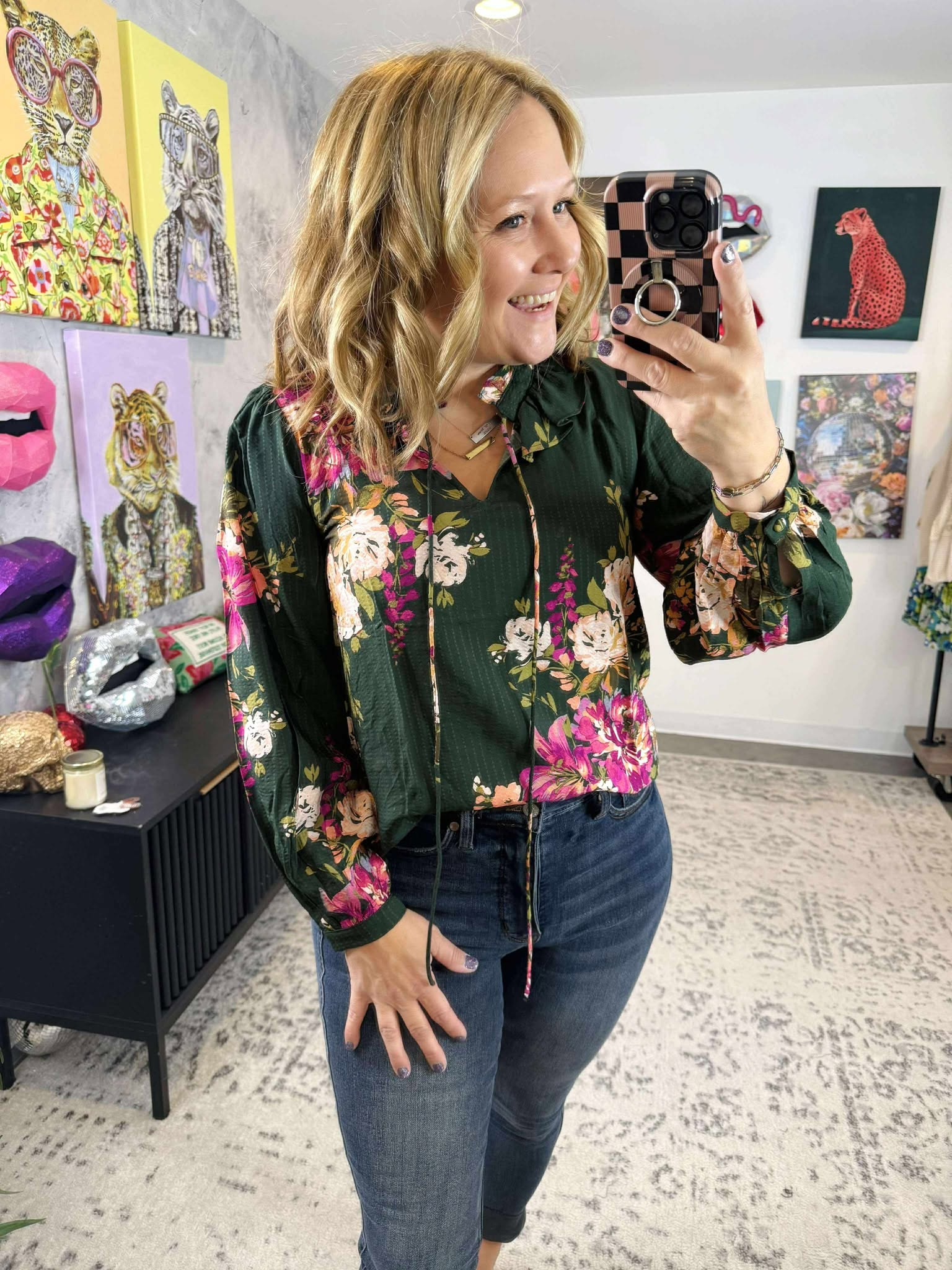 Add a touch of whimsy to your wardrobe with the Moss & Petals Blouse. This dark green floral printed long-sleeve top delights with a playful tie detail and a charming ruffled neckline, perfect for twirling through your day. Available in sizes S to 3X, it’s designed to flatter and brighten every moment with effortless feminine flair.