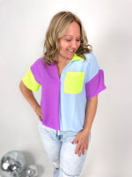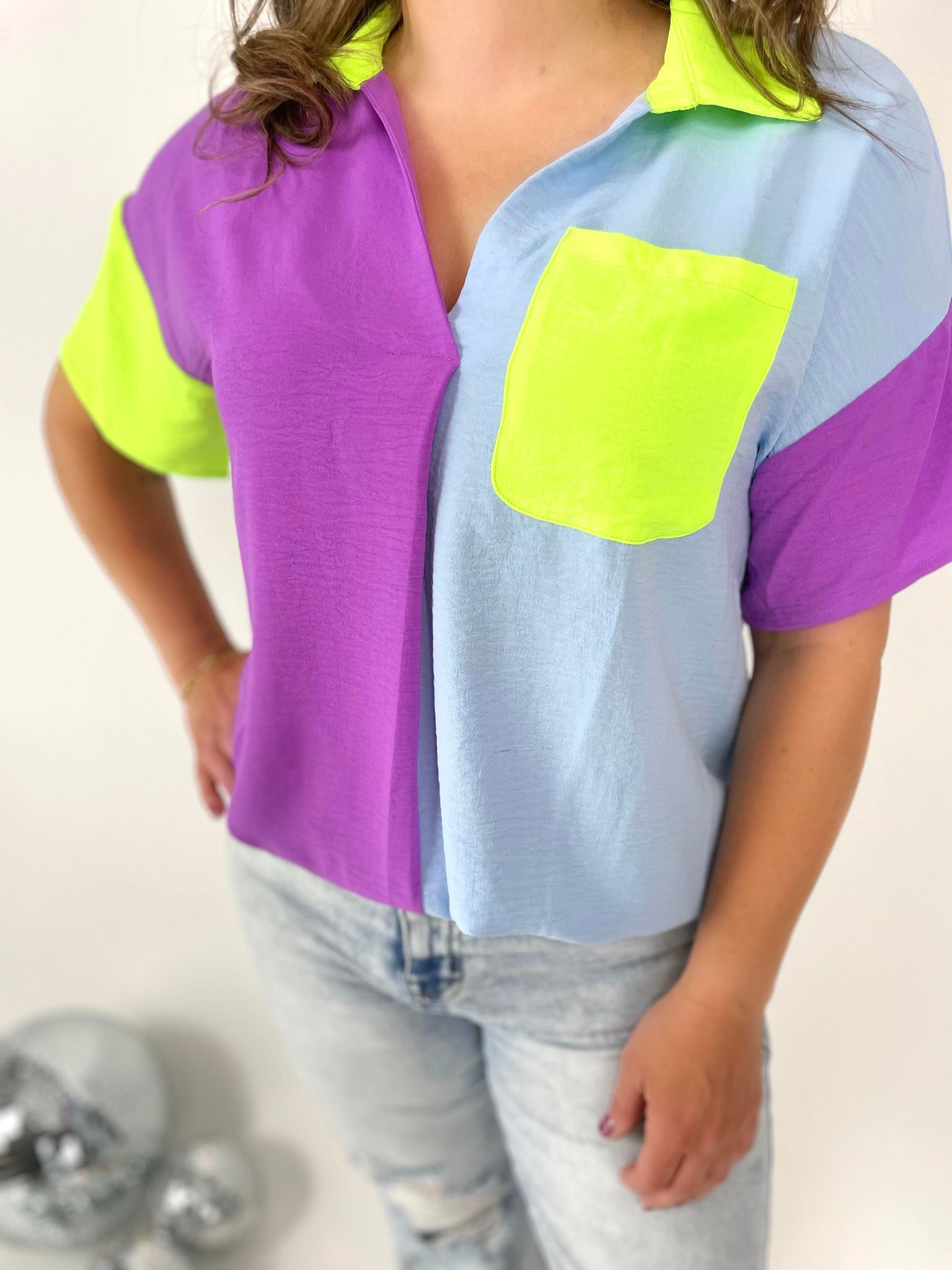 Be the life of the party in our Neon Pulse Collared Top. This lightweight, unlined top features fun colorblocking and a playful open collared neck. The back box pleat adds a touch of style while the chest pocket is perfect for storing your essentials. With drop shoulder and short sleeves, this top is all about comfort and fun. Get ready to turn heads and have a good time!