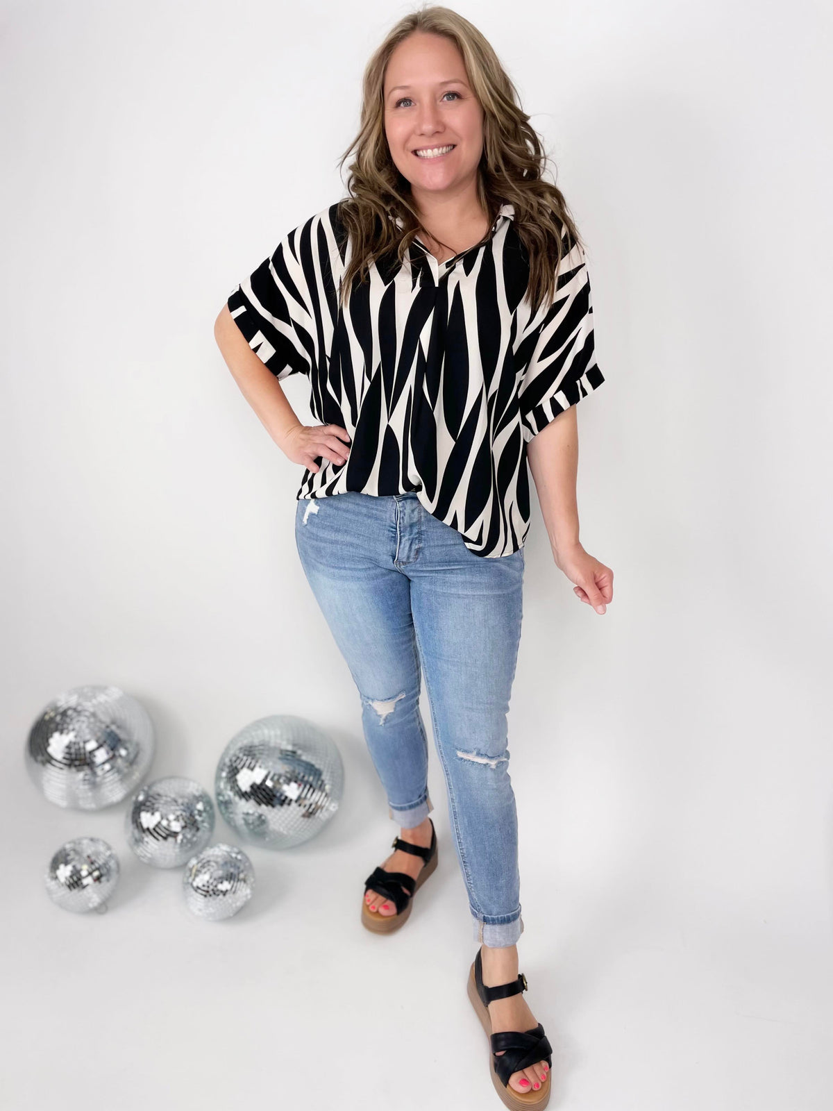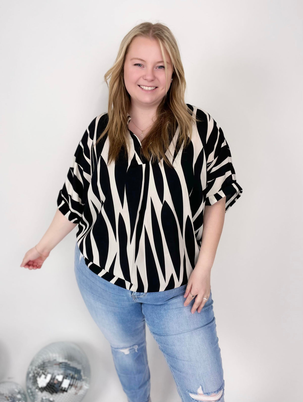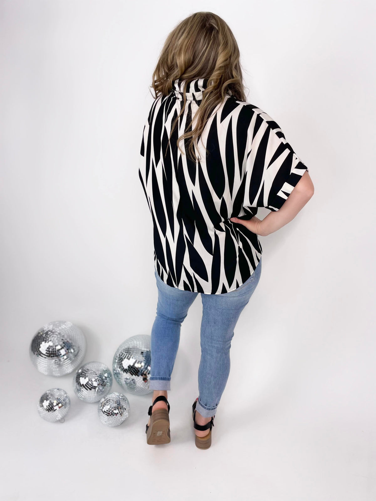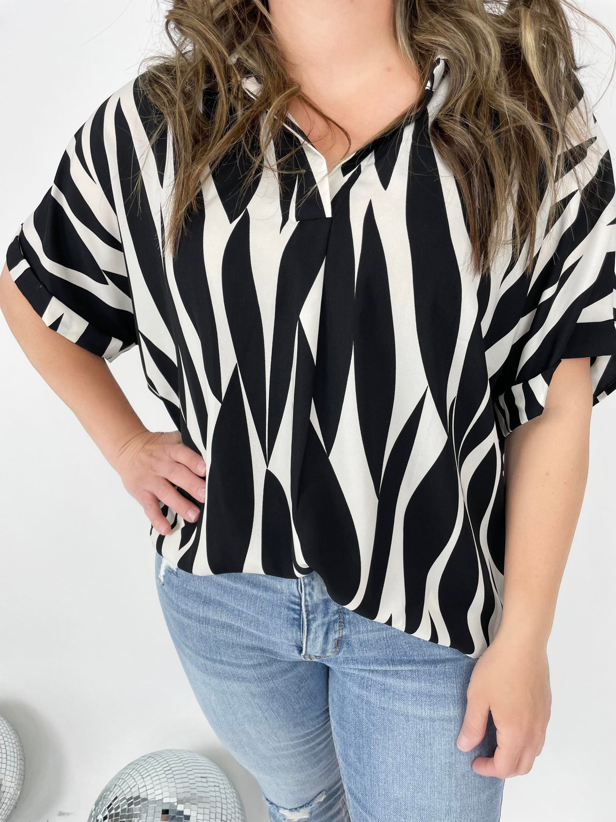 Get ready to stun in style with our Savvy Stripes Top! This playful piece features a trendy half-sleeve design, a unique geo print, and a cozy, loose fit. With its collared notched neckline and rolled sleeves, this lightweight knit top is the perfect addition to your wardrobe. Fashion meets comfort in this must-have top!