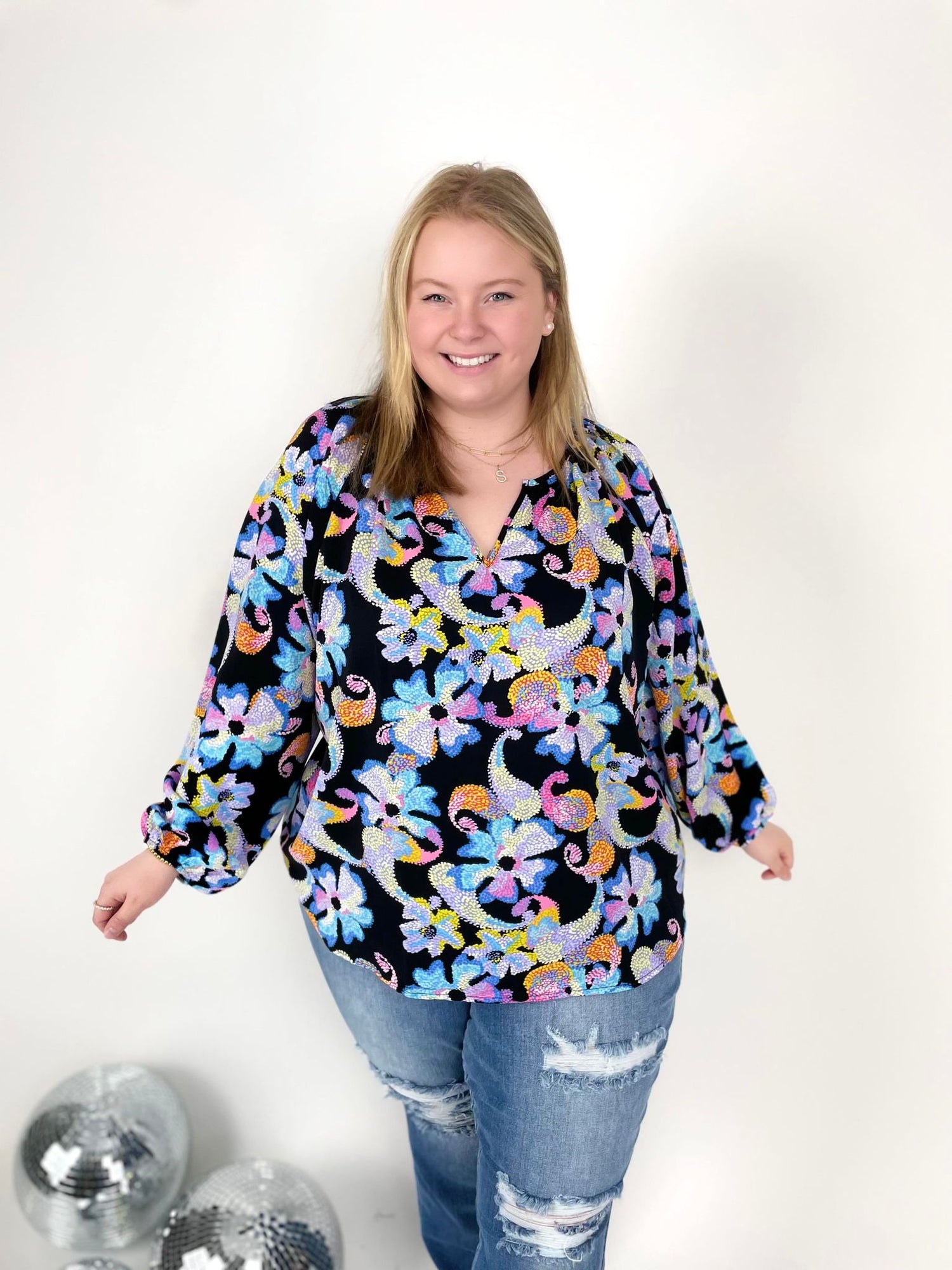 Bring a bouquet of sweet floral style to your wardrobe with this On Many Flowers Top! Boasting a delicate print and an alluring split neckline, this woven blouse has just the right touch of flirty femininity. Oh, and its long sleeves mean you'll stay comfy and cozy as you look your absolute best. Pair with capris and some espadrilles for a unique look.