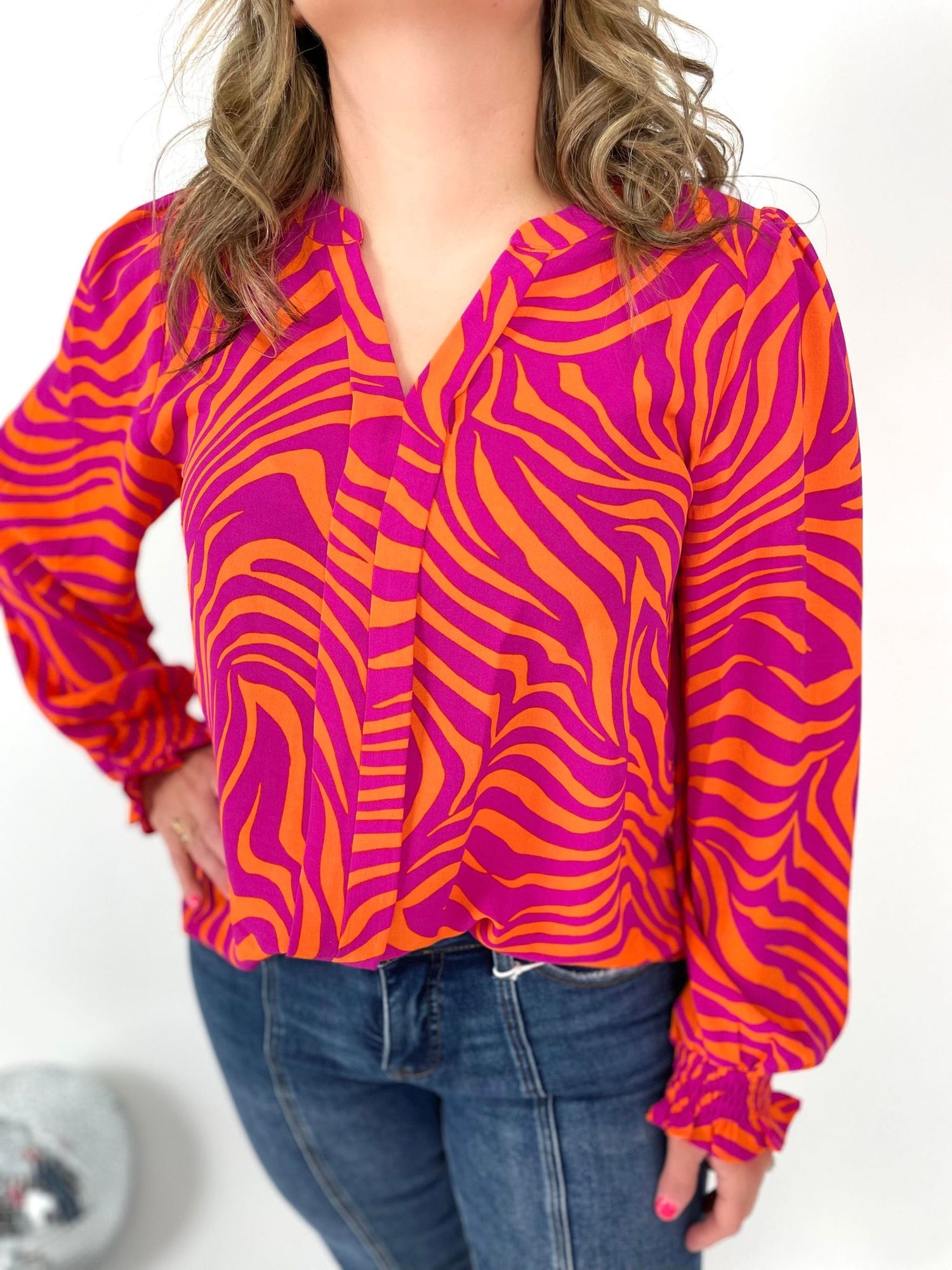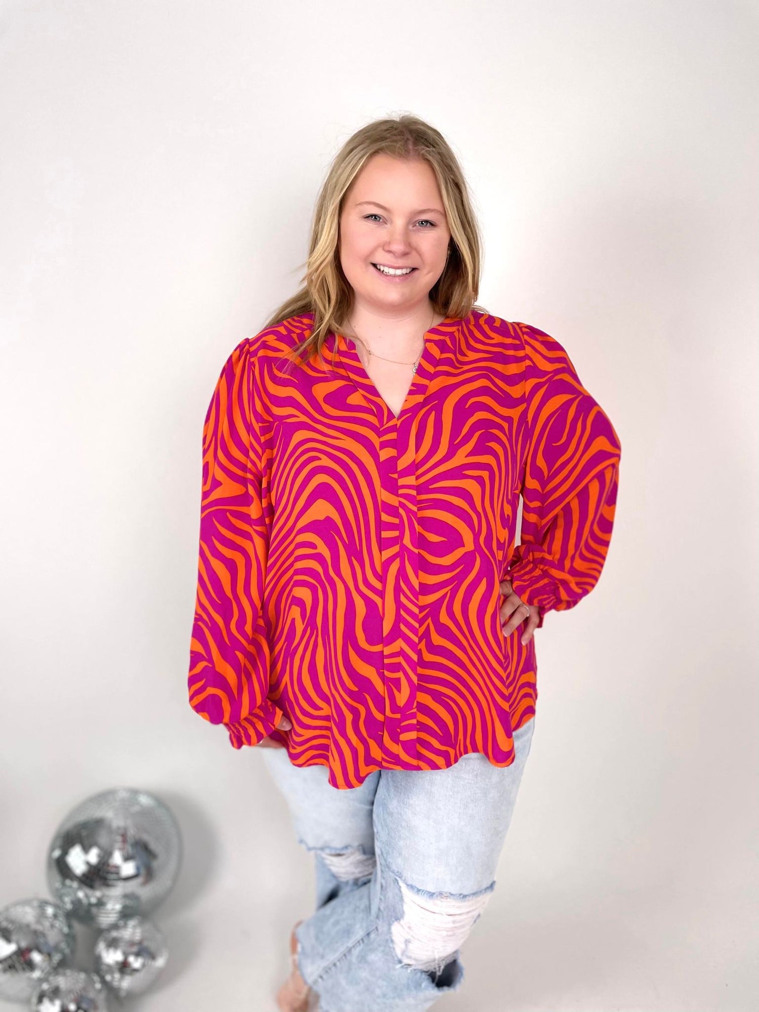 You'll be turning heads when you wear this fun printed top featuring a b-neckline, balloon sleeves, and elastic on the waist! Pair it with white slacks for a fun look for a ladies day out!