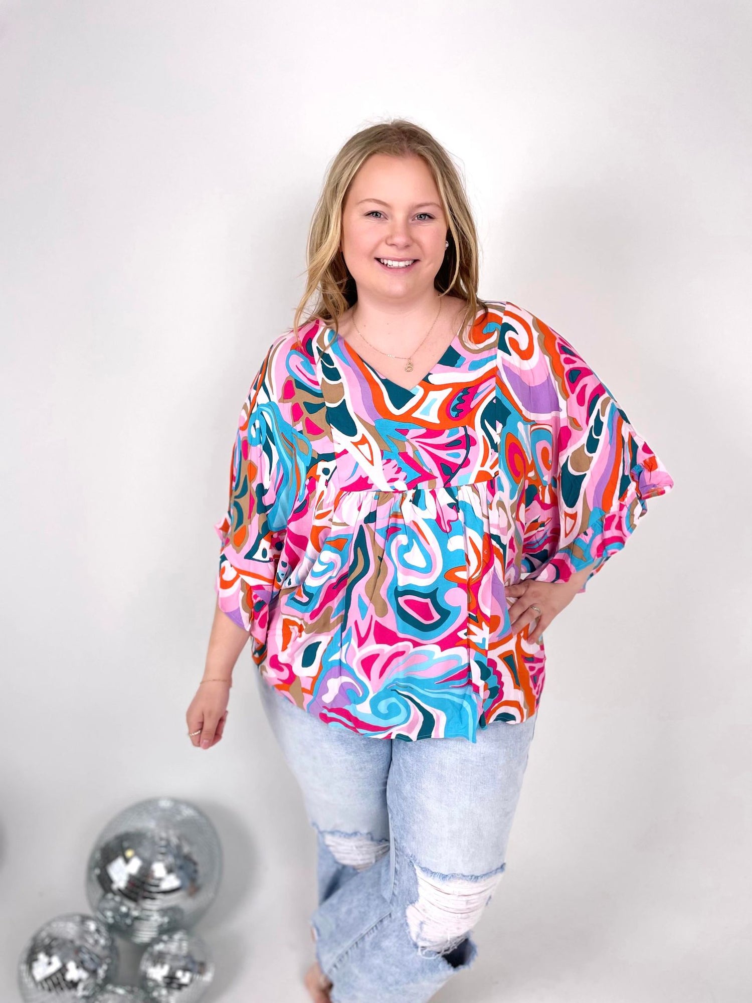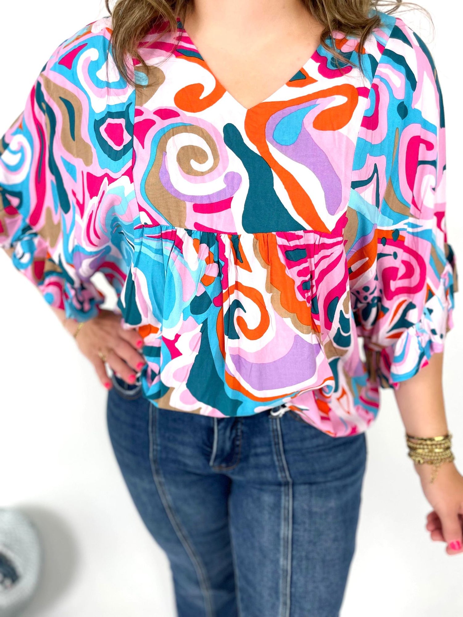 Let your style shine with our Abstract Vision Top. This multicolored print top features a flattering v-neckline, billowy balloon sleeves, and an effortless fit for all-day comfort. No need to worry about transparency, as this top is non-sheer. Perfect for adding a pop of color to any outfit.