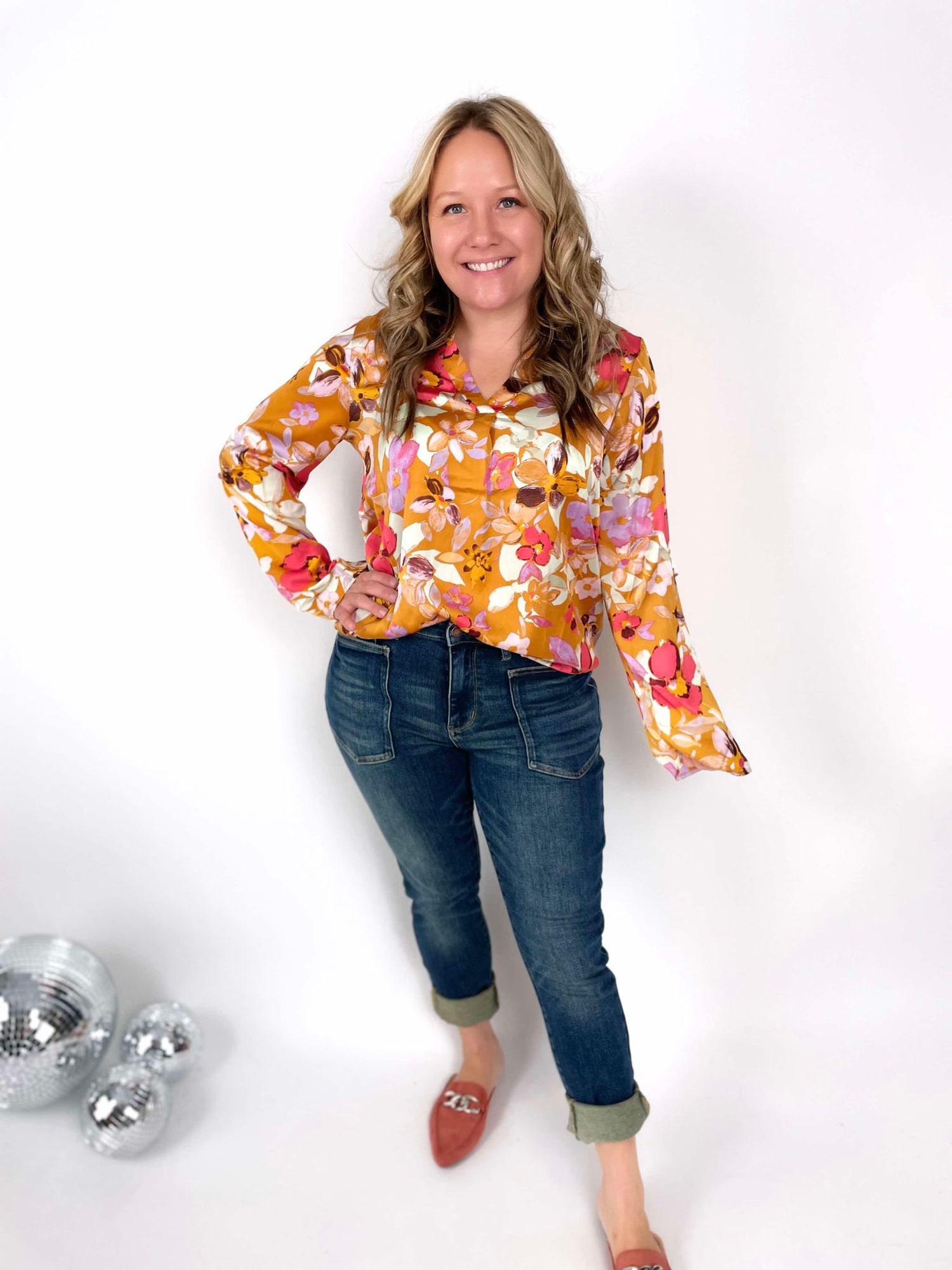 Unleash your inner flower child with our Pink Perfection Top. This playful piece is adorned with a delightful floral print and features a stylish collar neck and cute cap sleeves. Perfect for pairing with your favorite jeans, it's a non-sheer, must-have addition to your wardrobe. (Florals, cap sleeves, and non-sheer. What more could you want?!)