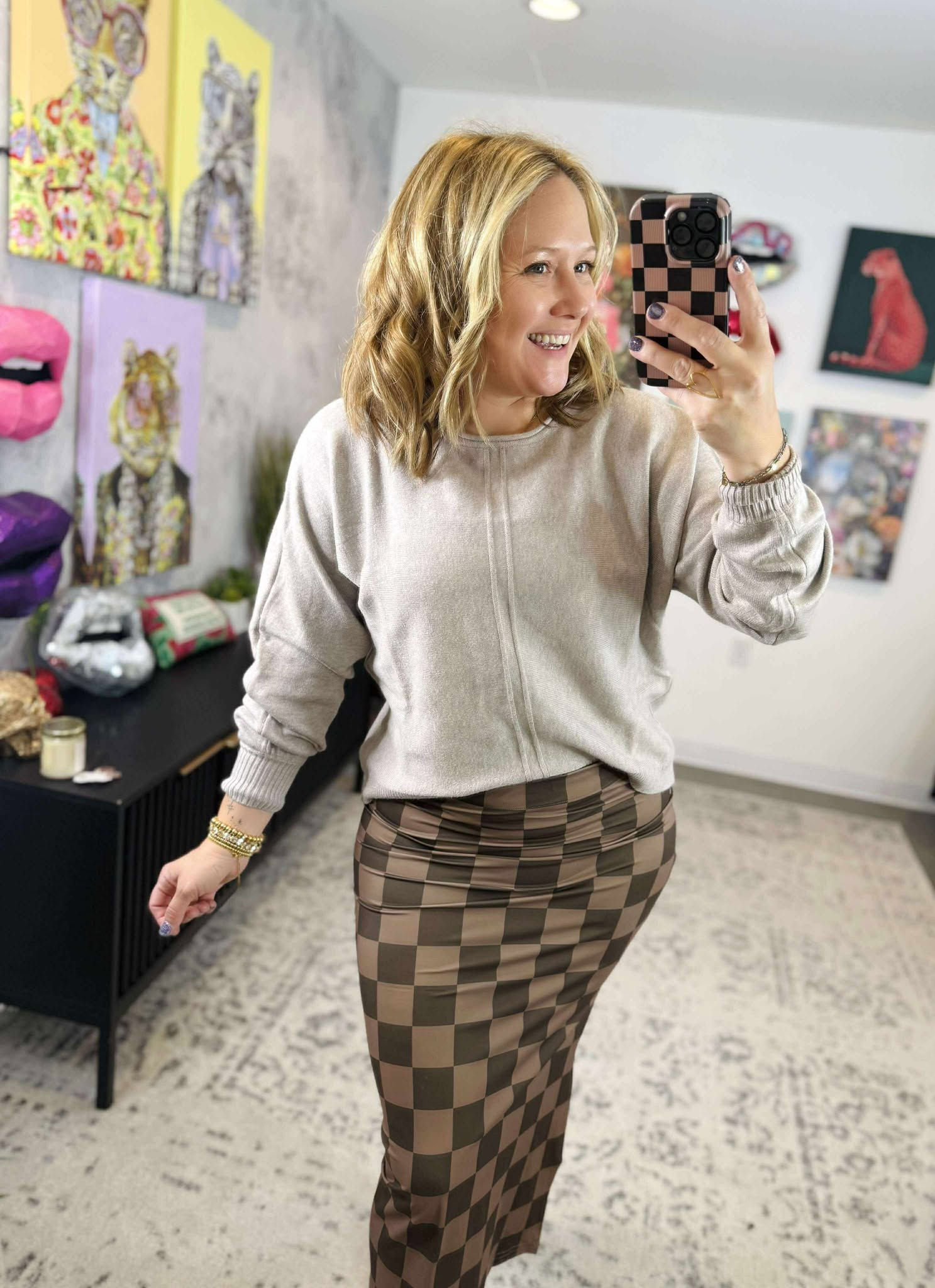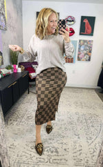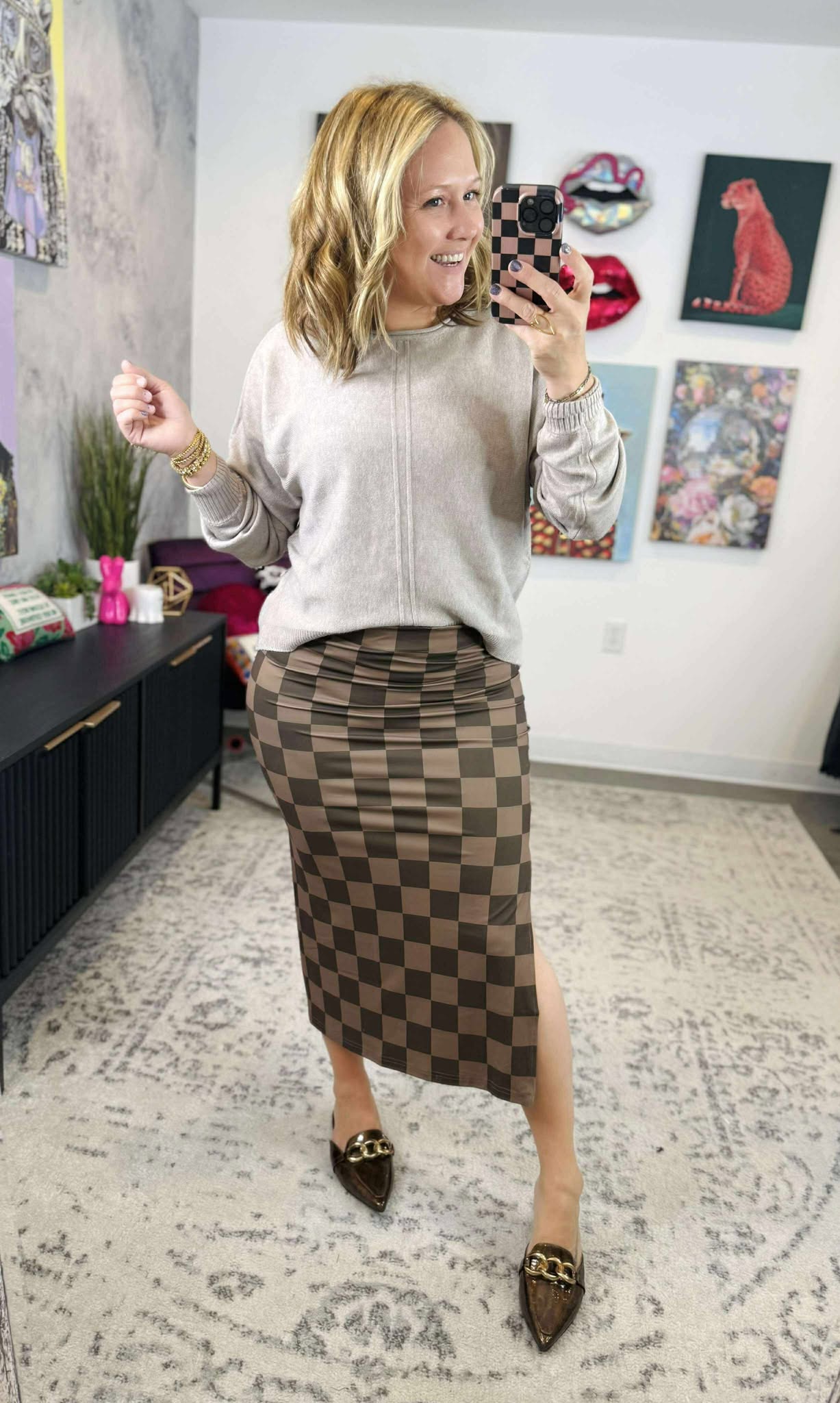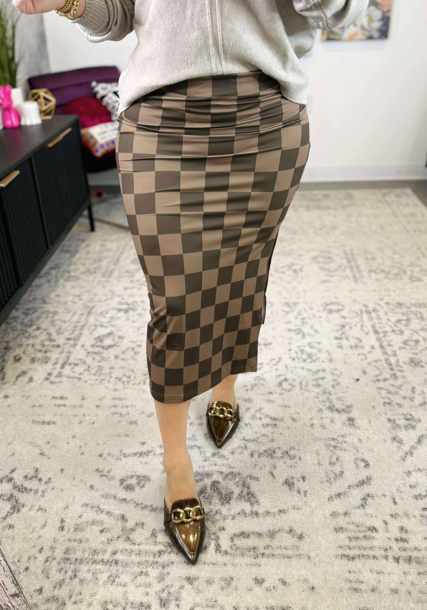 Introducing the Chocolate Checkered Midi Skirt, perfect for a fun and fashionable look. The super stretchy fabric provides comfort, while the side slit adds a touch of sass. The midi length adds a chic and versatile element to any outfit.