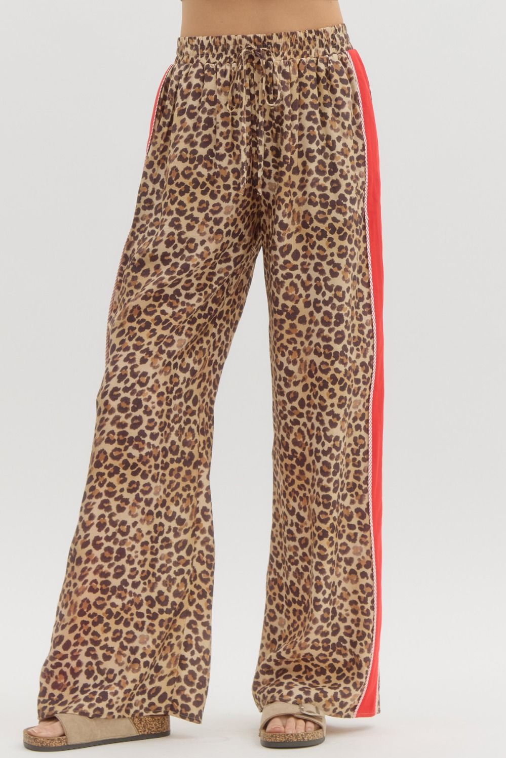 Unleash your inner feline with these high waisted leopard print pants. Featuring an adjustable tie waistband and side pockets, these wide leg pants are both stylish and functional. Complete with a subtle side contrast and lining, these lightweight woven pants are perfect for any adventurous occasion.