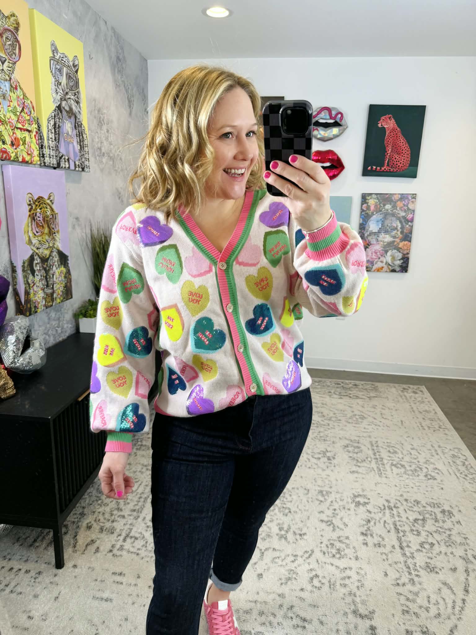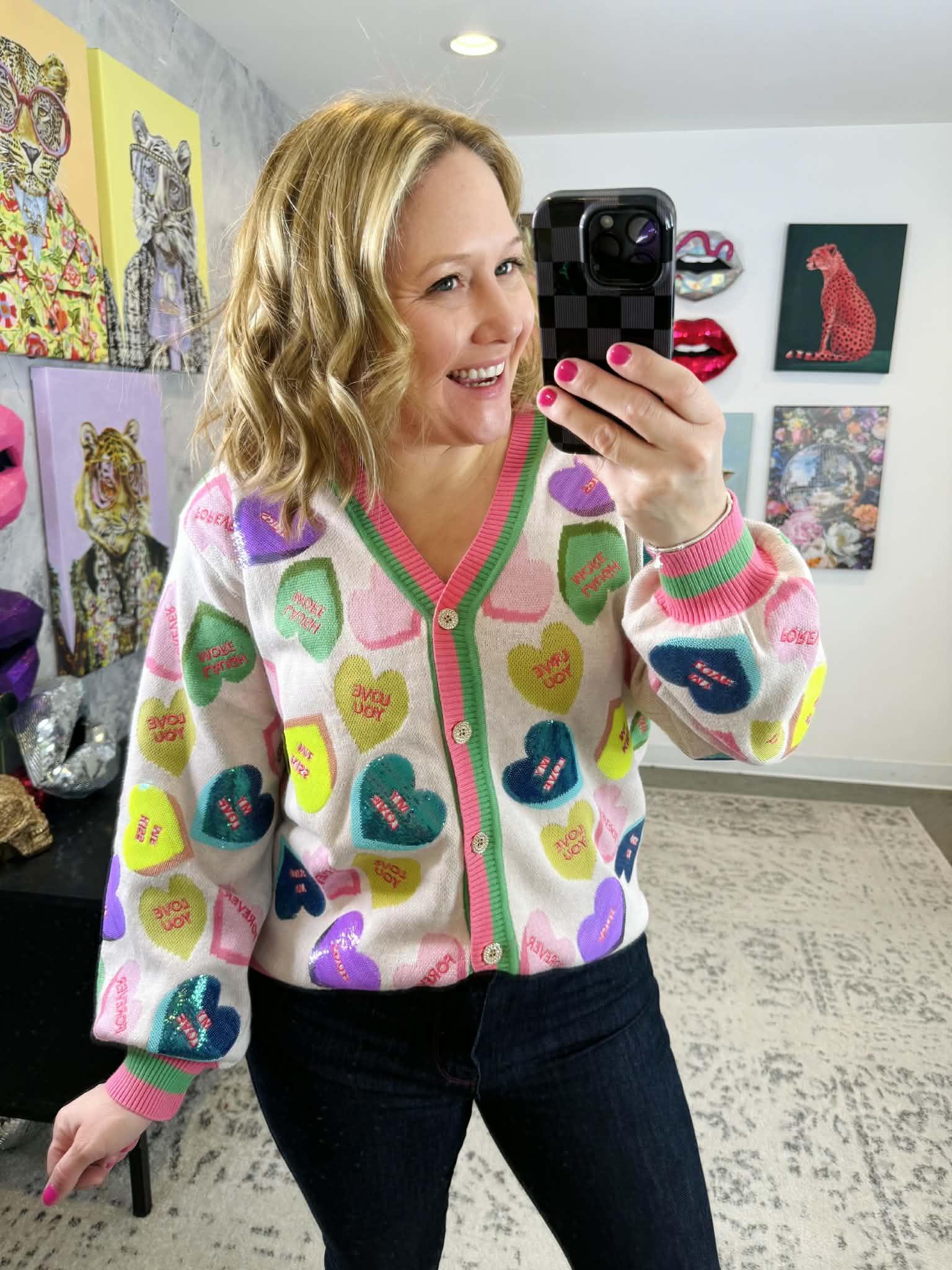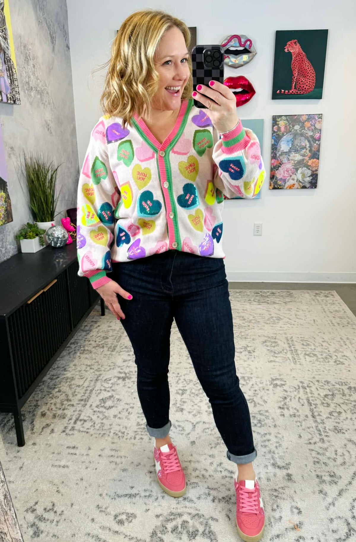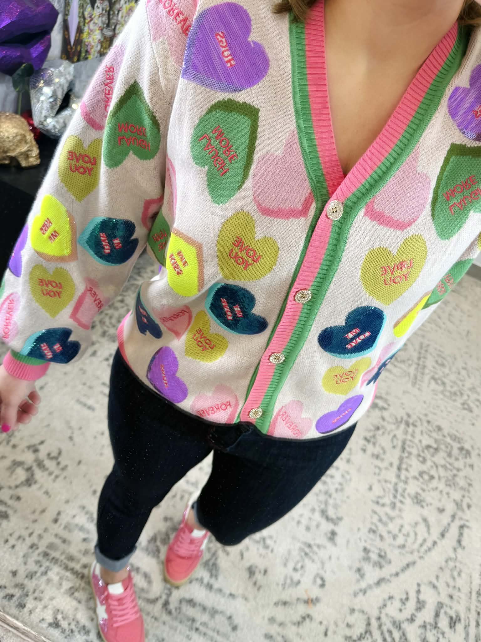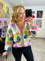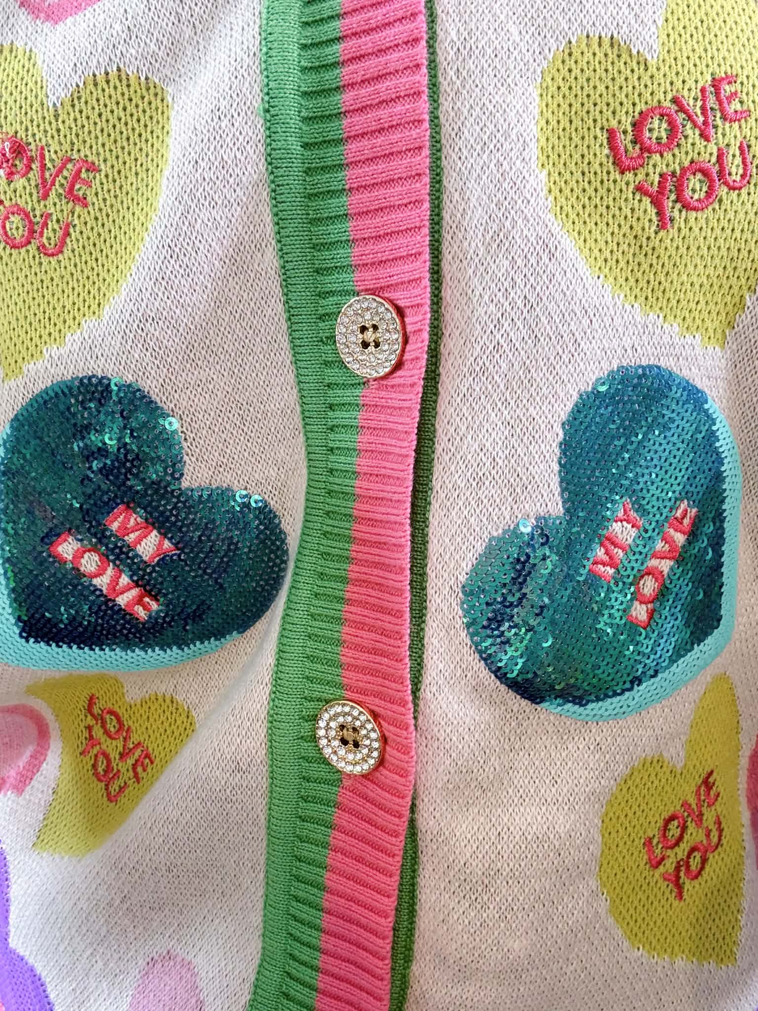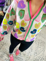Get ready to turn heads in this delightfully sparkly Queen of Sparkles button cardigan! Adorned with shimmering sequin candy heart appliqués that radiate pure joy, this piece combines sweetness with style. The striped edge trim adds a fun finishing touch that keeps the vibe light and flirty. Slip it on for instant personality and charm—because life's too short for boring cardigans. Sizes XS-XL.