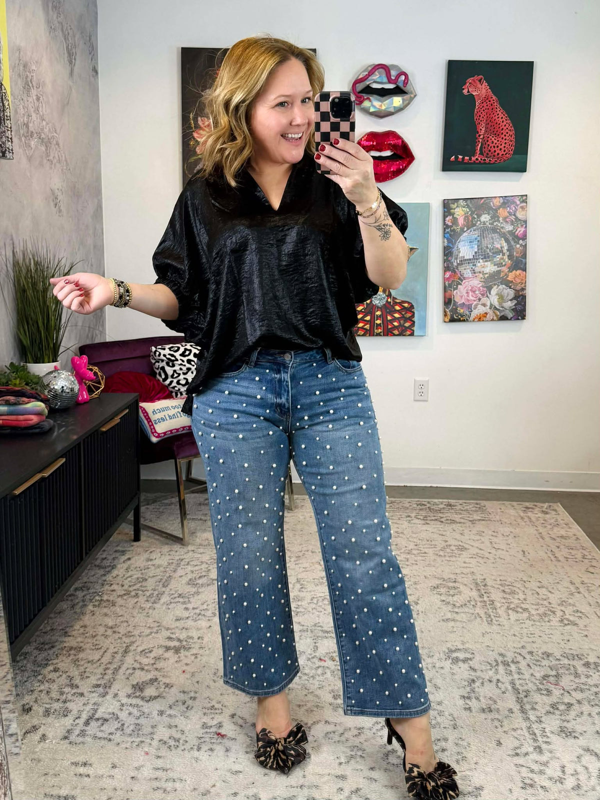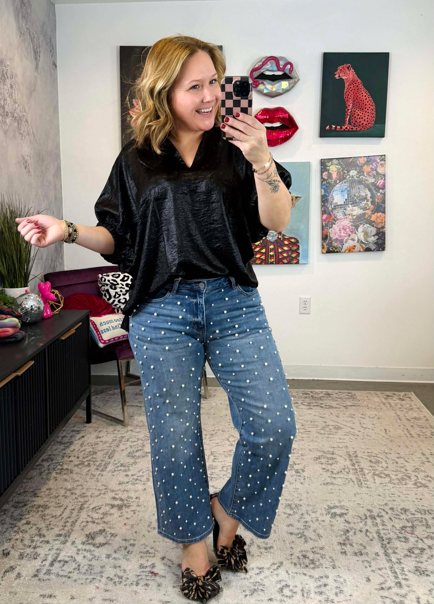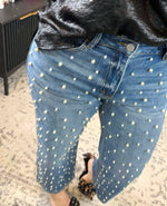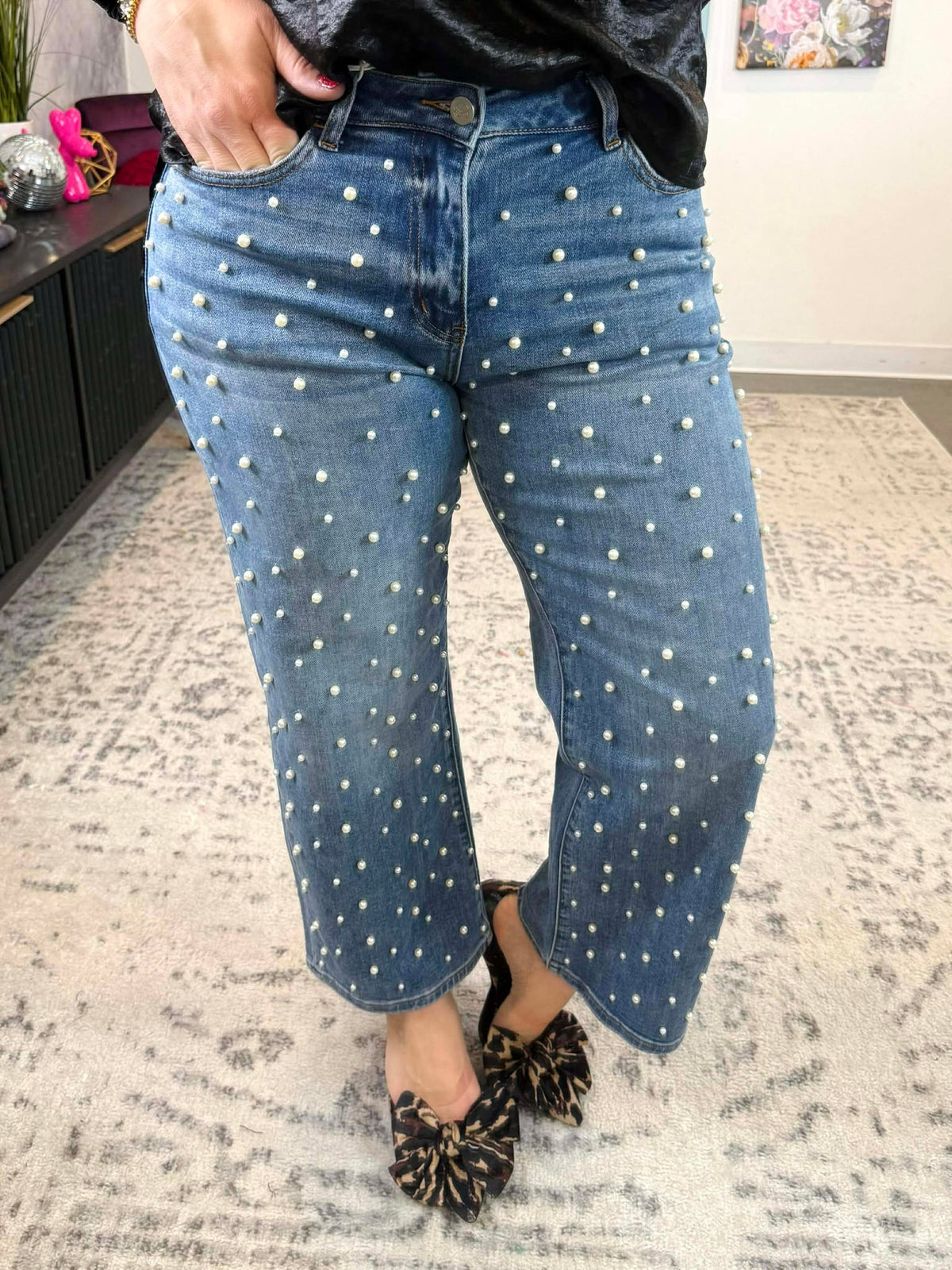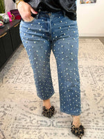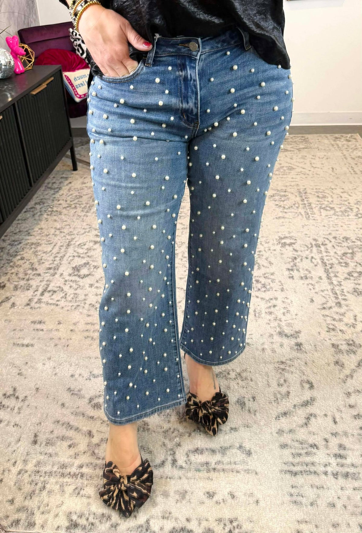 PREPARE TO FALL IN LOVE! These studded pearl jeans are what dreams are made of! Features great stretch, a straight leg and a 29" slight cropped style. These are a MUST have to add to your jean Collections.