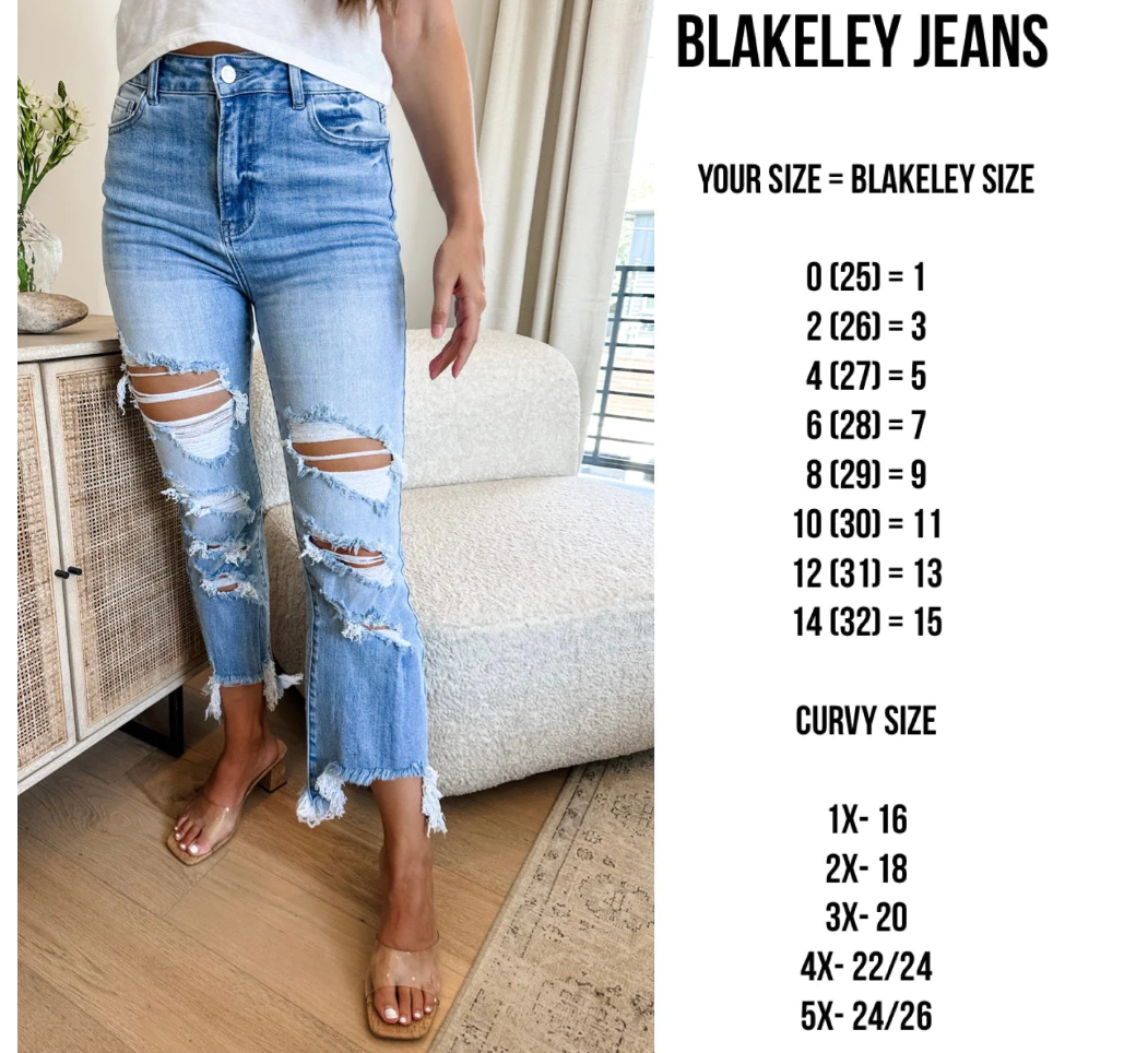 Kara (Department Store Size 10/12) is modeling Size 9. Due to being more pear shaped (hips/booty) Kara loves Size 11 in Mid-Rise Blakeley Jeans, and Size 9 in High-Rise Blakeley Denim.