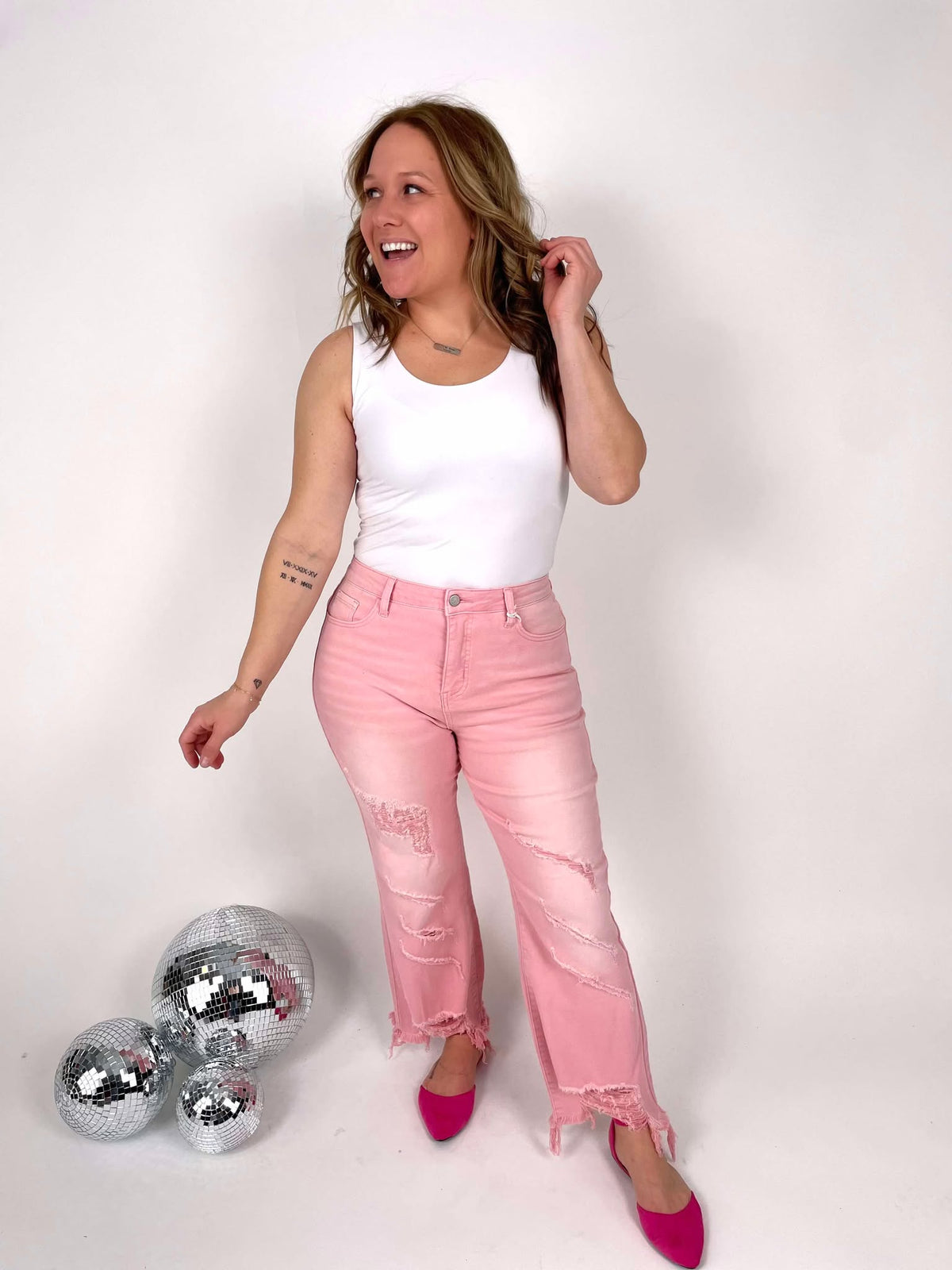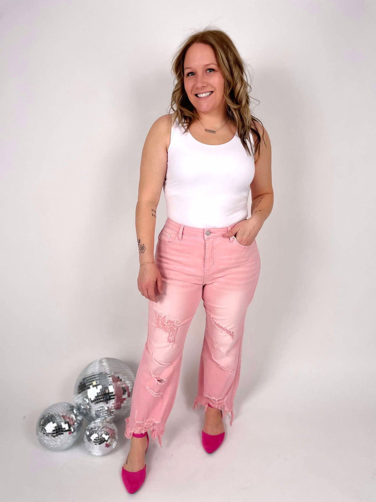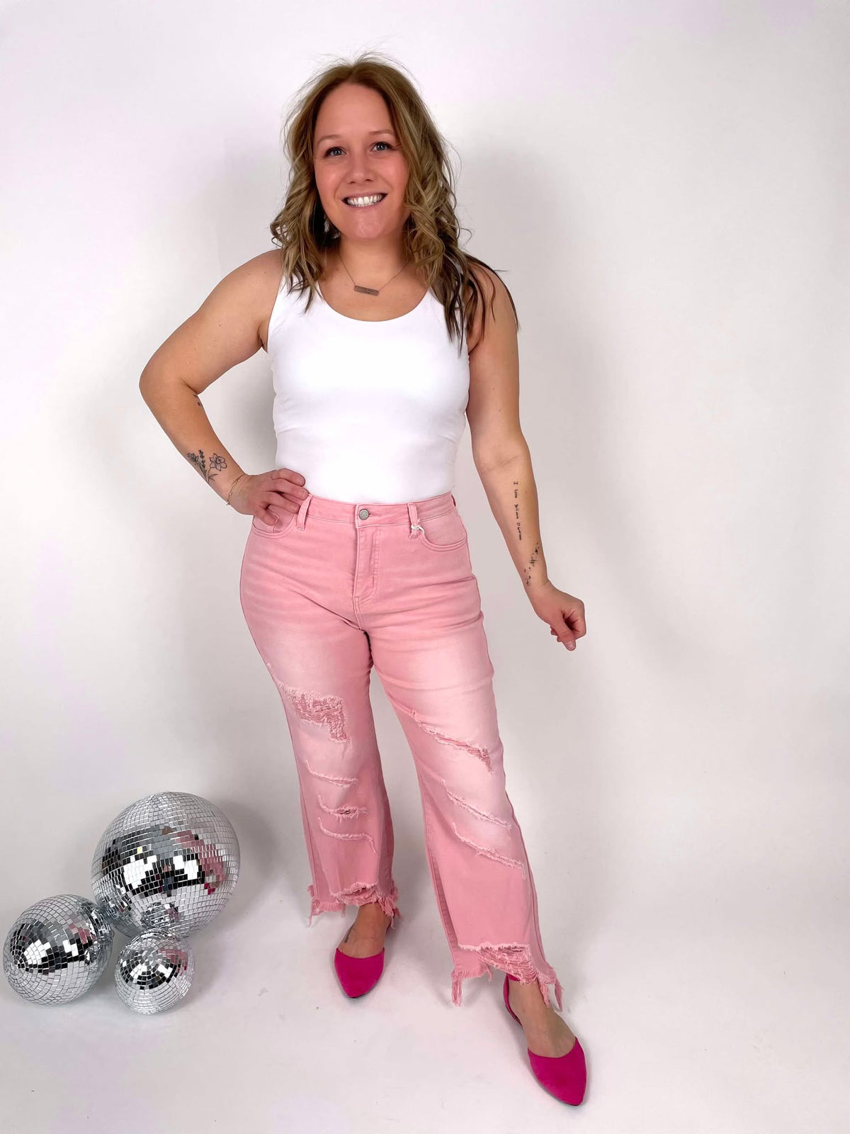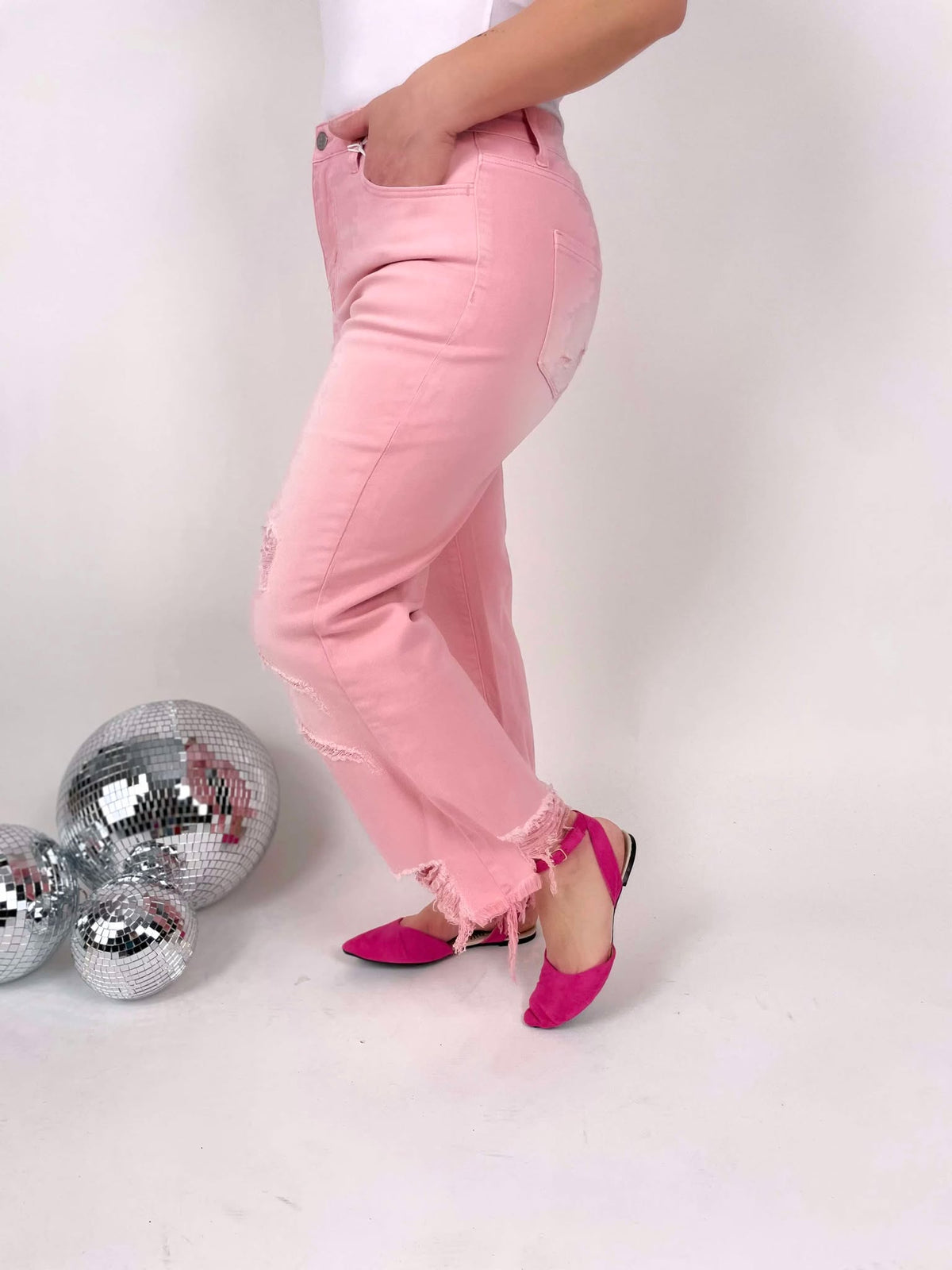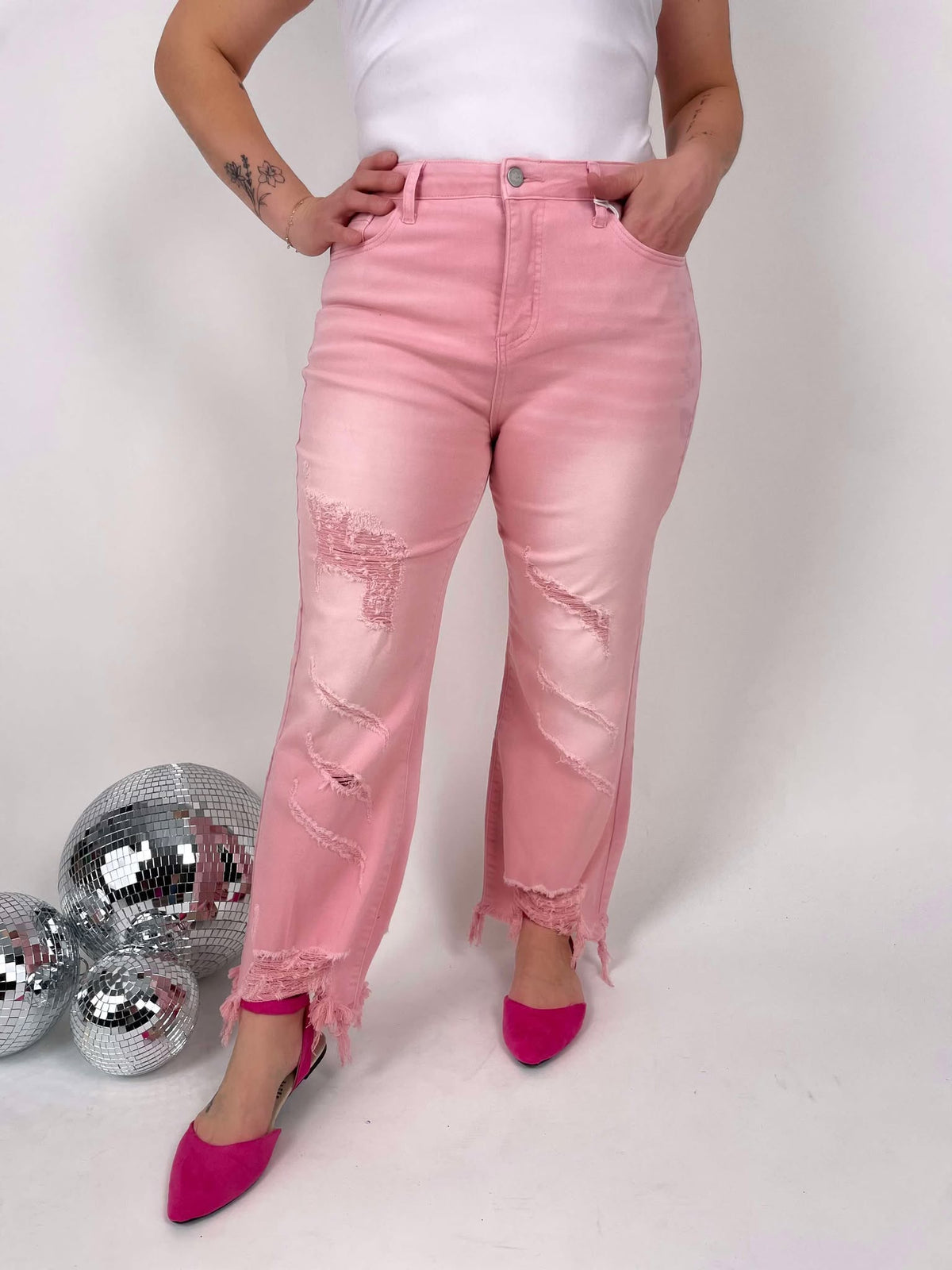 Cropped Straight Leg Silhouette - Pink Colored Denim - Distressed