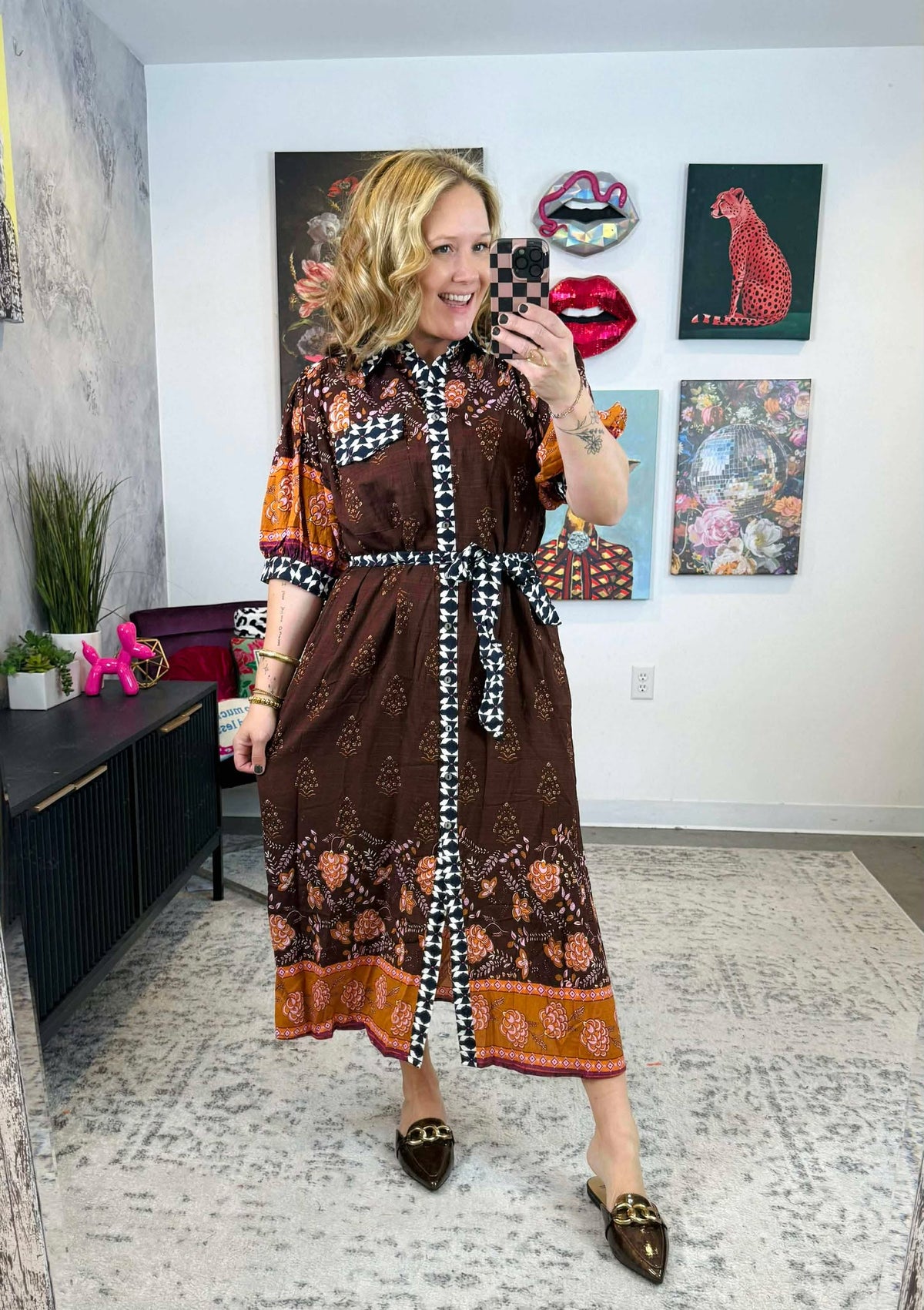 The Espresso Meadow Dress brings charm with its brown floral print and playful puff sleeves. Featuring a contrast collar, waistband, and chest pocket, this midi dress adds delightful details to your look. Button-front closure and handy side pockets combine style with function. Lightweight and fully lined, it’s crafted from woven, non-sheer fabric for comfortable all-day wear. Perfect for strolling through the meadow or your favorite weekend plans!