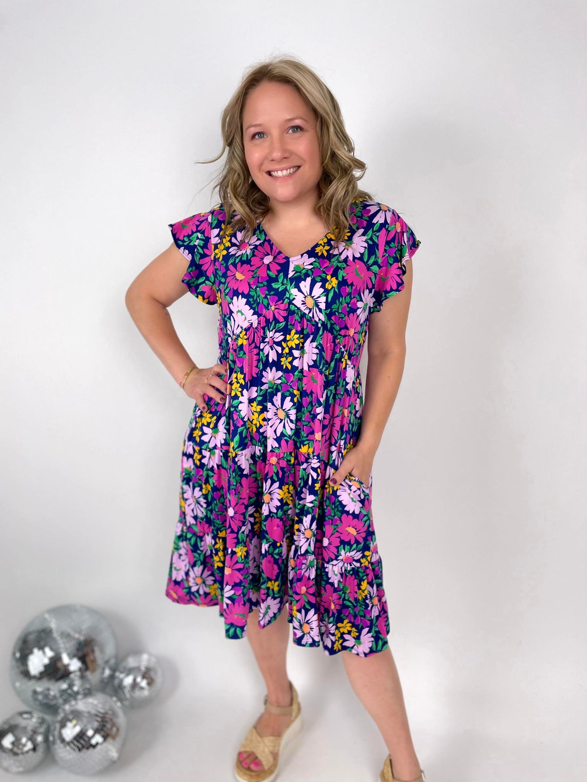 Turn heads and delight in our Plum Petals Babydoll Dress! Featuring a flattering V-neck and playful flutter sleeves, this knee-length dress is adorned with a beautiful floral print. The knit fabric ensures comfort, while the tiered design and side pockets add a touch of fun. A must-have addition to your wardrobe!
