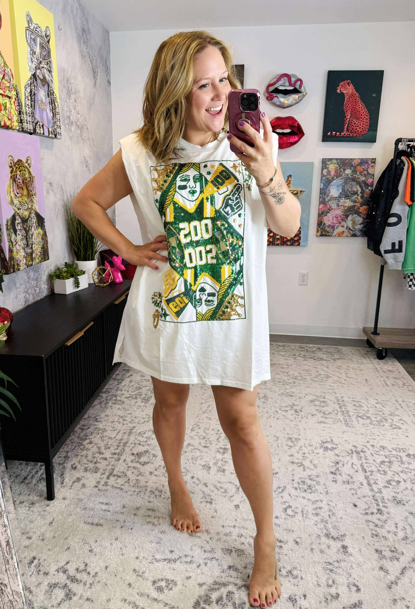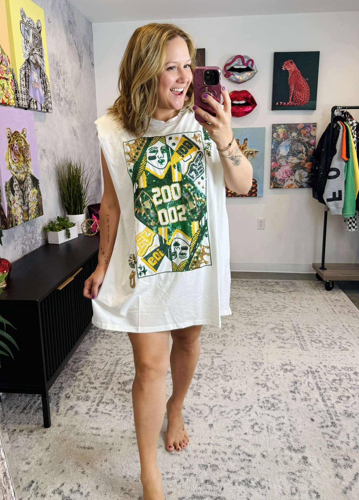 Queen of Sparkles :: Gameday Green & Gold Card Tee Shoulder Pad Dress {XS-XL}