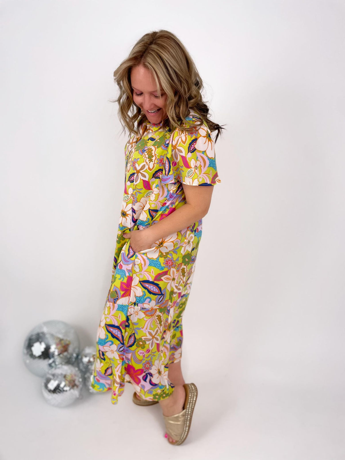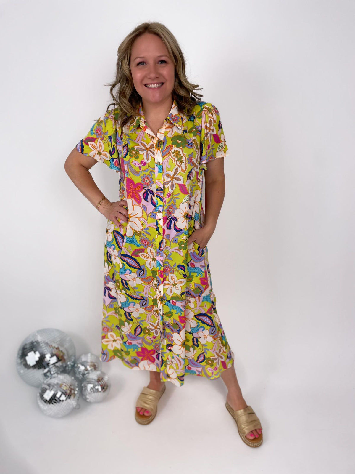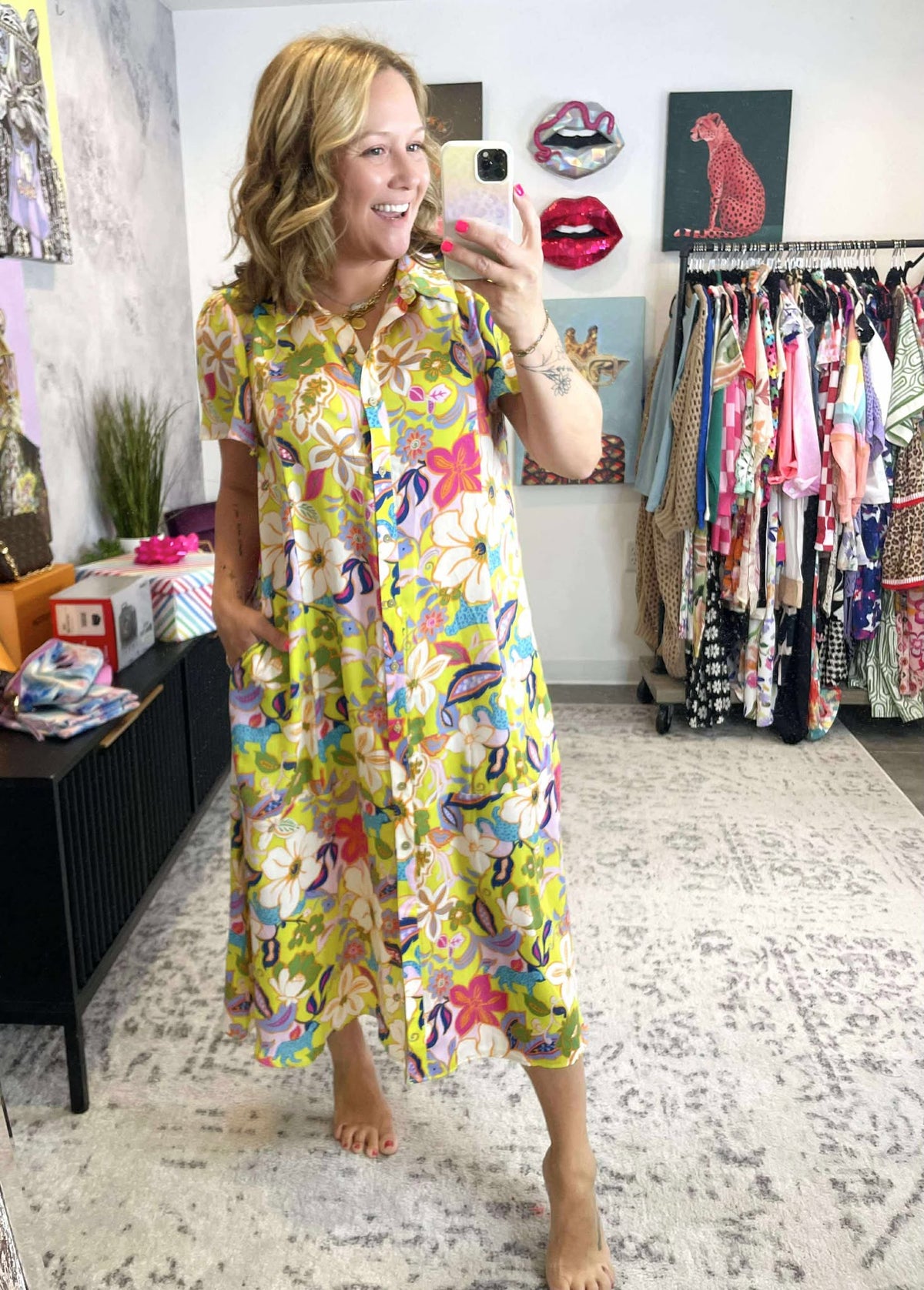 Turn heads in our Secret Garden Satin Shirt Dress! Made with floral print Mirabelle satin, this dress features a button down front, collared neckline, short sleeves, side slits, and pockets. Its loose and relaxed fit provides ultimate comfort while still looking stylish. Perfect for any occasion!