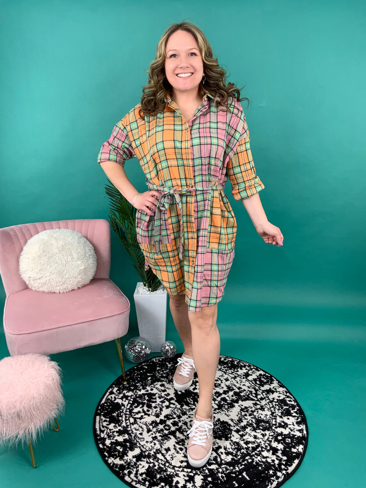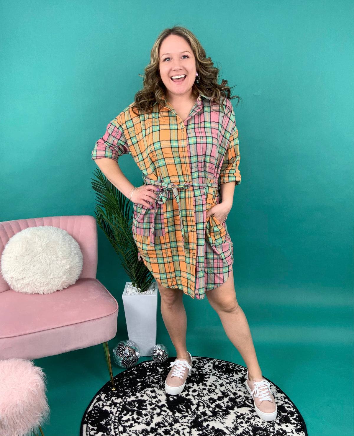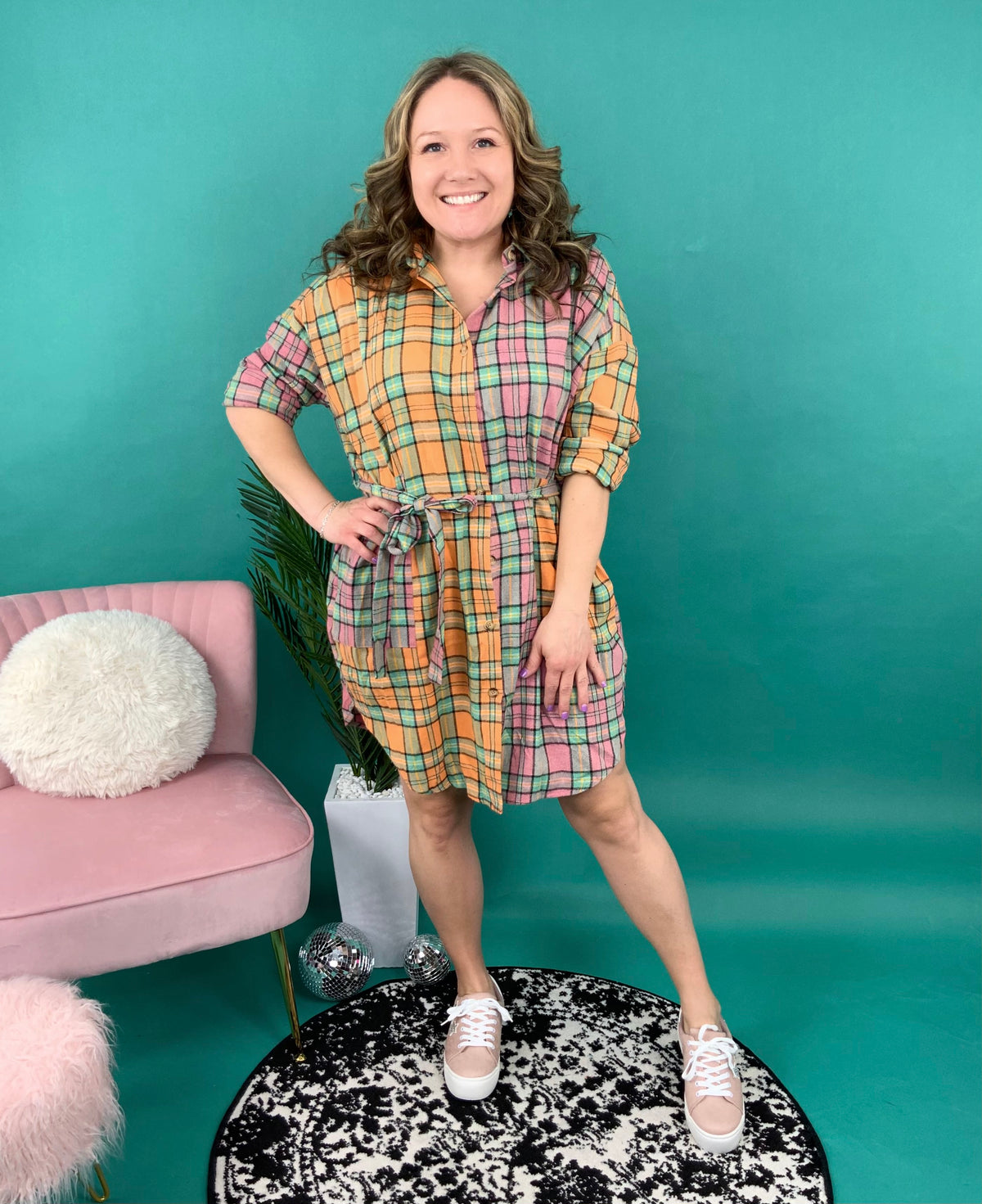 Light up any room when you walk in with this colorful plaid shirt dress on! Keep it casual with some sneakers or dress it up a bit more with sandals. The belt is included.