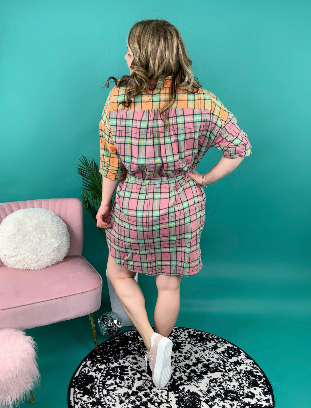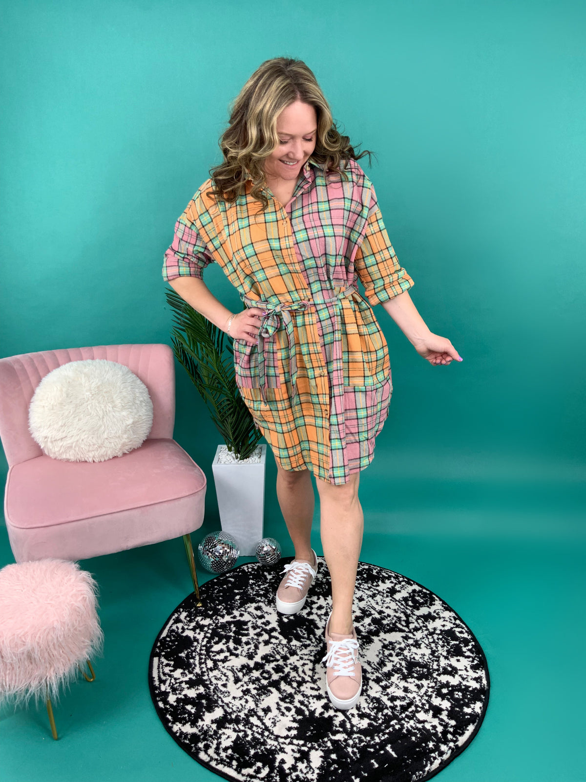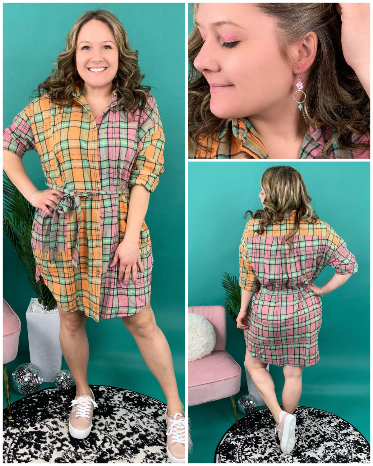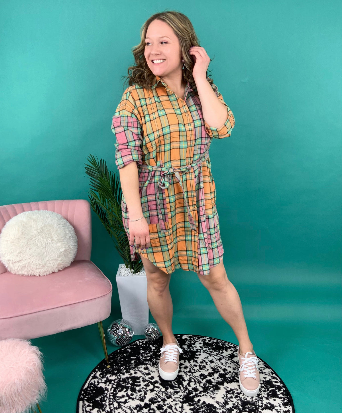 Light up any room when you walk in with this colorful plaid shirt dress on! Keep it casual with some sneakers or dress it up a bit more with sandals. The belt is included.