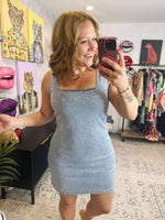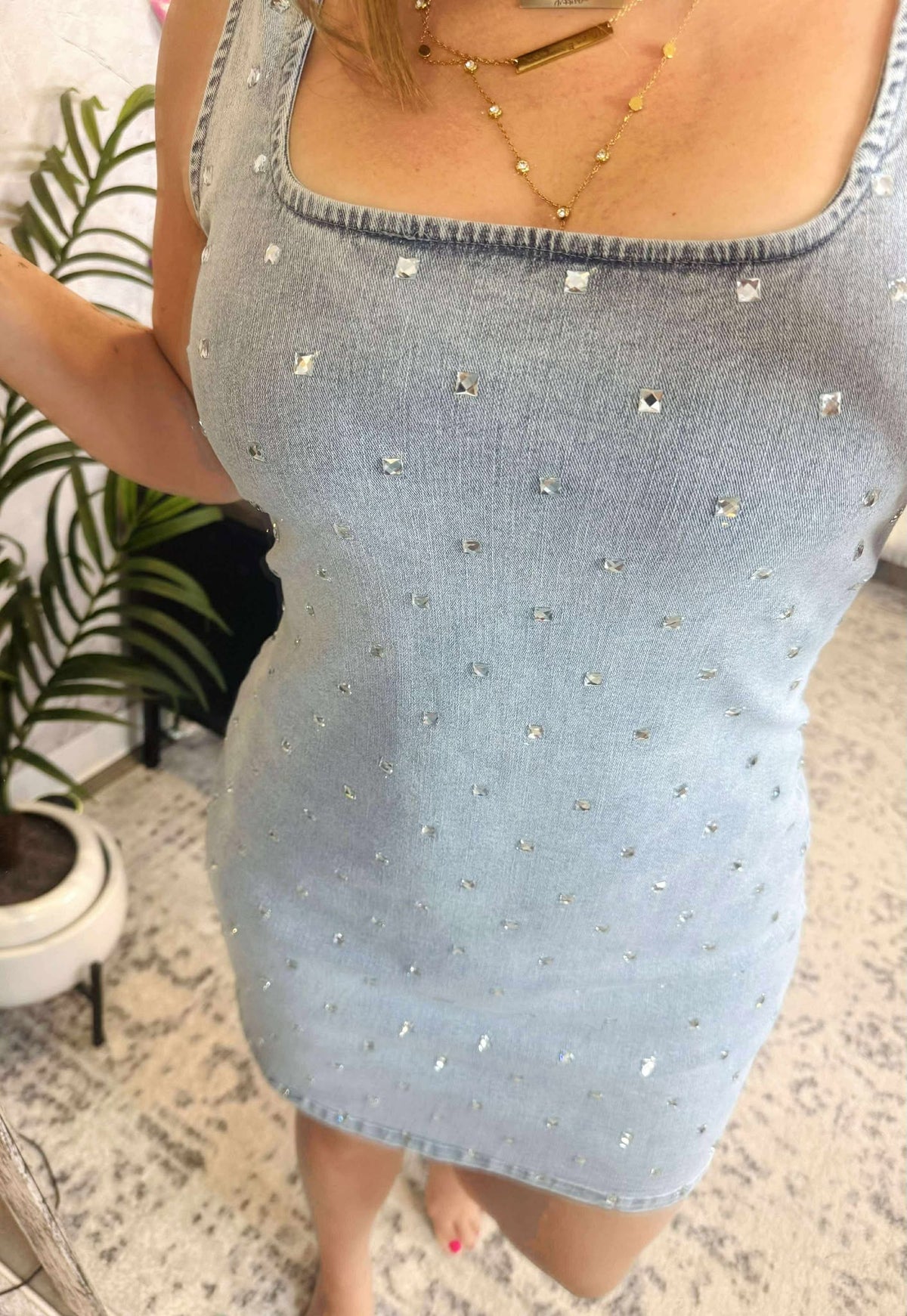 Step into effortless charm with the Denim Dazzle Dress! This sleeveless, solid denim dress features a flirty square neckline and is adorned with sparkling metallic diamond details. Crafted from lightweight knit fabric, it offers a comfortable, true-to-size fit that moves with you. Perfect for sunny days or casual nights out, this dress brings a playful twist to your wardrobe essentials.