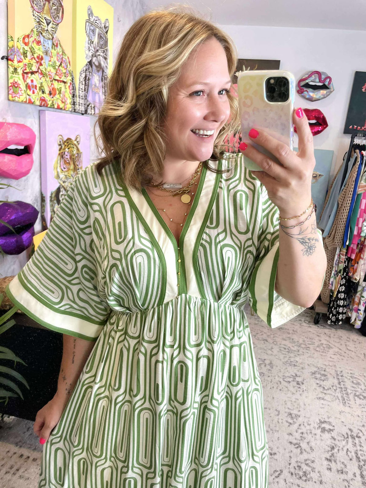 Unleash your playful side with our Dreamscape Maxi Dress! This pullover maxi dress features an abstract print, v-neck, ¾ sleeves, and an elasticated high empire waist for a comfortable and flattering fit. The accented trimmed border adds a quirky touch, while the lining and lightweight fabric make it perfect for any occasion.