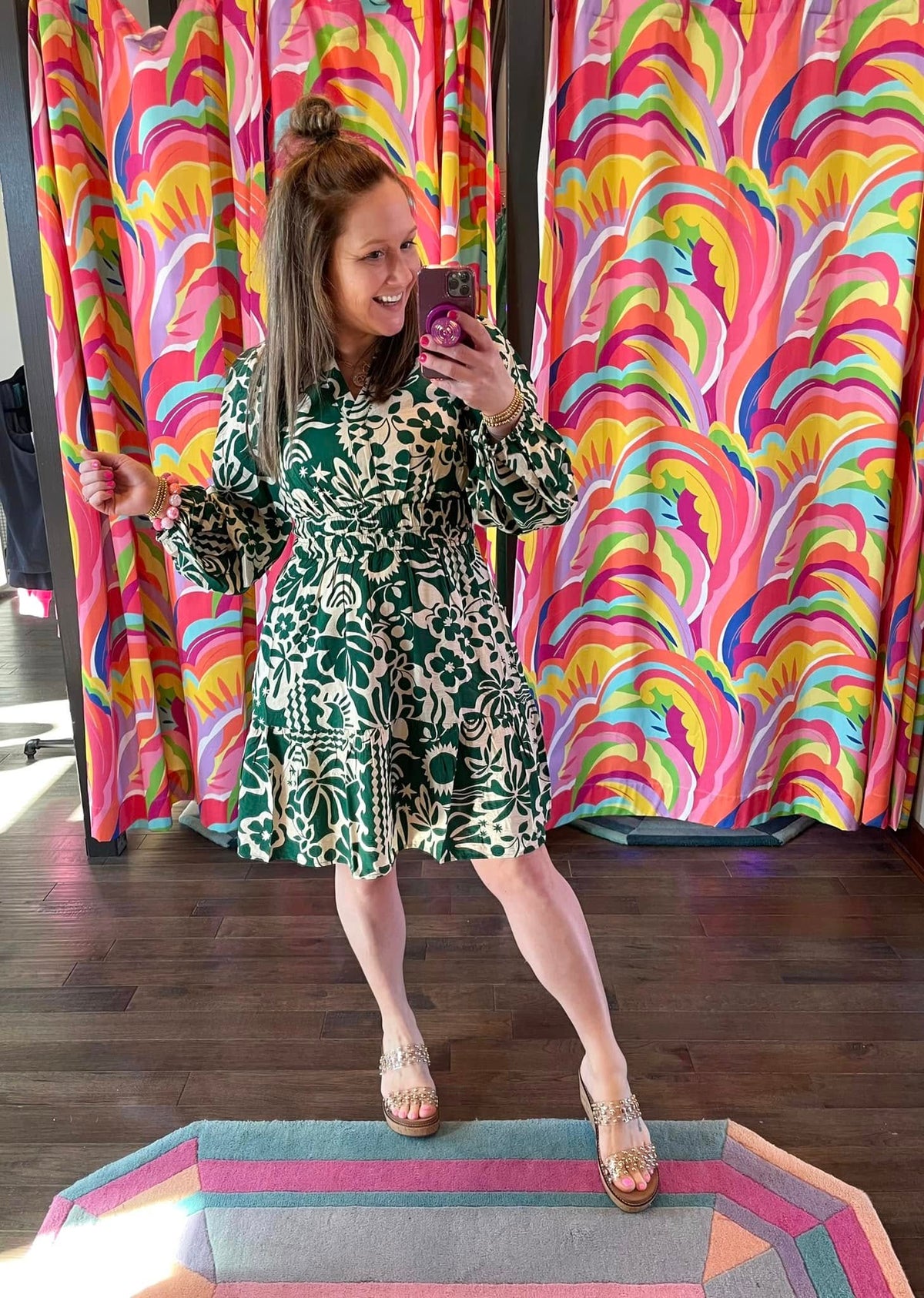 Escape to paradise in the Lush Escape Dress! Featuring a vibrant tropical print, this dress will transport you to a sunny getaway. The long sleeves and elastic waist provide comfort, while the placket detailing adds a touch of sophistication. Get ready to turn heads and feel like a tropical goddess in this playful dress.