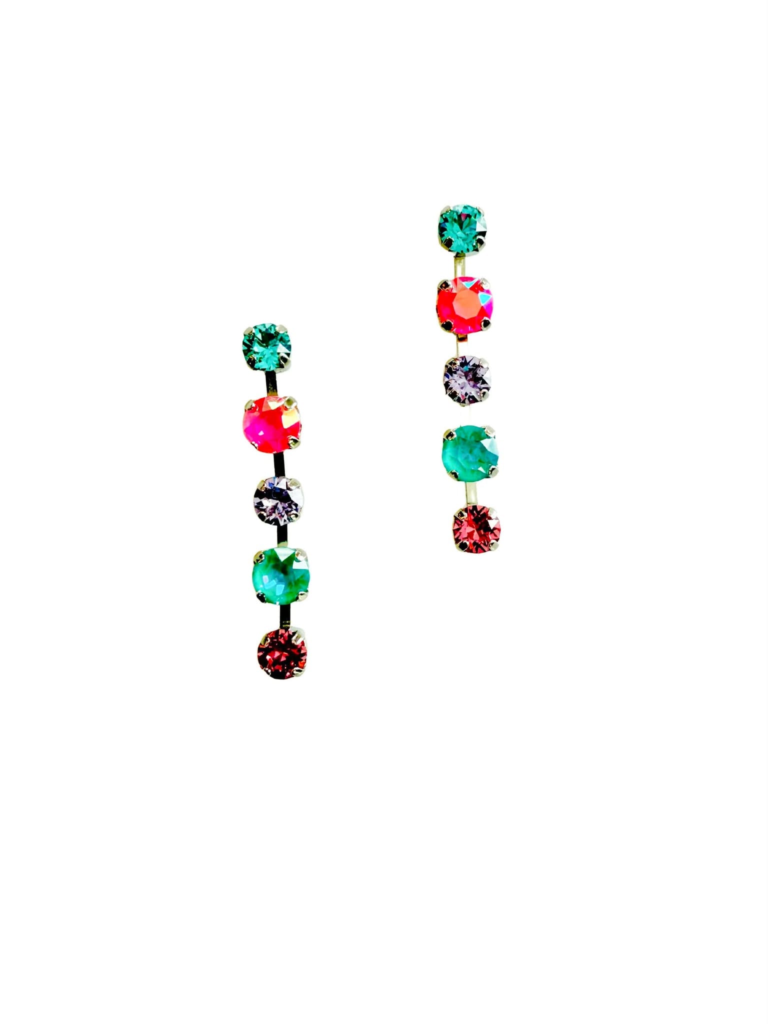 Delicate Drop Earrings set into Shiny Silver Metal with Crystals in Turquoise, Ultra Pink AB, Violet, Rose, and Laguna