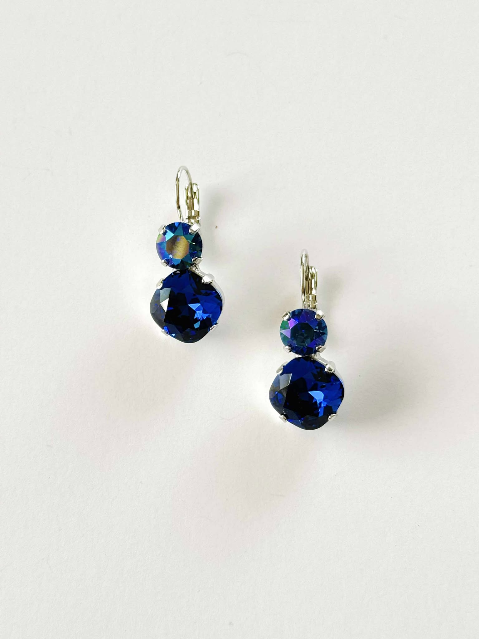 Double Drop Square Cushion Cut Earrings in Dark Sapphire + Sapphire Glacier Blue set into Silver Plated Metal.