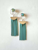 Turquoise Tassel Earrings set into Shiny Silver Metal with Crystals in Light Turquoise AB