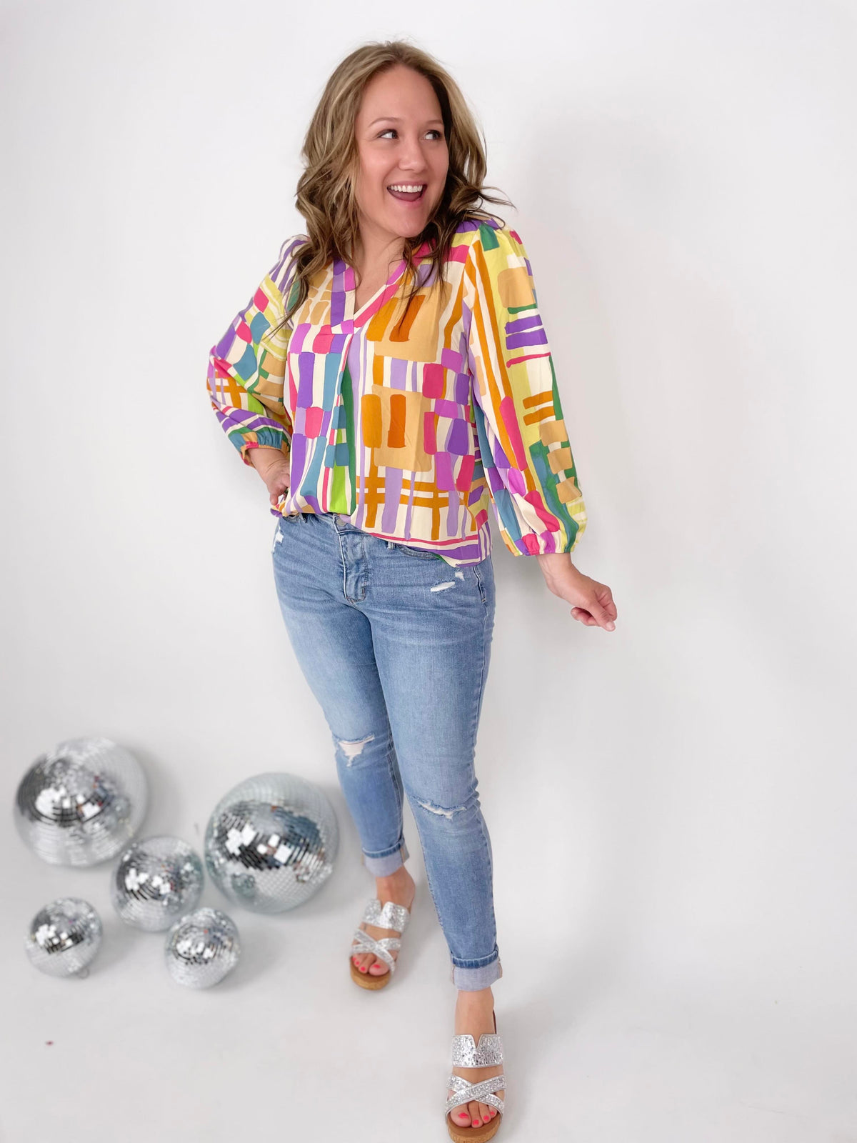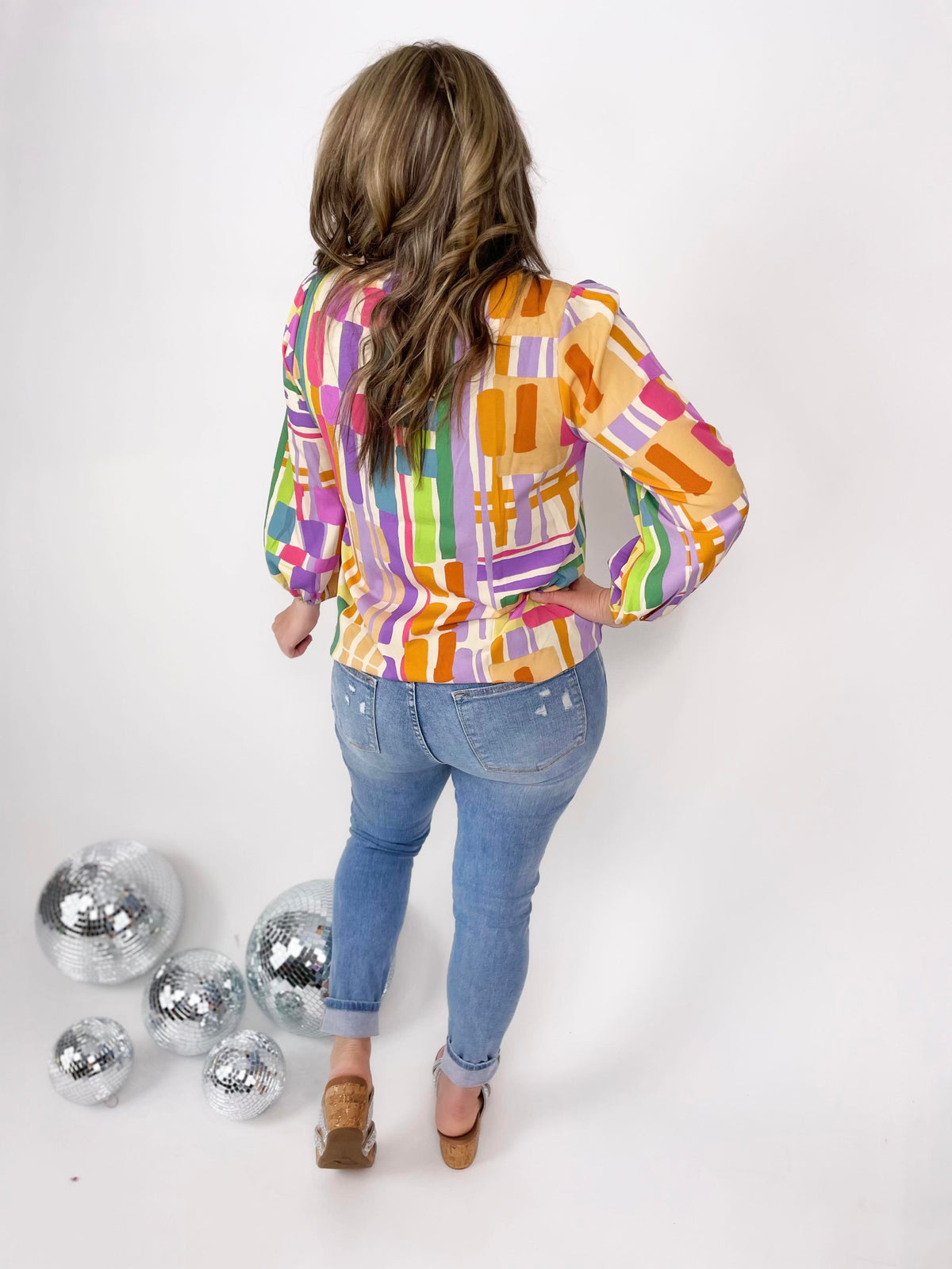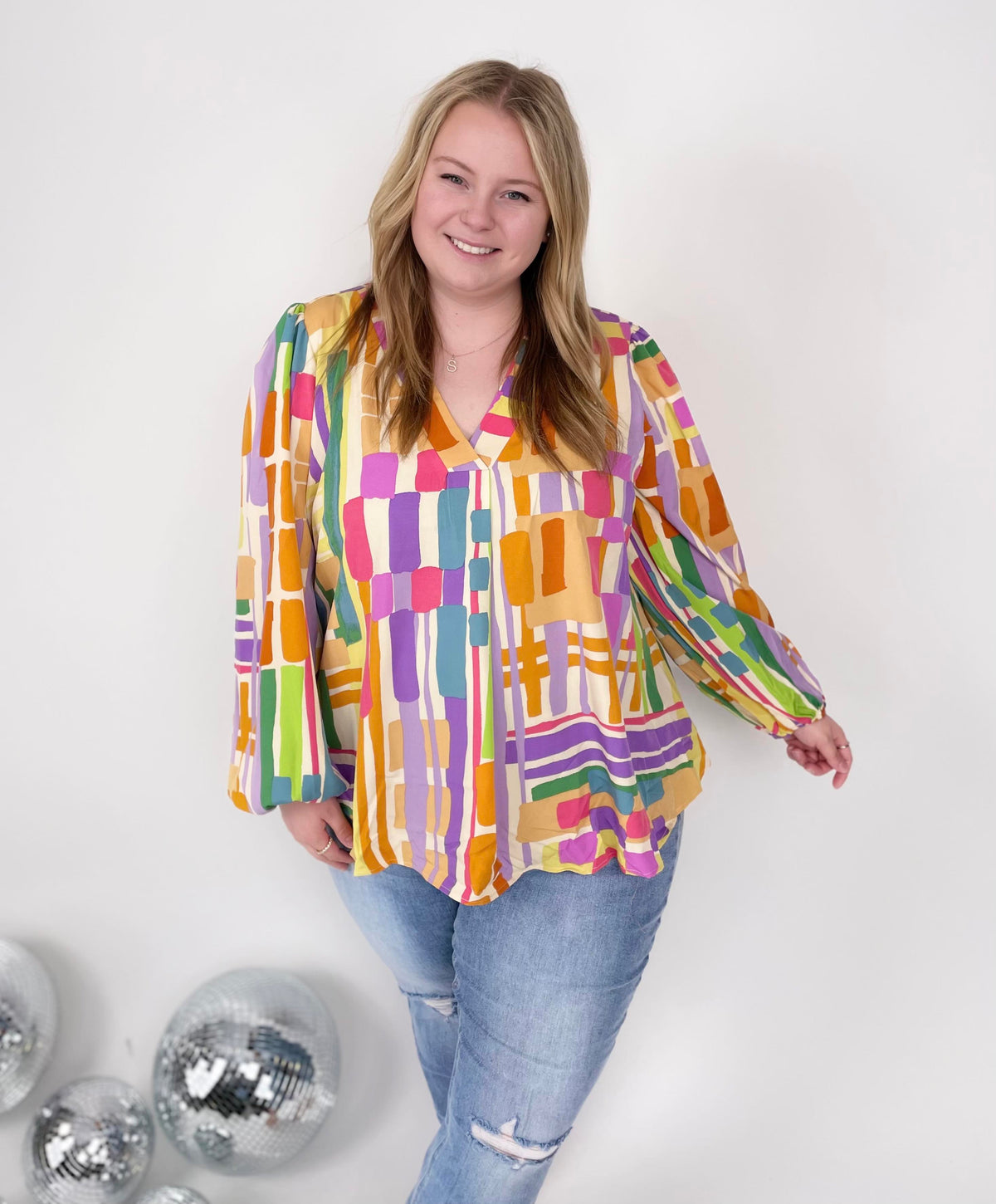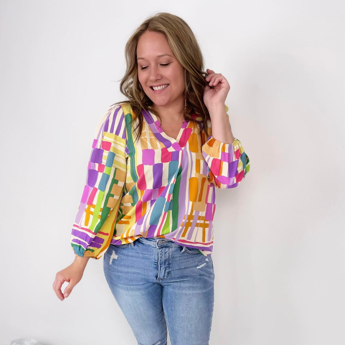 Let your style shine with our Abstract Vision Top. This multicolored print top features a flattering v-neckline, billowy balloon sleeves, and an effortless fit for all-day comfort. No need to worry about transparency, as this top is non-sheer. Perfect for adding a pop of color to any outfit.