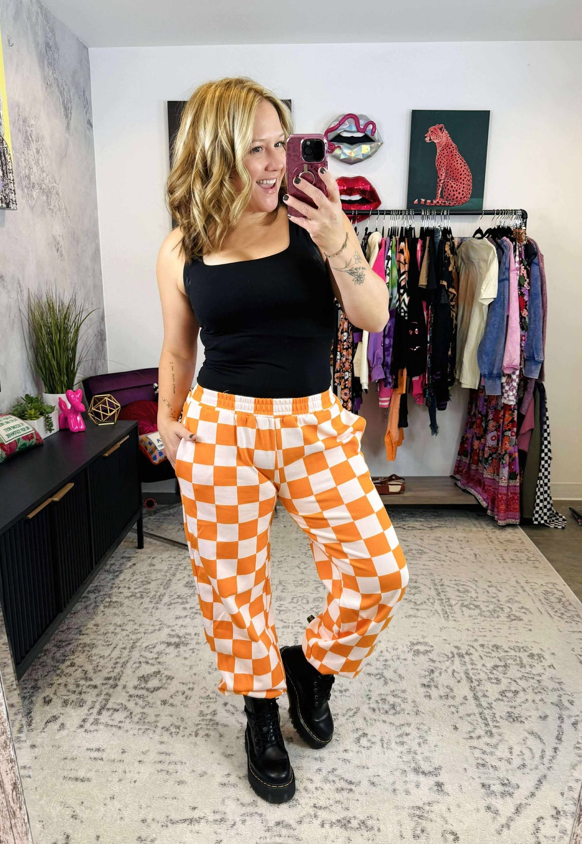 Add a pop of fun to your casual look with these Ampersand Checkered Joggers in Pumpkin Spice. Featuring a vibrant orange and white checkered pattern, they bring playful energy to your everyday wear. Soft and comfy, these joggers are perfect for lounging or stepping out with a smile. Embrace comfort without sacrificing style!