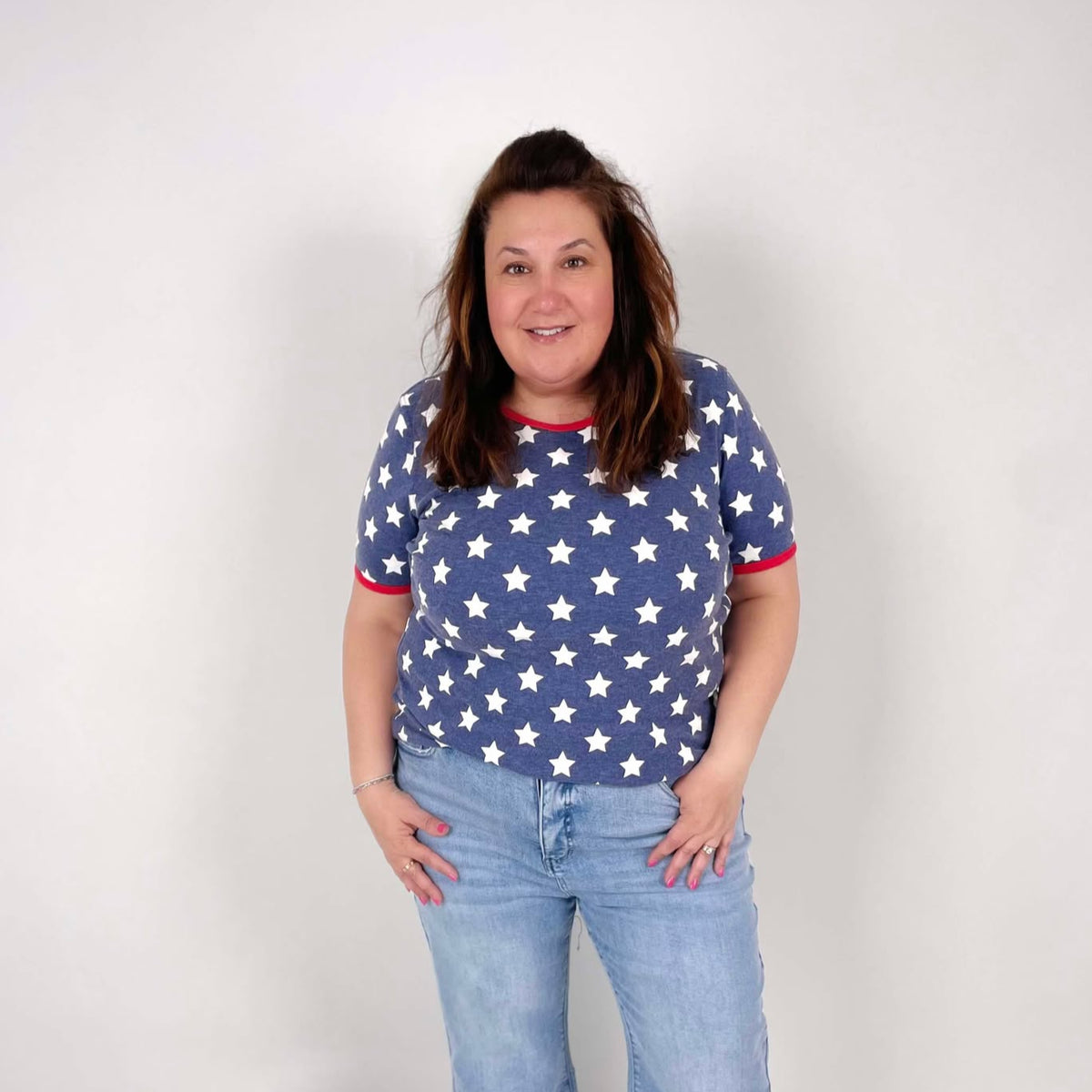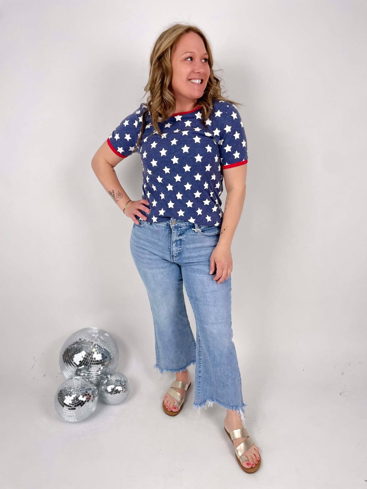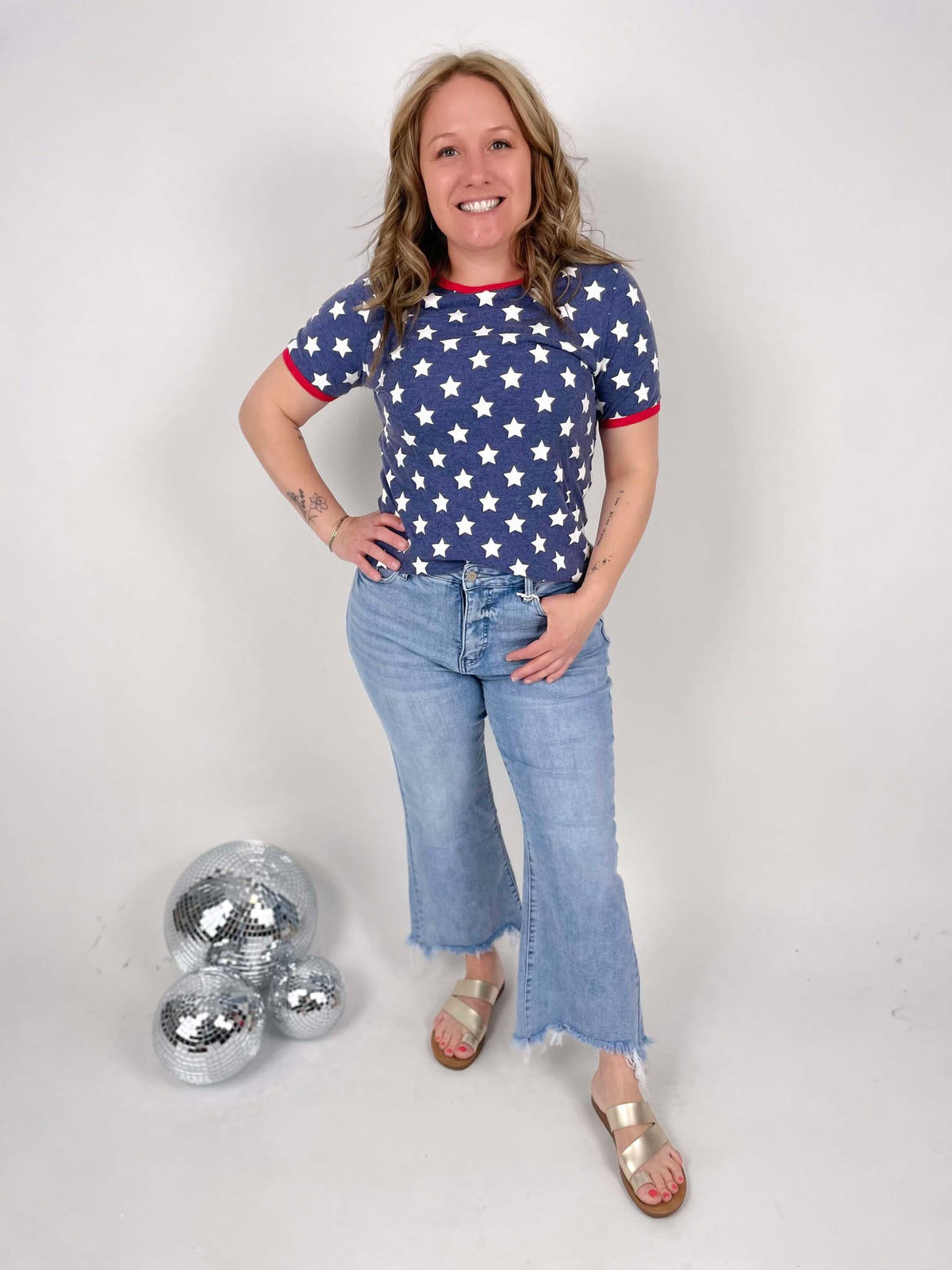 Embrace your patriotic pride with the Lady Liber-Tee by Ampersand Avenue! Featuring a vibrant blue base adorned with white screen printed stars and eye-catching red accents, this tee is perfect for any festive occasion. Designed with medium stretch fabric, it provides a comfortable fit that is true to size for a slim silhouette, with the option to size up for a more relaxed look. Made from a blend of cotton, polyester, and spandex, this tee is both soft and durable, ideal for celebrating in style.