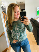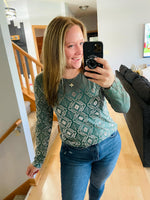 Unleash your inner bohemian with our Aztek Turquoise + Velvet Mesh Top. The silver velvet aztec design adds a touch of iridescent luxury, while the mesh top keeps you feeling cool and breezy. Perfect for adding a bit of quirk to any outfit.