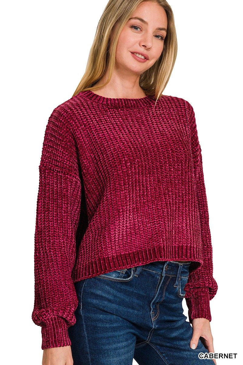 Introducing our Chenille Comfort Crop Sweater - the perfect blend of softness and weight for ultimate coziness. With a round neck and a flattering crop cut, this sweater is both stylish and comfortable. So go ahead, indulge in some "chill"enille!