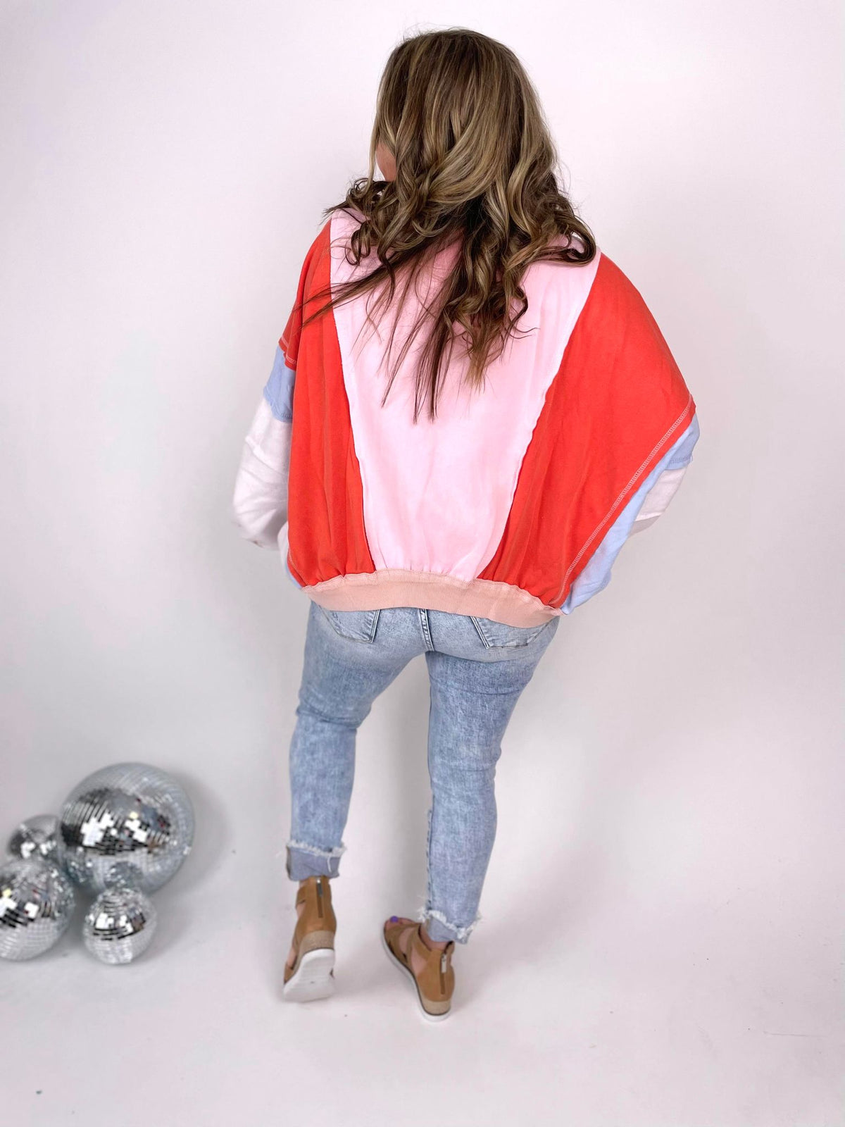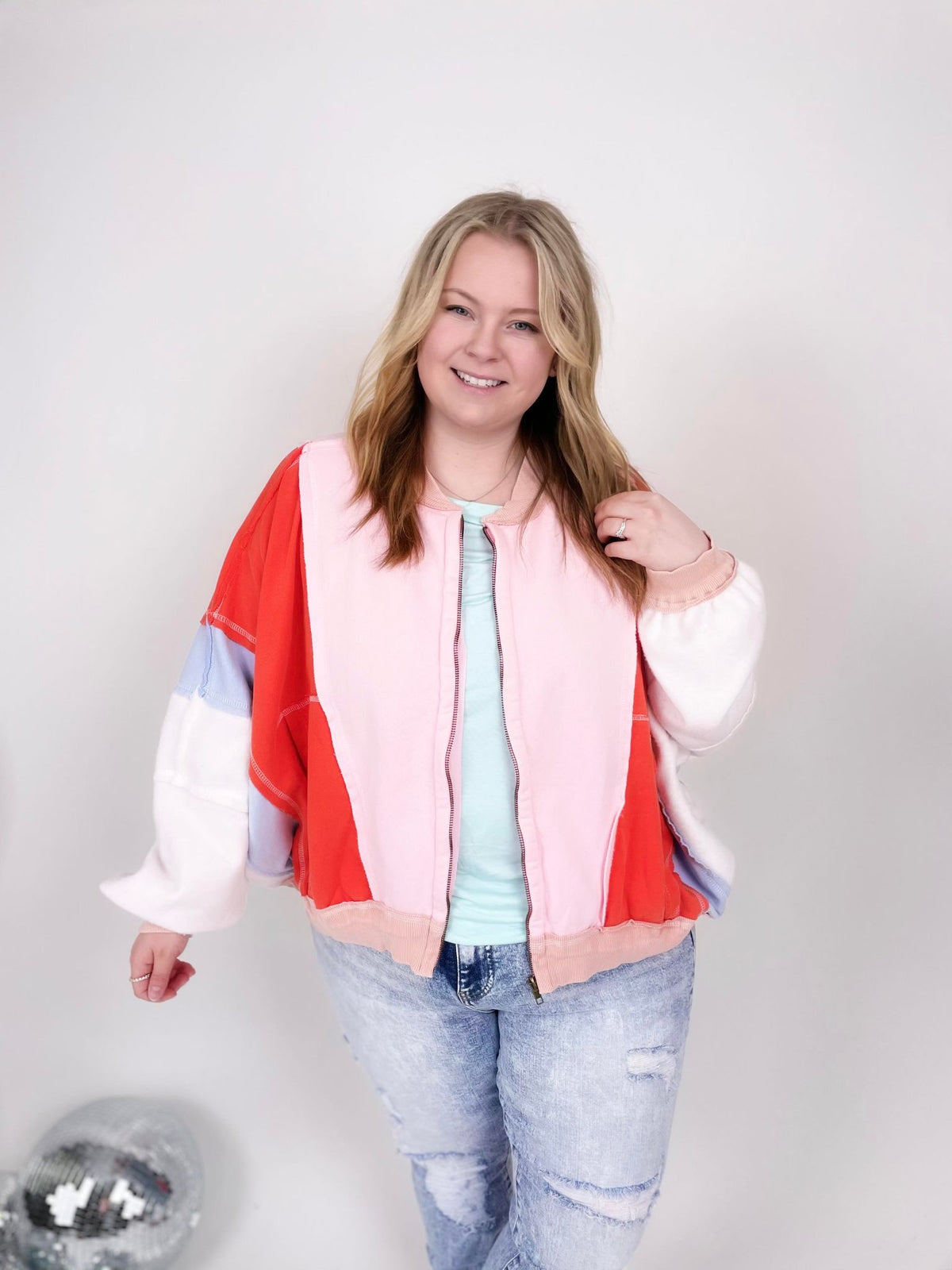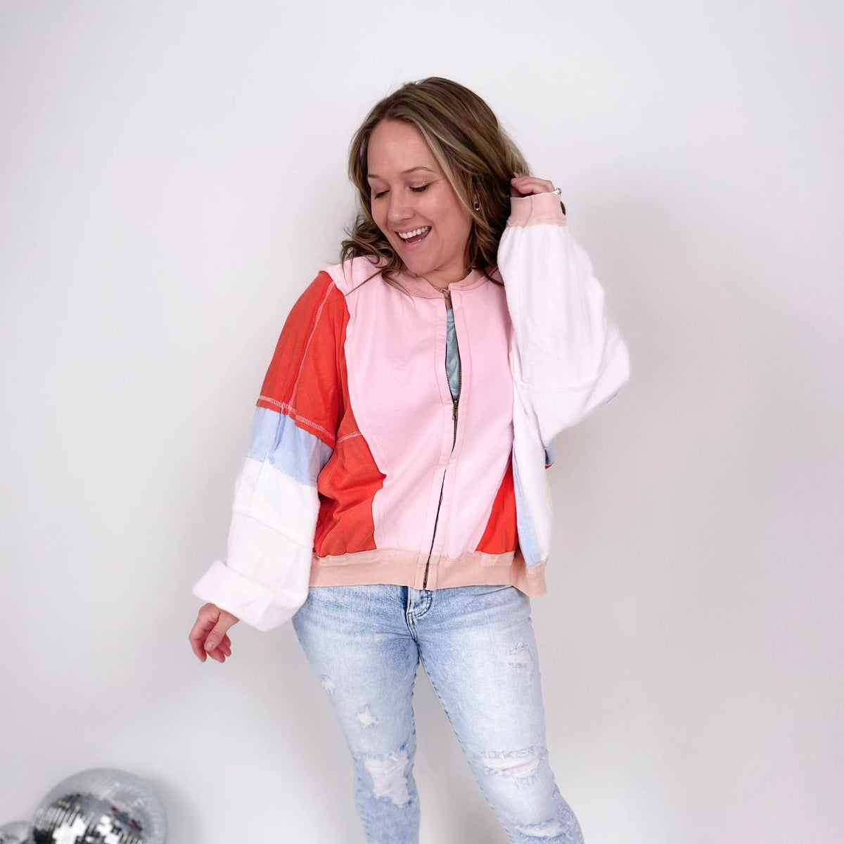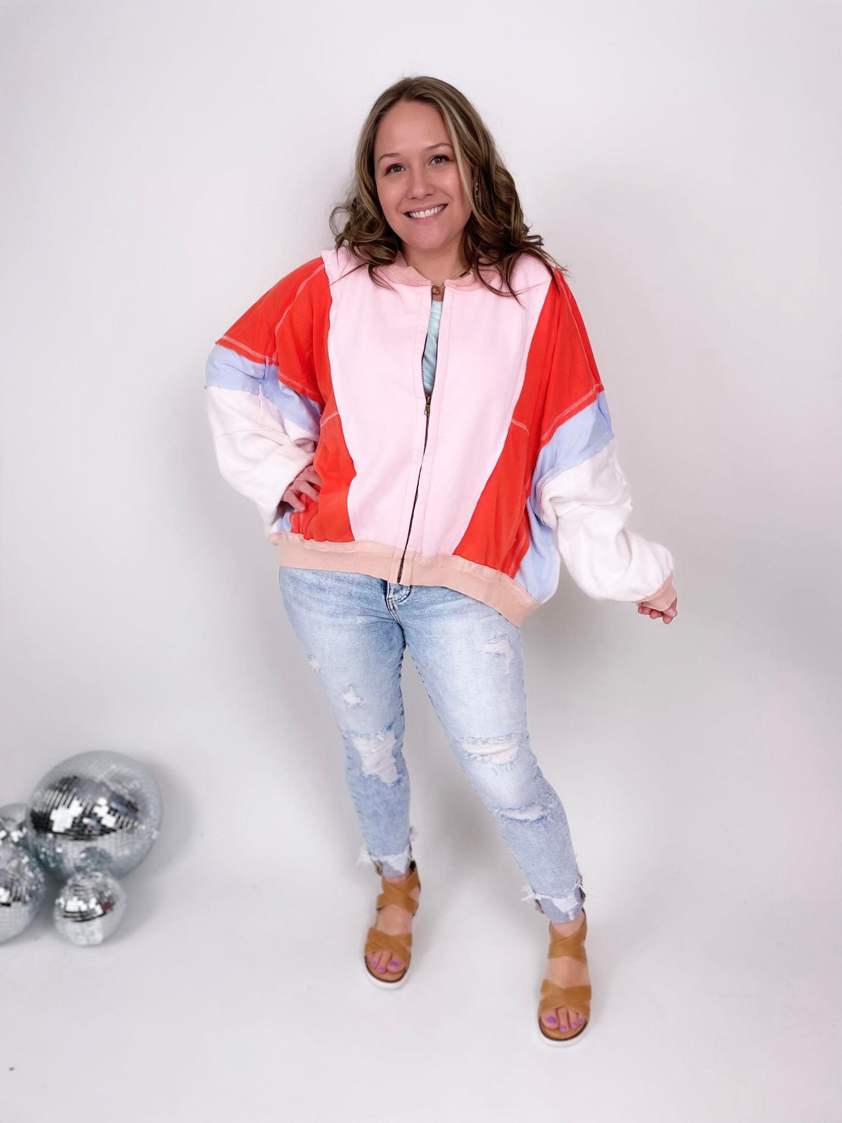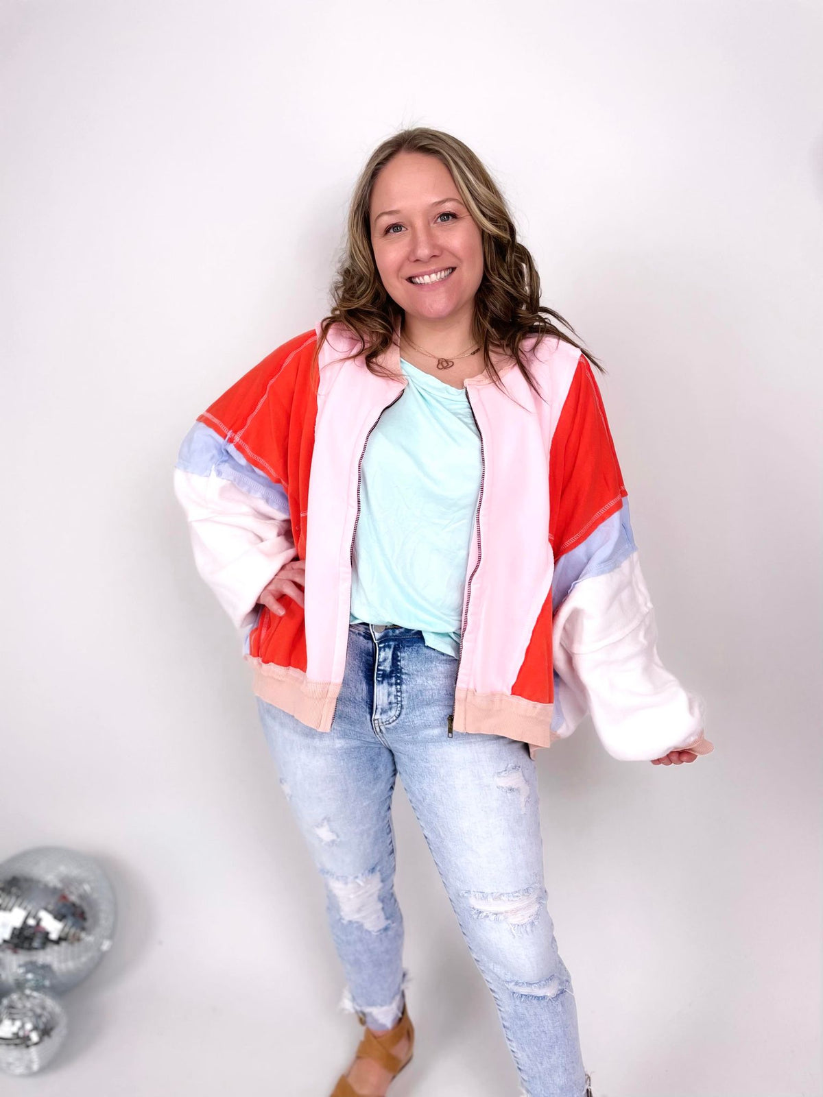 Unleash your colorful side with our Colorwave Jacket. Its unique colorblock design will make you stand out while the long drop-shoulder puff sleeves and reverse stitch detail add a touch of playful fun. The raw edge adds a trendy touch. Get ready to turn heads!
