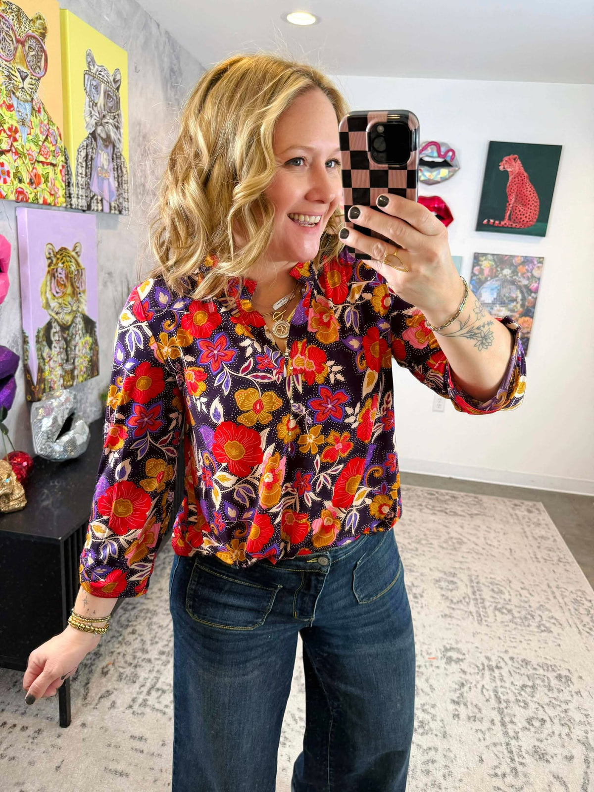 Our signature Lizzy Top is crafted from a soft, luxurious poly blend that offers lightweight, wrinkle-free comfort. Designed for easy care, this travel-friendly top is cooler than linen, making it the ultimate choice for life on the go. The Lizzy also features a mandarin collar neckline and 3/4" length sleeves with tab details. Its relaxed, flowy fit and subtle high-low hemline ensure a flattering silhouette for any occasion.