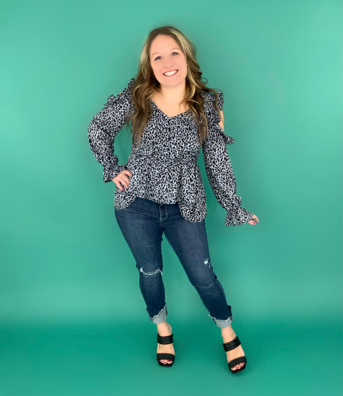We just know you are eyeing up this beauty and we say it's time to spoil yourself....deal? This top is nothing but fabulous and we are all about the leopard print and cold shoulder! It brings you in at the waist for a totally flattering look. This just needs some skinny jeans and heeled booties!