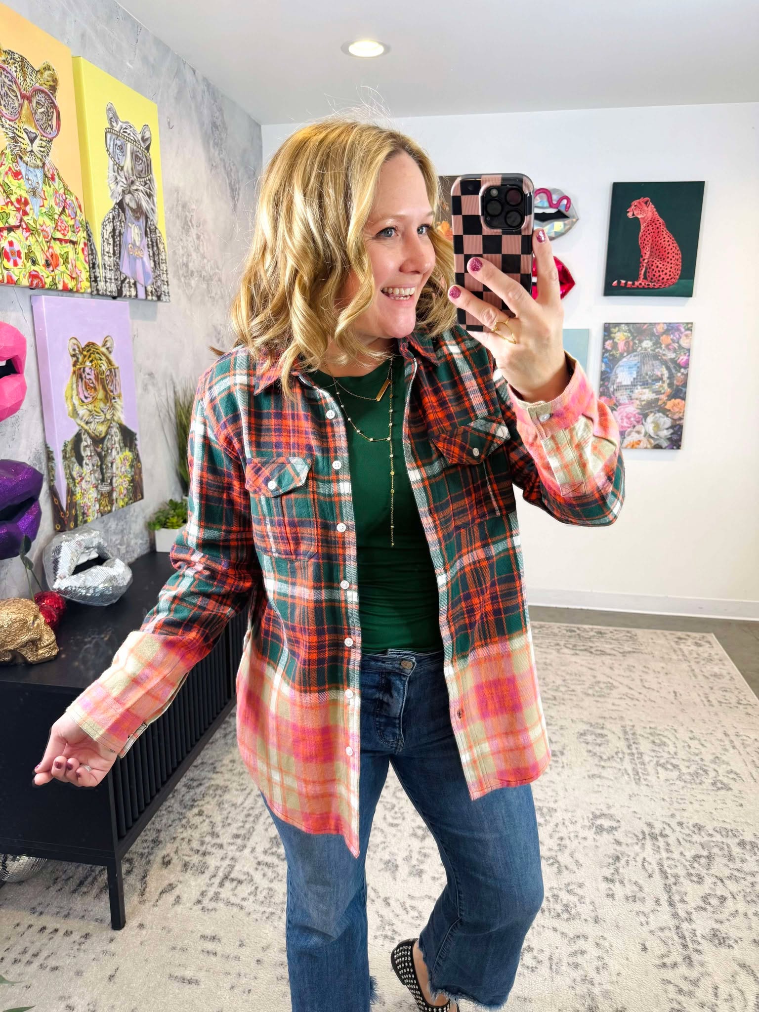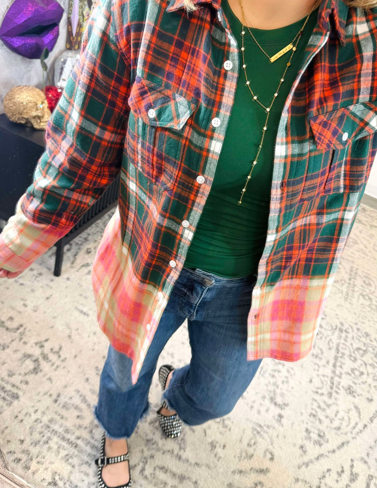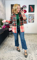 Get ready to jingle all the way in this playful Green, Navy, Orange, and White plaid flannel! Made from 100% soft and cozy cotton, with a trendy bleached dipped contrast, this flannel is perfect for adding a touch of fun and style to your wardrobe. Don't miss out on this quirky and unique piece!