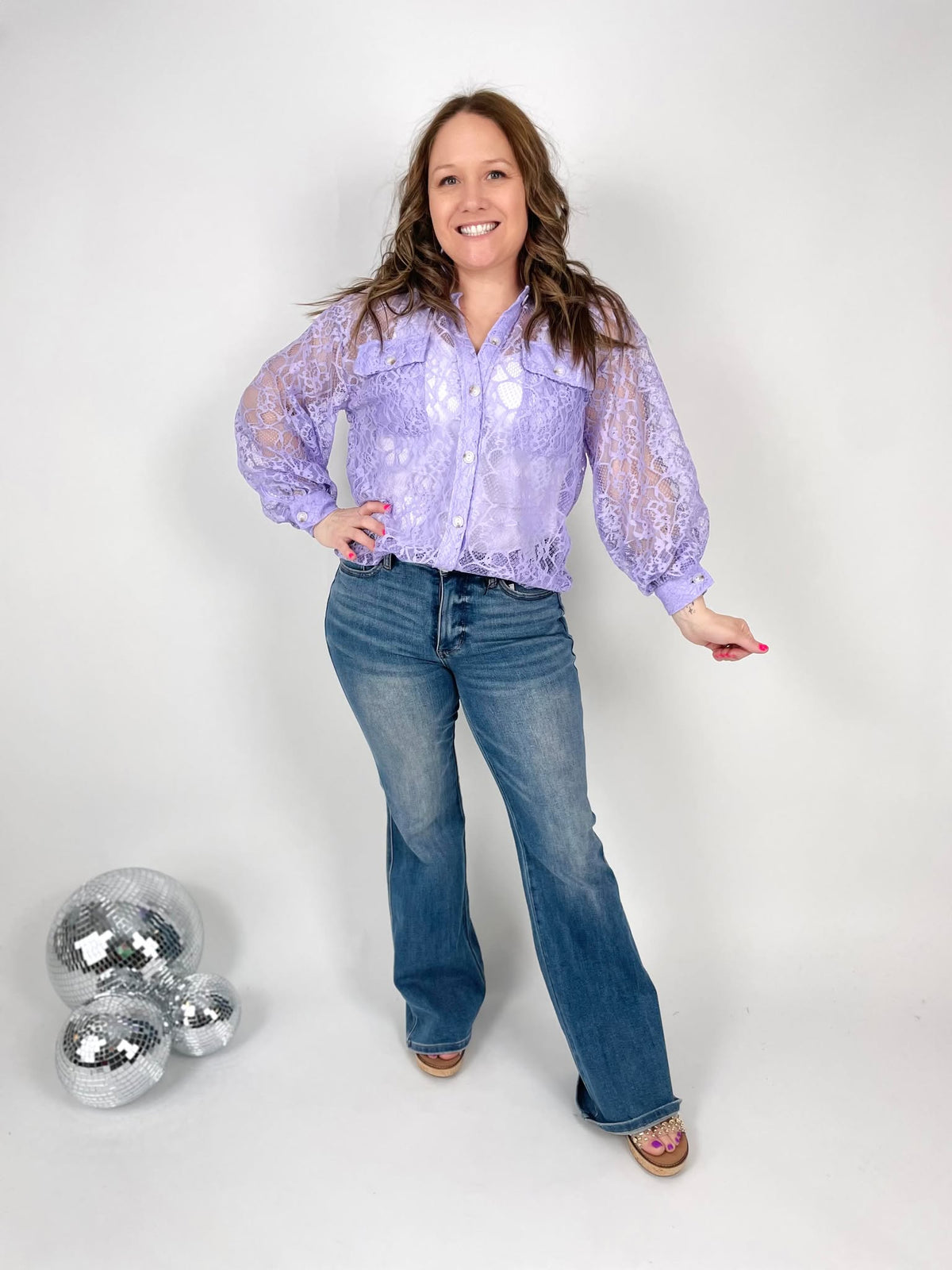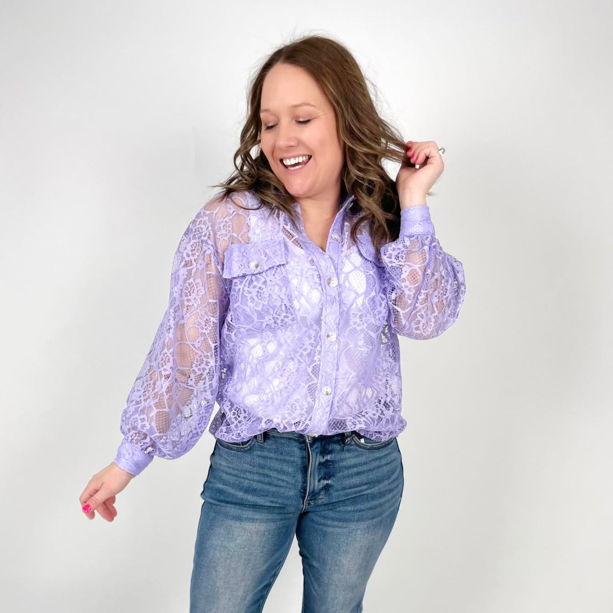 Upgrade your wardrobe with our Lace Cascade Shacket Blouse. This fun and flattering shacket blouse features an all-over lace design, button detail, and pockets. Perfect for layering with your favorite tank top and adding a touch of playfulness to your look. Must-have for any fashion-forward individual!