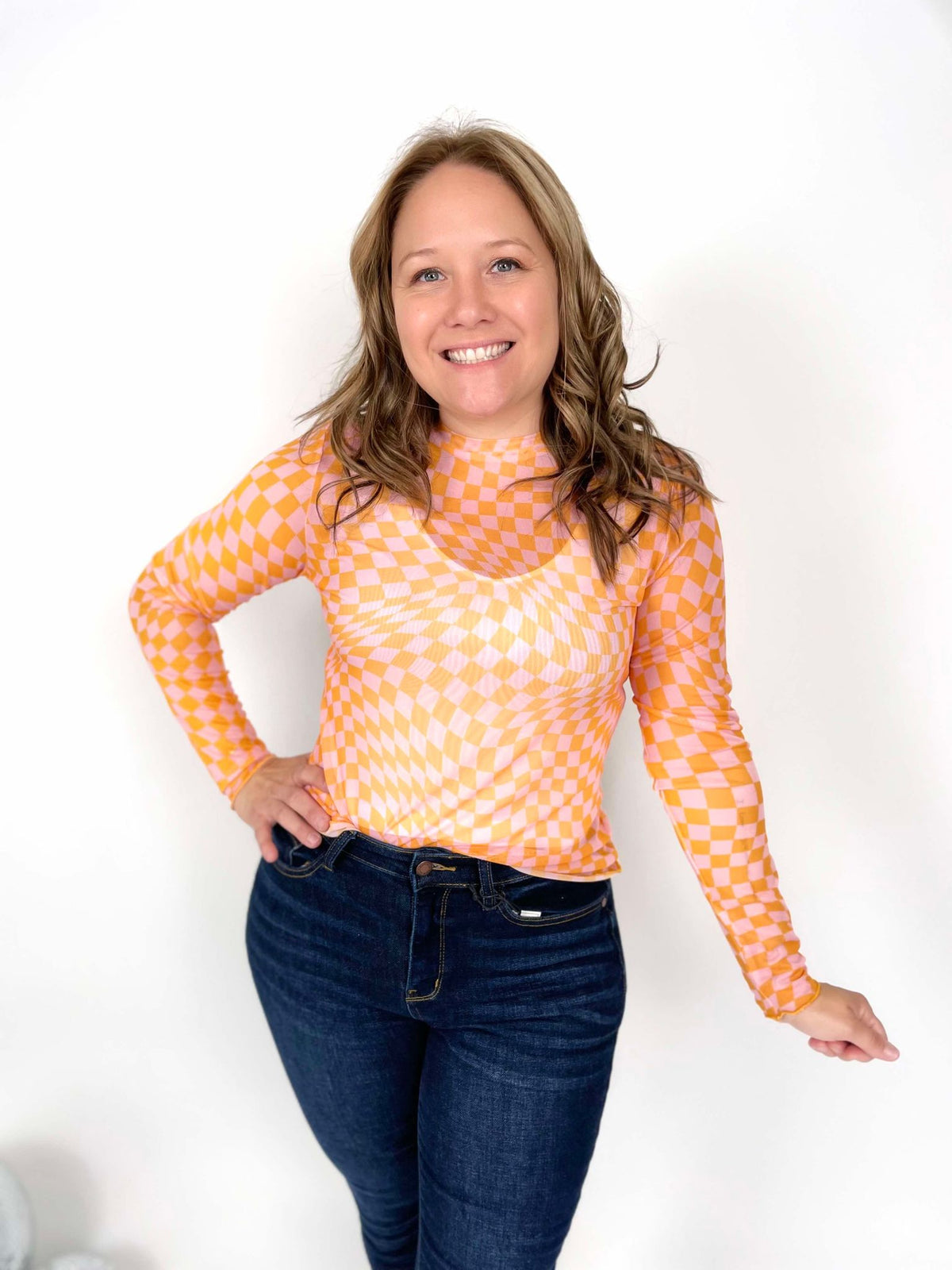 Unleash your playful side with our Mesh Mosaic Checkered Top. Made with breathable mesh for ultimate comfort and style. Perfect for any occasion, its long sleeves add a stylish touch to its bold checkerboard print. Get ready to turn heads and make a statement!