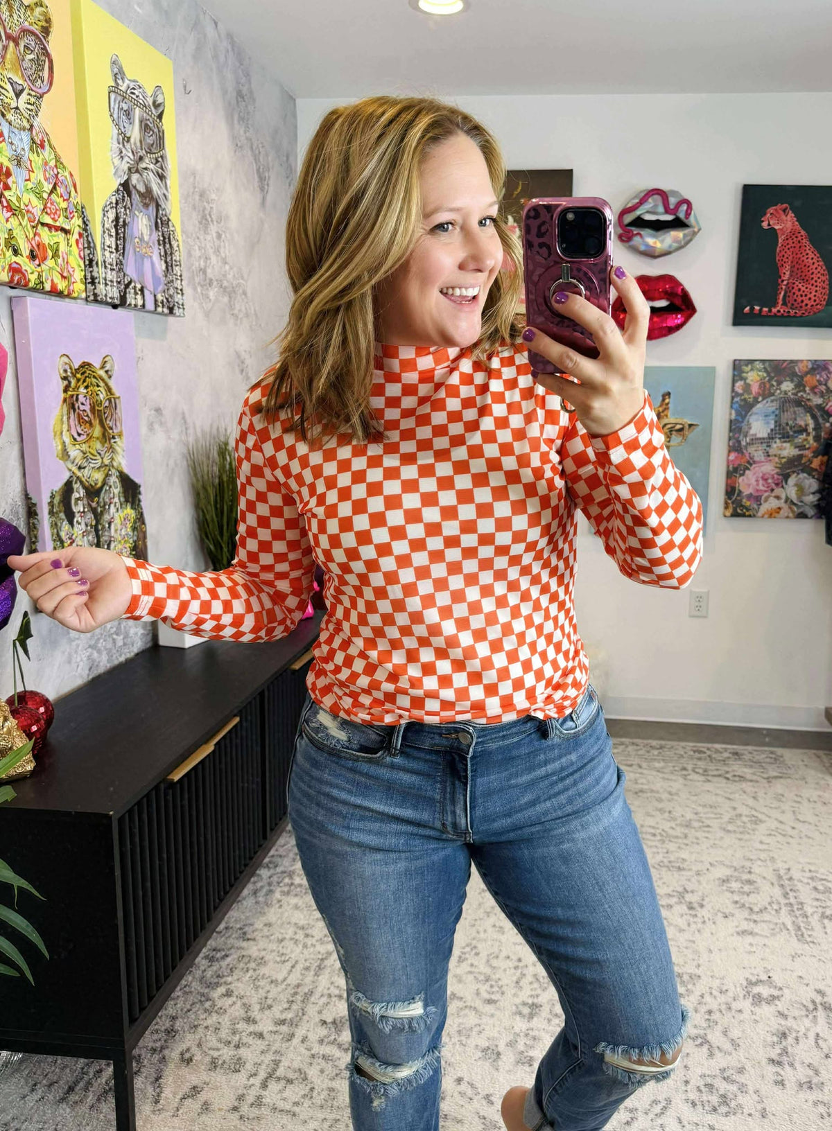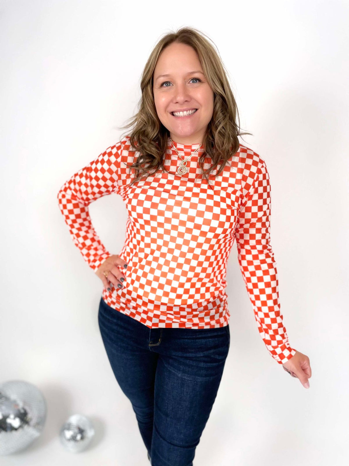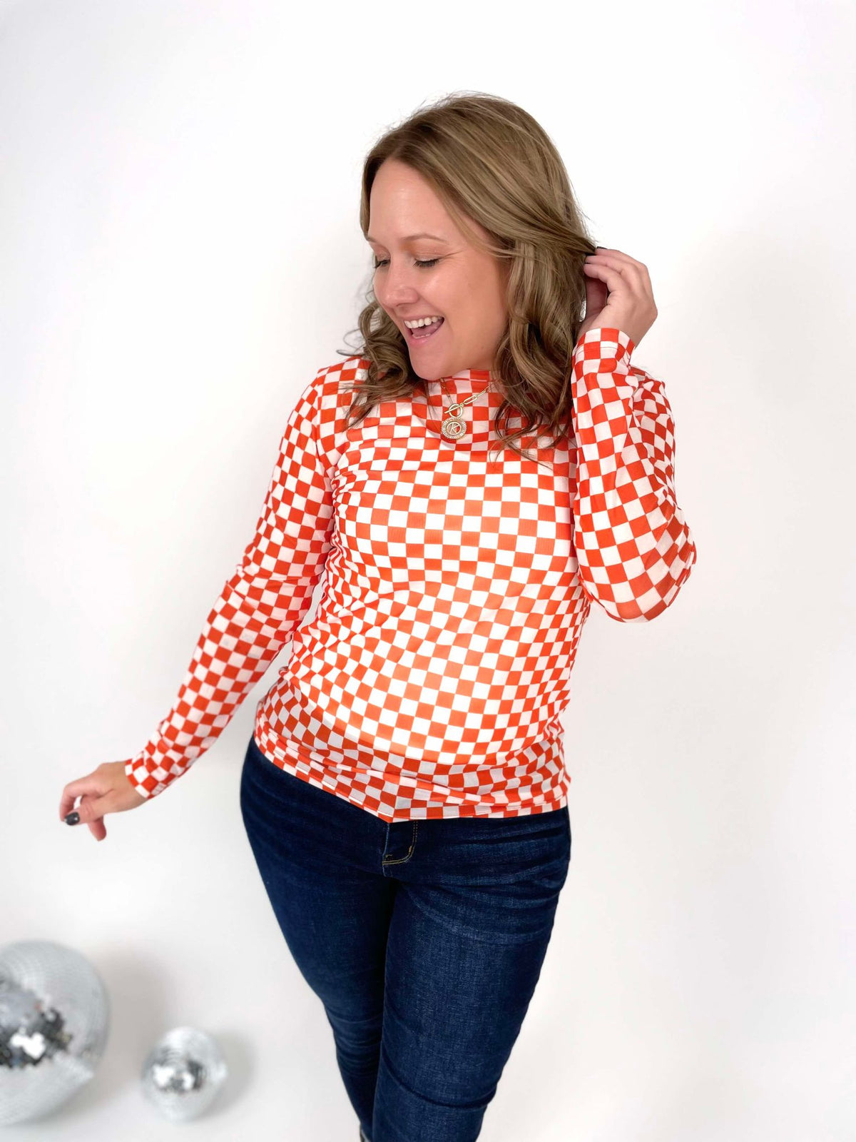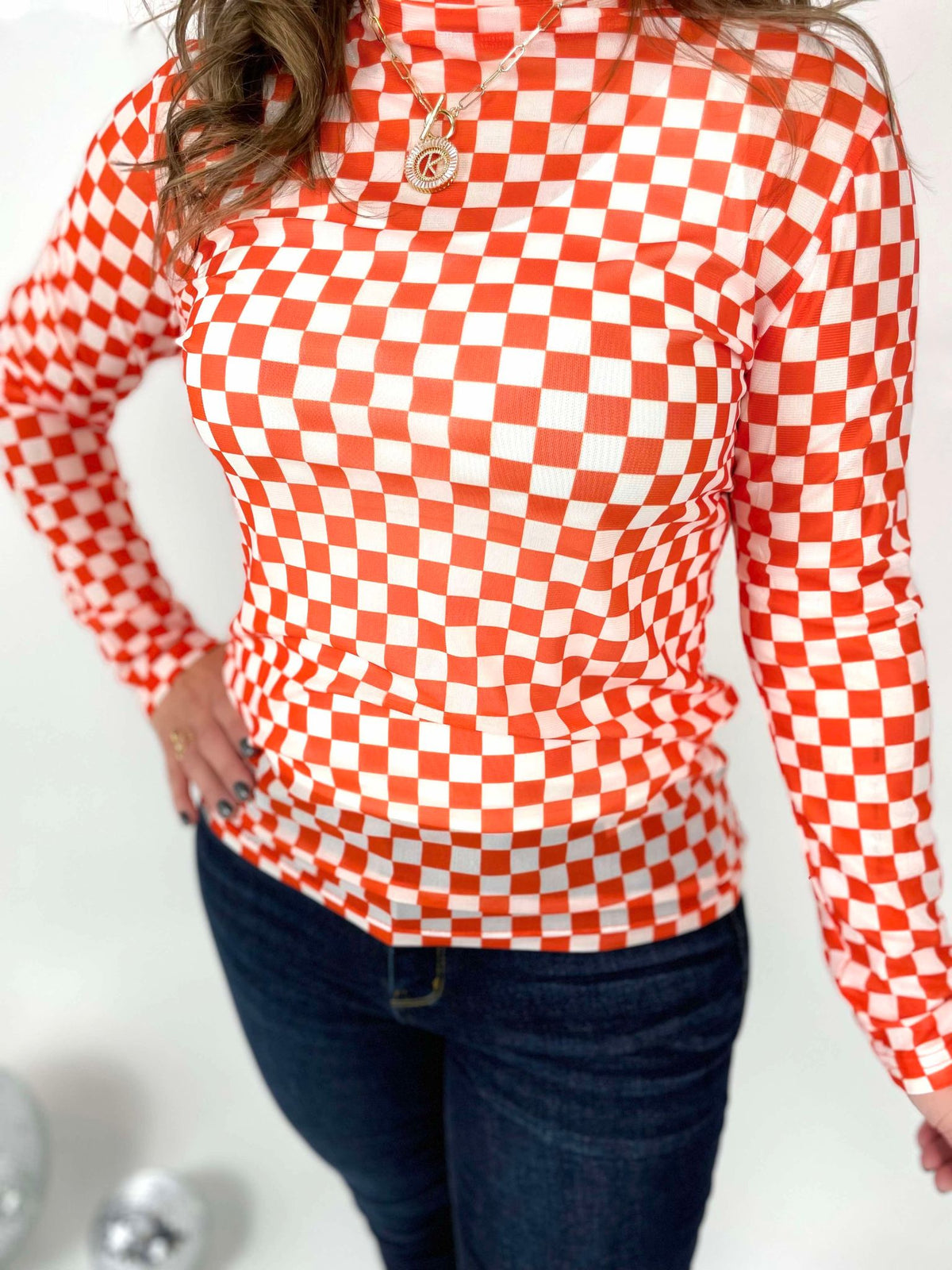 Get ready to 'cheer' on the style game with our Pep Rally Mesh Top! This orange and white checked top will surely add some 'zest' to your wardrobe. Made with breathable mesh, it's perfect for those hot summer days. So why 'check' out the competition when you can stand out with our top!