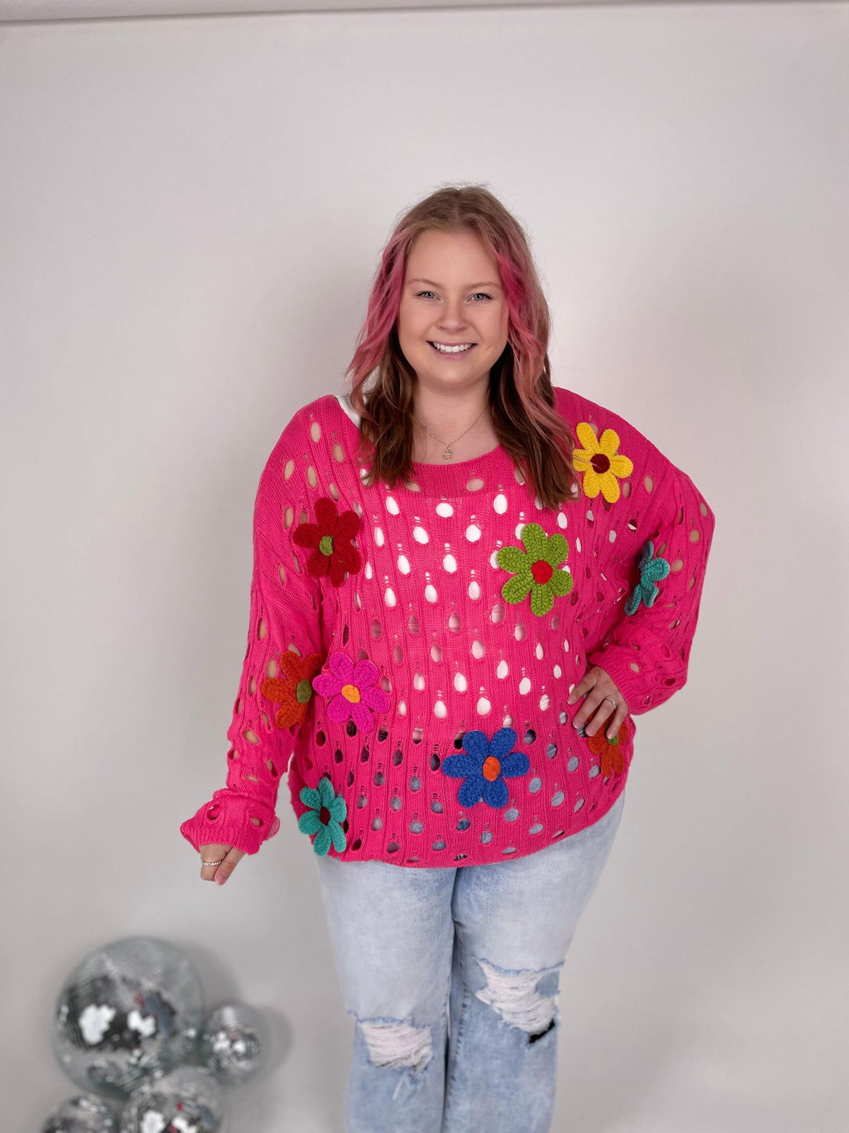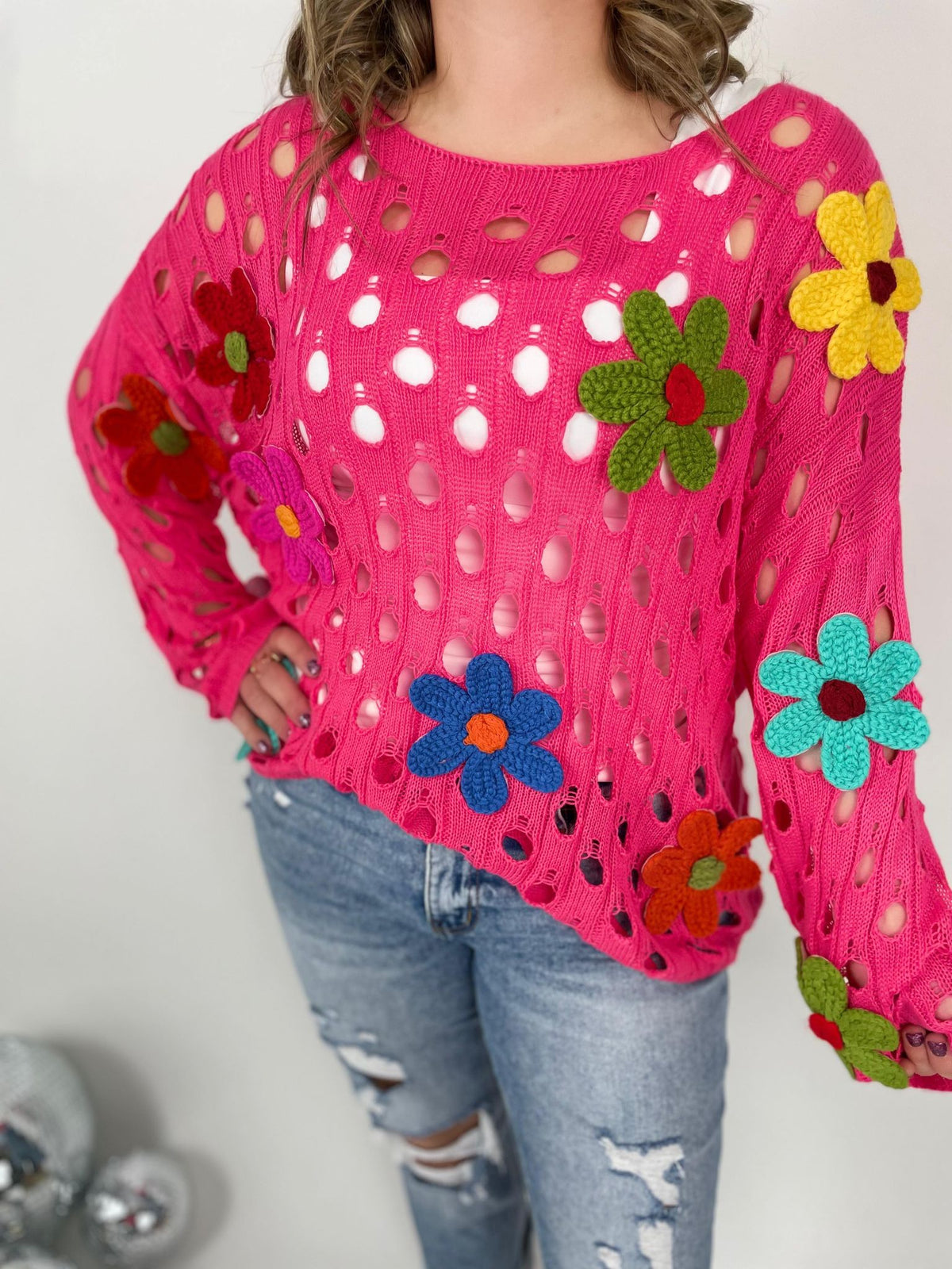 Add a playful touch to your wardrobe with our Perforated Petal Sweater. The loose fit and lightweight material provide comfort and breathability. The charming flower appliques add a touch of whimsy to this perforated sweater. Perfect for a fun and light-hearted look.