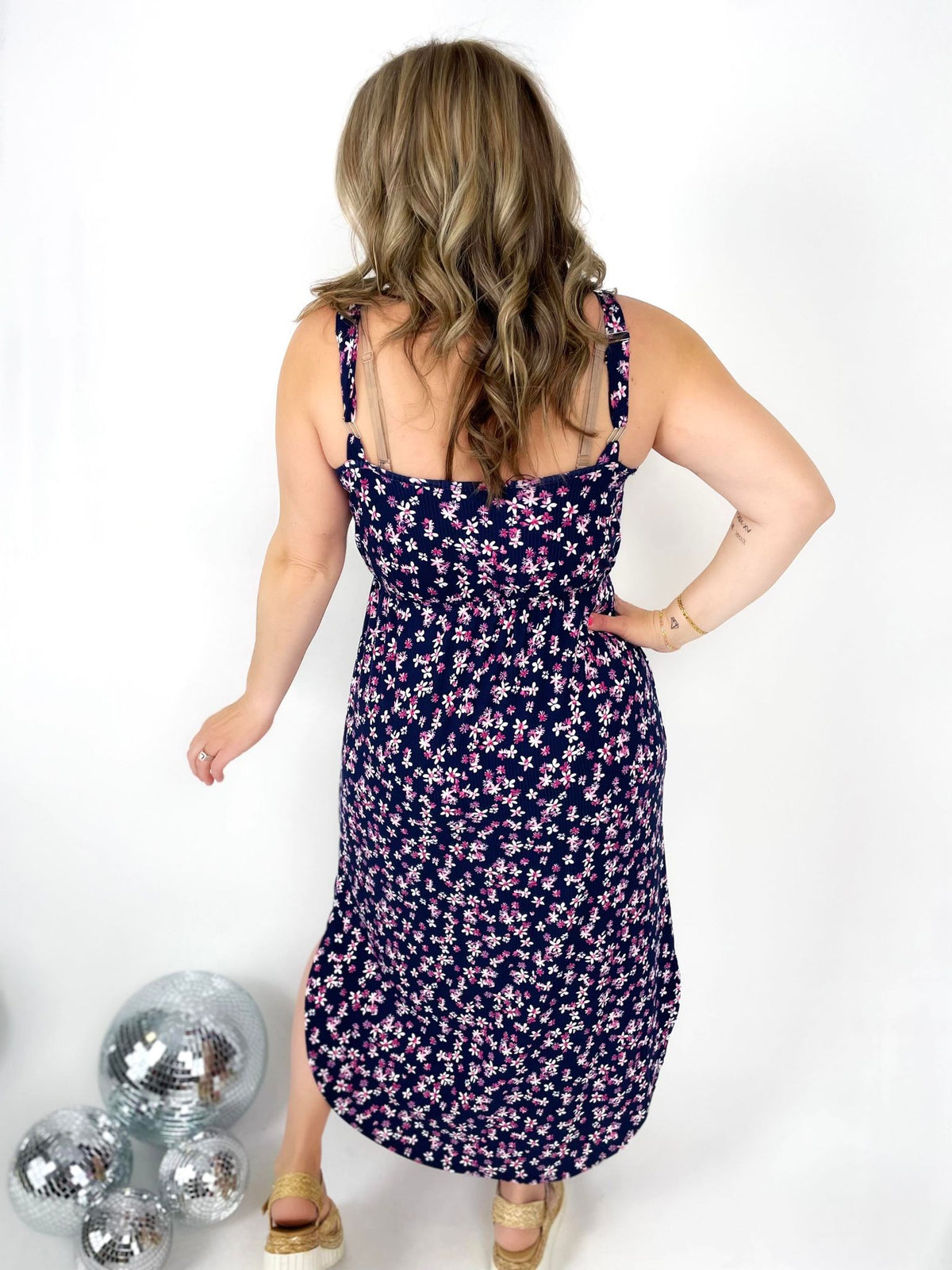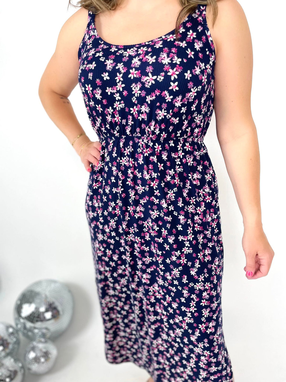 Stay stylish and comfortable with our Raegan Ribbed Midi Dress! Featuring 1" adjustable straps and elastic waist, this navy dress with magenta floral design is perfect for any occasion. The ribbing fabric and side scoop add the perfect touch to this happy and trendy dress.