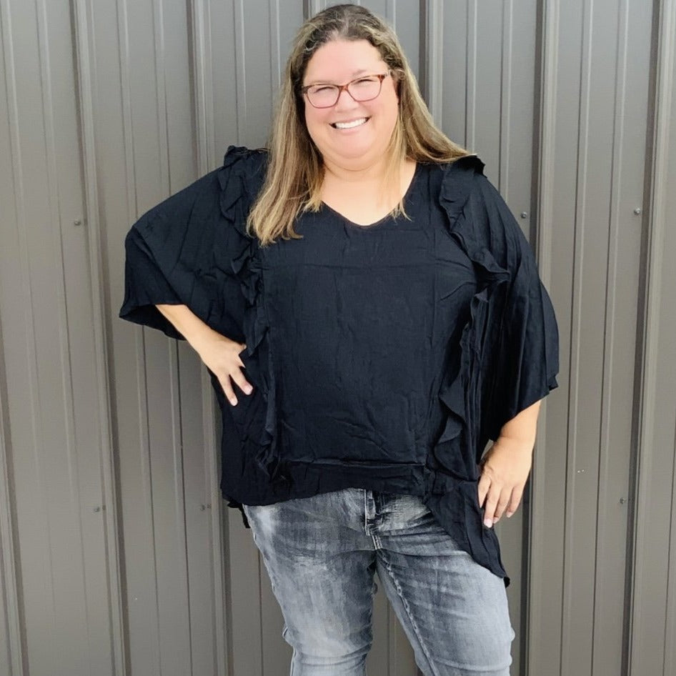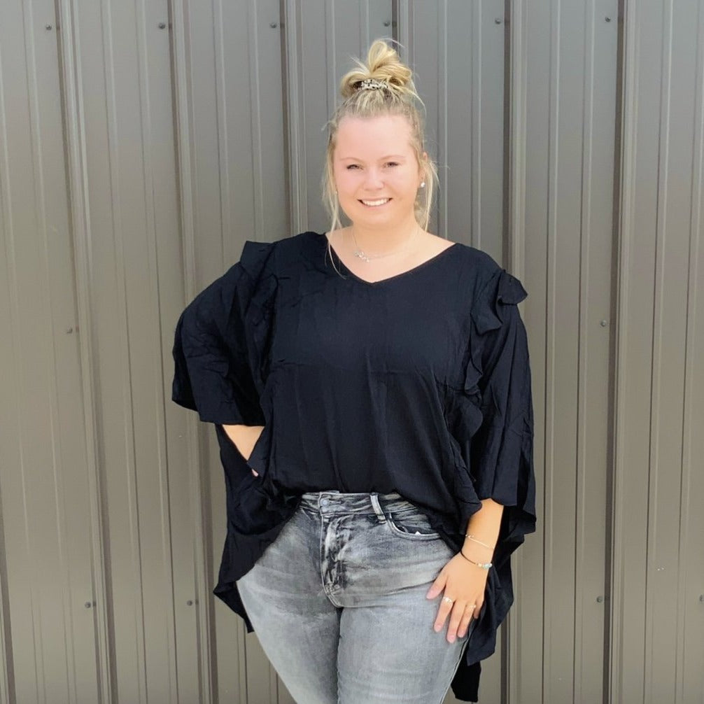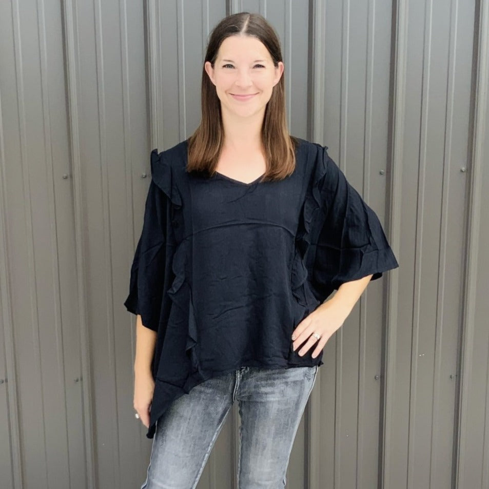This poncho woven top is so comfy and CUTE! We love the ruffle detailing on this top with v-neckline. So chic, trendy, and casual.