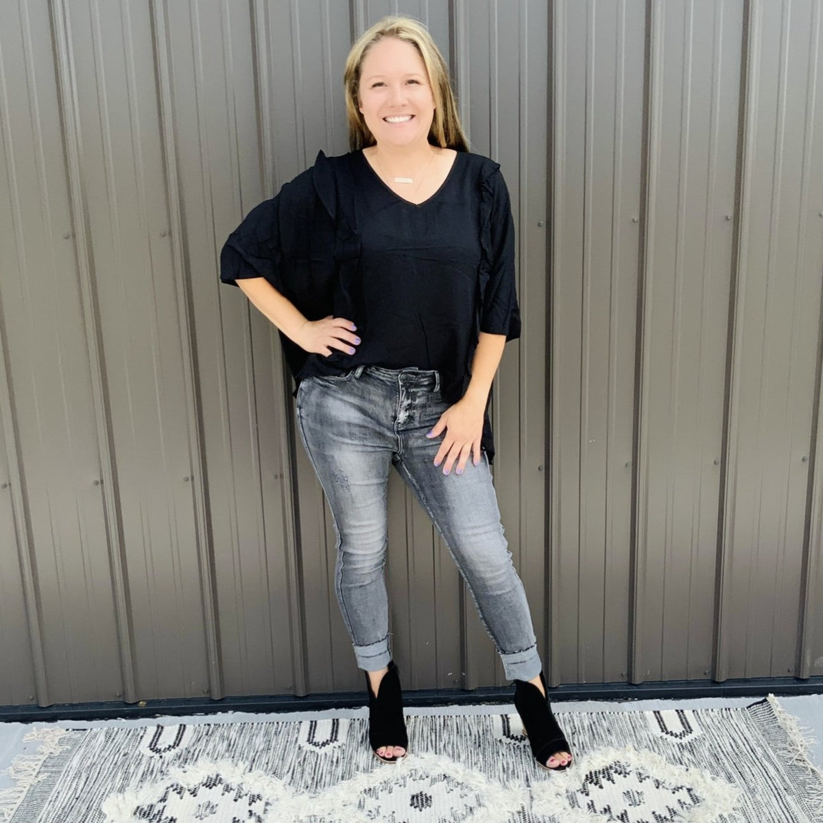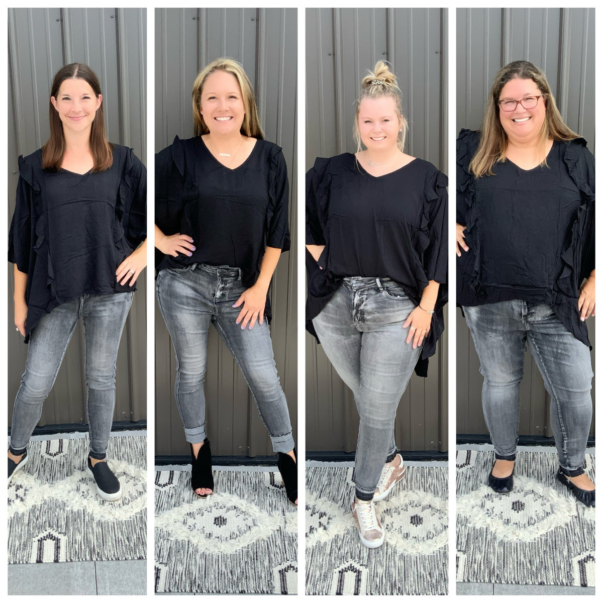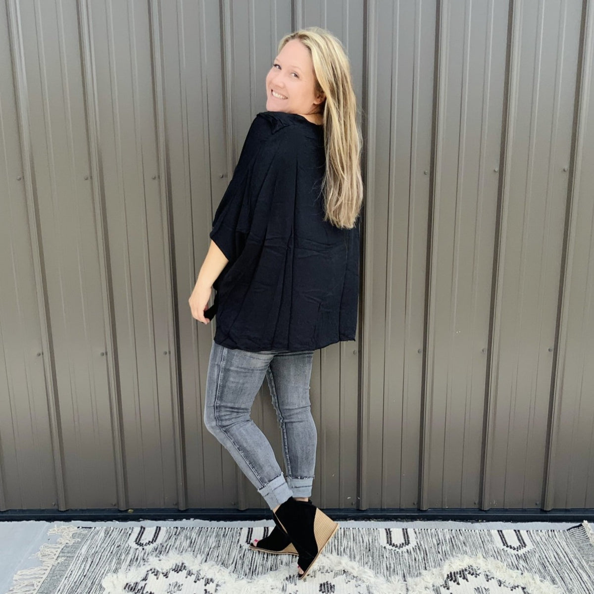 This poncho woven top is so comfy and CUTE! We love the ruffle detailing on this top with v-neckline. So chic, trendy, and casual.