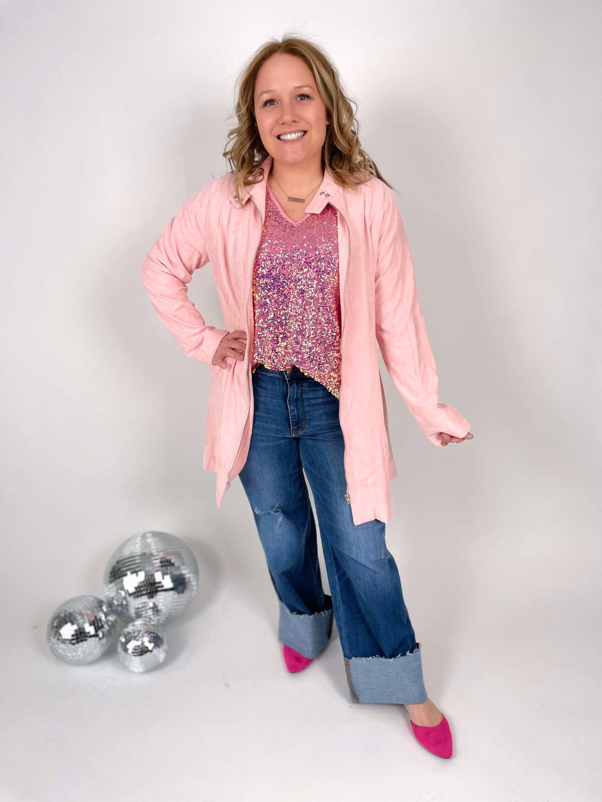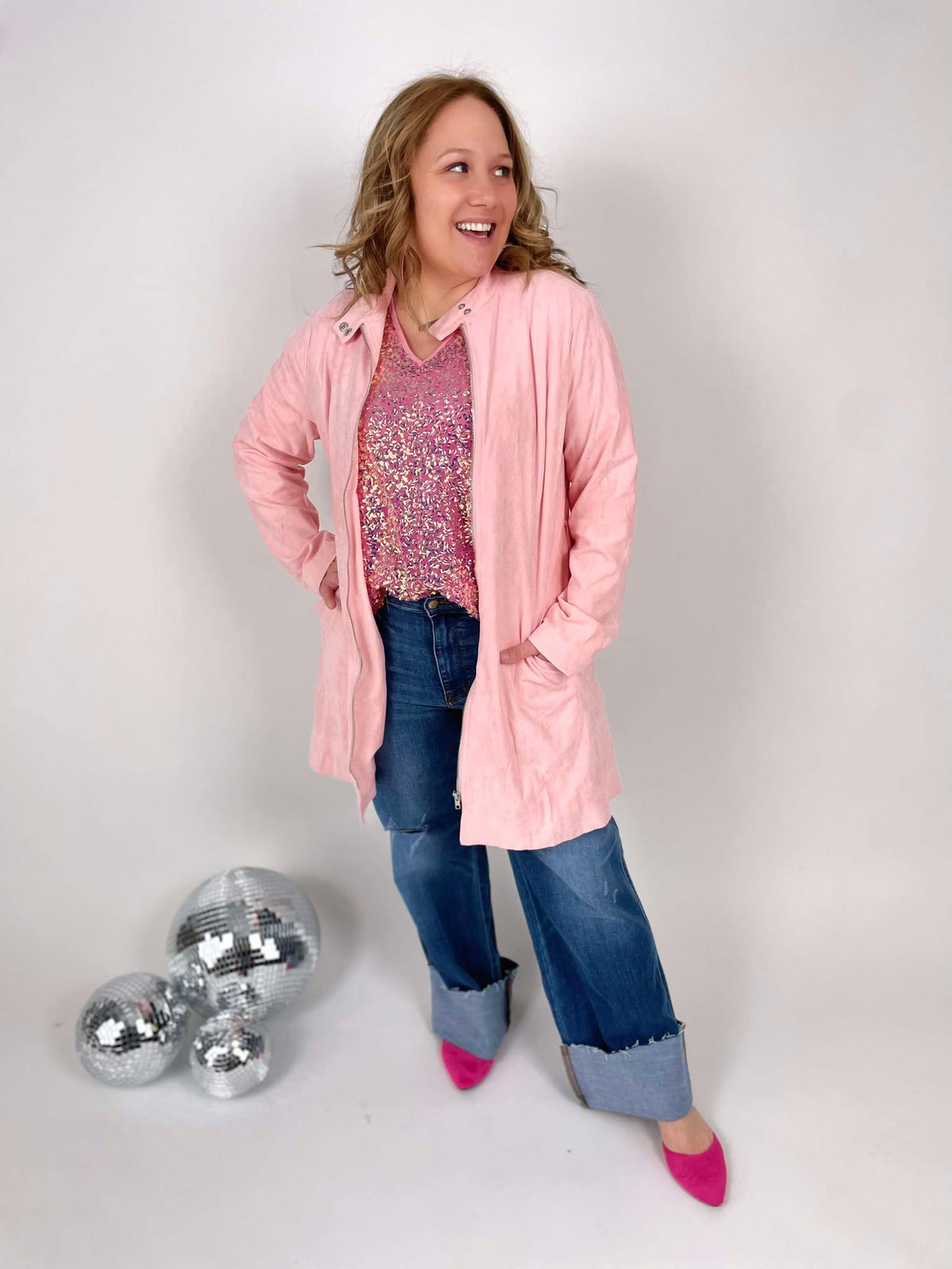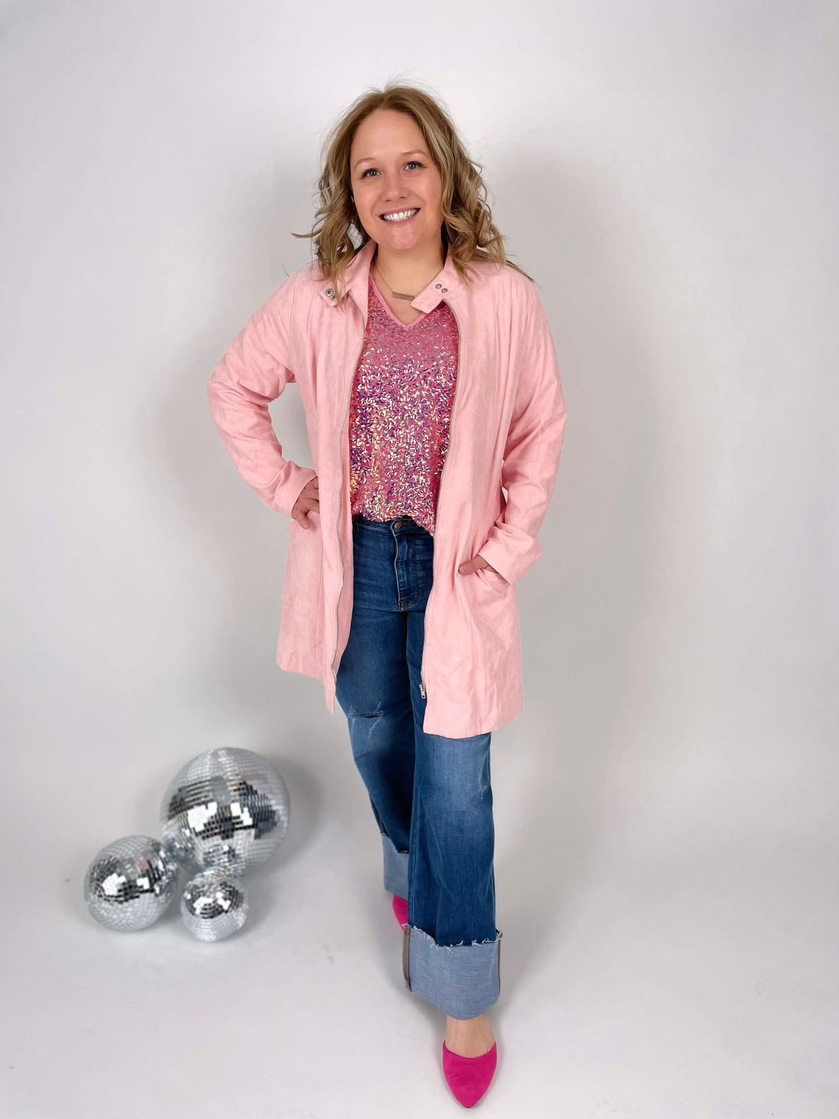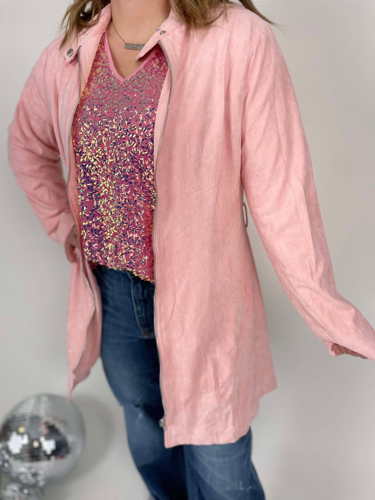 Get ready to turn heads with the Toby Trenchcoat! Made with a luxurious suede feel, this light pink trenchcoat is the ultimate statement piece. Perfect for adding a touch of elegance to any outfit while keeping you warm and stylish. Channel your inner fashionista with the Toby Trenchcoat.